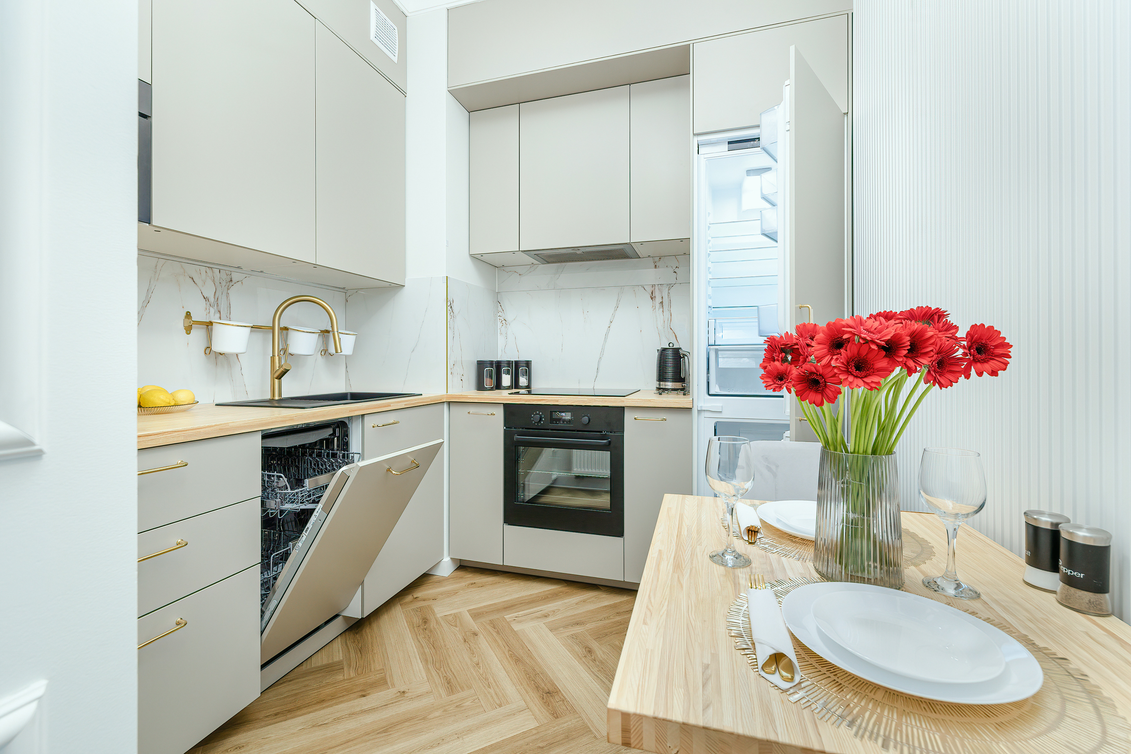 PL 11.12 Wohnung 2-4 Pers.: Mit viel Liebe zum Detail, exklusiv und modern eingerichtete 2 ½-Zimmerwohnung mit 41 qm Wohnfläche, 1. Etage (Aufzug). Stilvoller Wohn/Essraum mit Eckcouch (Schlafsofa 2 Pers.), Couchtisch, Flachbild-SMART-TV, Internet (WLAN). Offene Küche mit Esstisch, Hochwertiger Küchenzeile (4 E-Pl. Induktionskochfeld, Dunstabzug, Gefrierschrank 60 l, Backofen, Mikrowelle, Spülmaschine). Doppelzimmer mit TV. Bad: Du, Wb, WC, Waschmaschine. Balkon mit Sitzmöbeln.