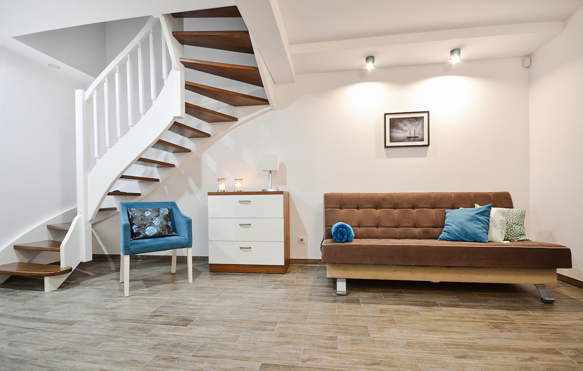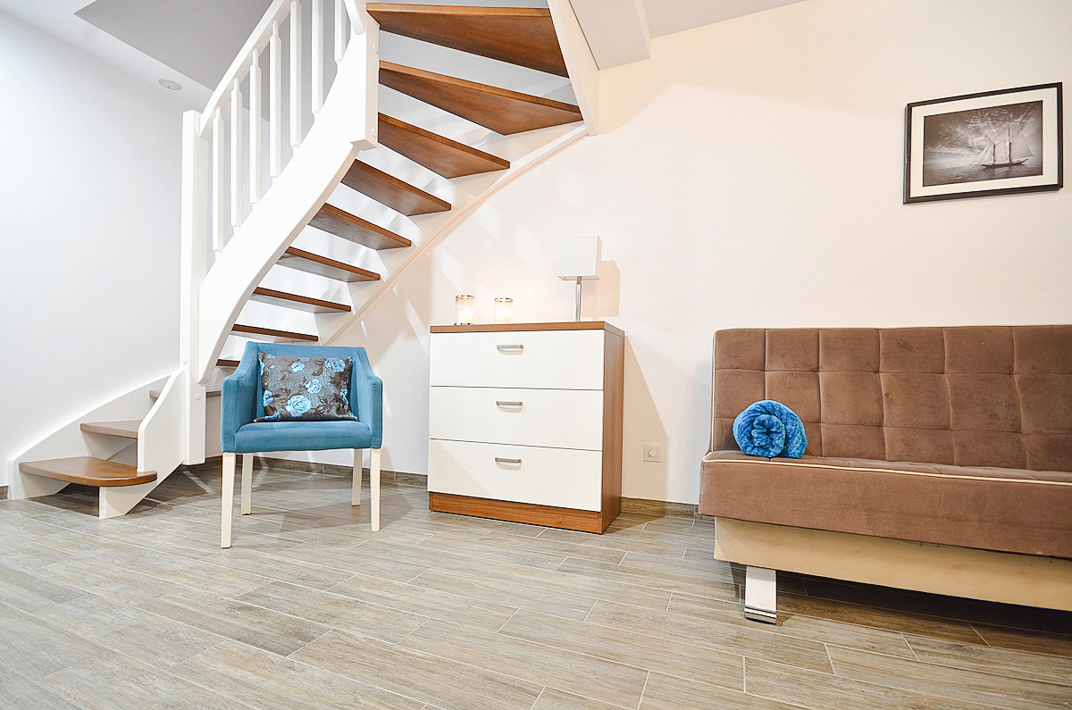PL 70.009 Ferienhaus 2-6 Pers.: Modern und mit Liebe zum Detail eingerichtetes 3-Zimmer-Reihenhaus mit 57 qm Wohnfläche über 2 Etagen. Parterre: Großzügiger, heller Wohn-/Essraum mit Ecksofa (Ausziehcouch 2 Pers.), Flachbild SMART-TV, Internet, Esstisch, Küchenzeile (2 E-Pl. Ceranfeld, Dunstabzug, Mikrowelle, Spülmaschine). Bad: Du, Wb, WC, Waschmaschine. 1. Etage: offenes Doppelzimmer mit Flachbild-TV. 2-Bettzimmer. Terrasse mit Sitzmöbeln.