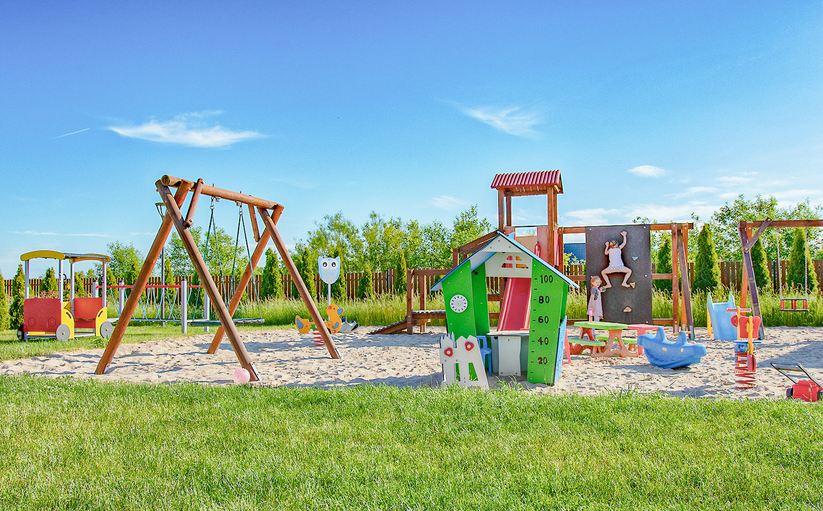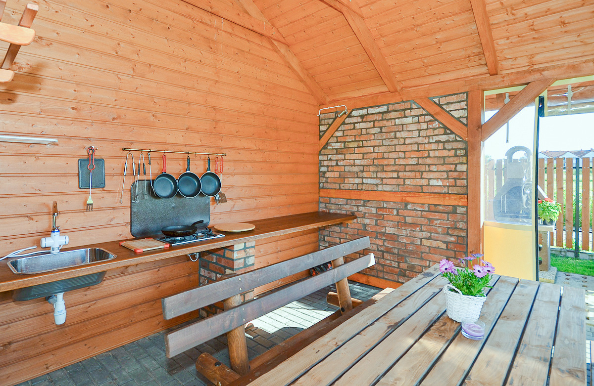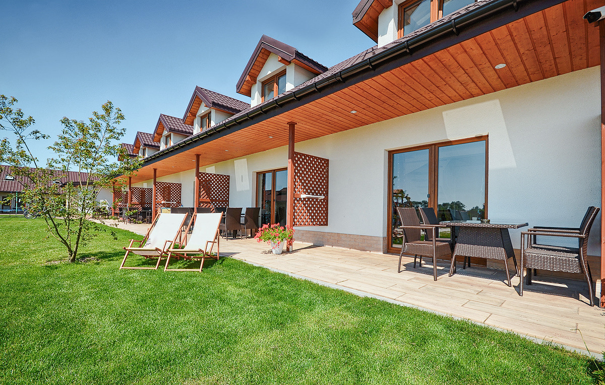 Haus: Schöne, gepflegte Ferienhausanlage auf einem umzäunten Grundstück. 12 Komfortable Reihenhäuser, 2016 neu erbaut, mit geschmackvoller, moderner Einrichtung. Fußbodenheizung, E-Radiatoren. Warmwasser über E-Boiler (80 l). Terrasse, teilweise überdacht, davor kleiner Garten mit Rasenfläche. In der Anlage: Rezeption, Kinderspielplatz mit Sandkasten, Rutschen, Schaukeln, Trampolin, Fußballfeld. Überdachte Außenküche mit Grills zur gemeinschaftlichen Nutzung. Kostenloses Internet über WLan (LTE). Parken auf dem umzäunten Grundstück.