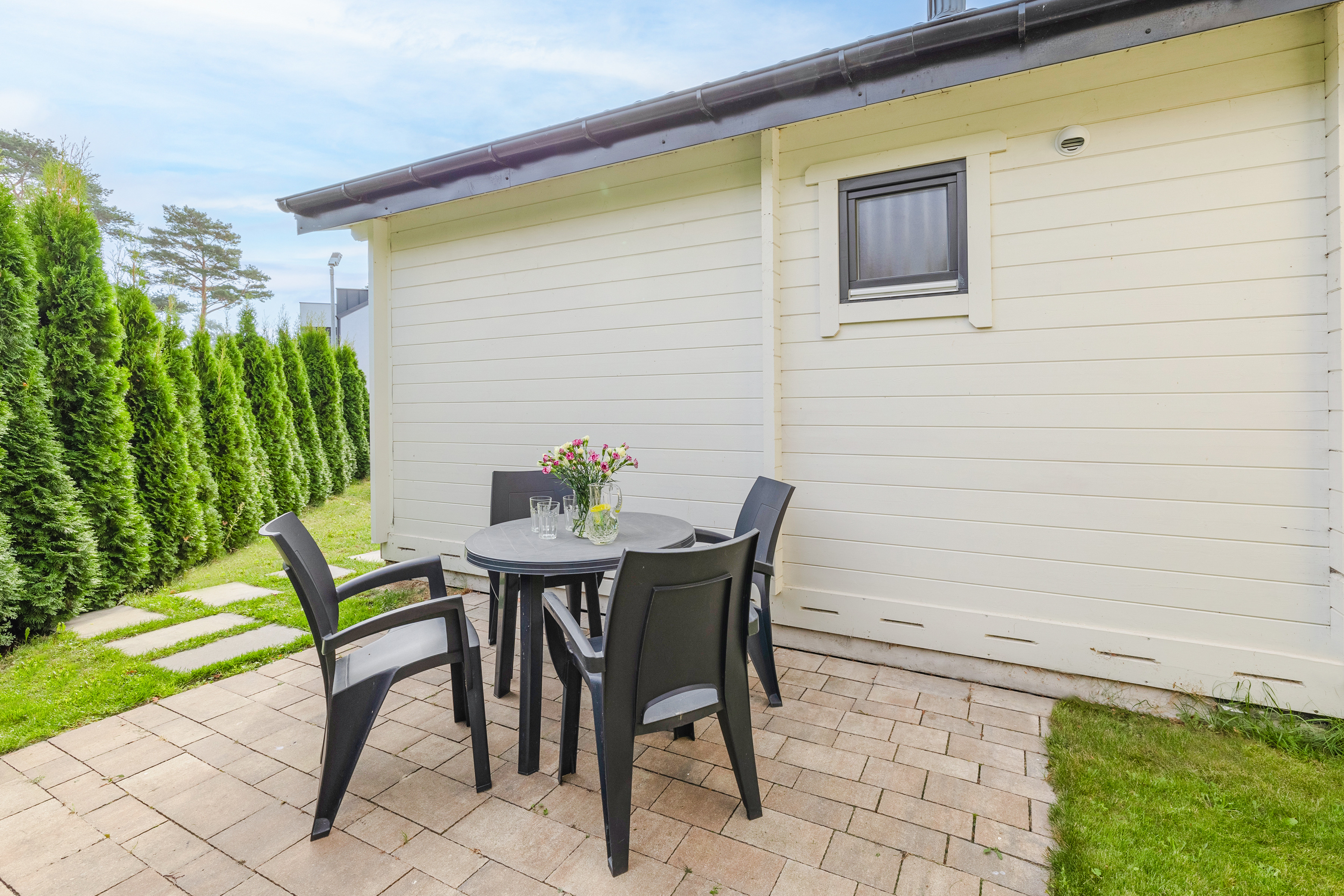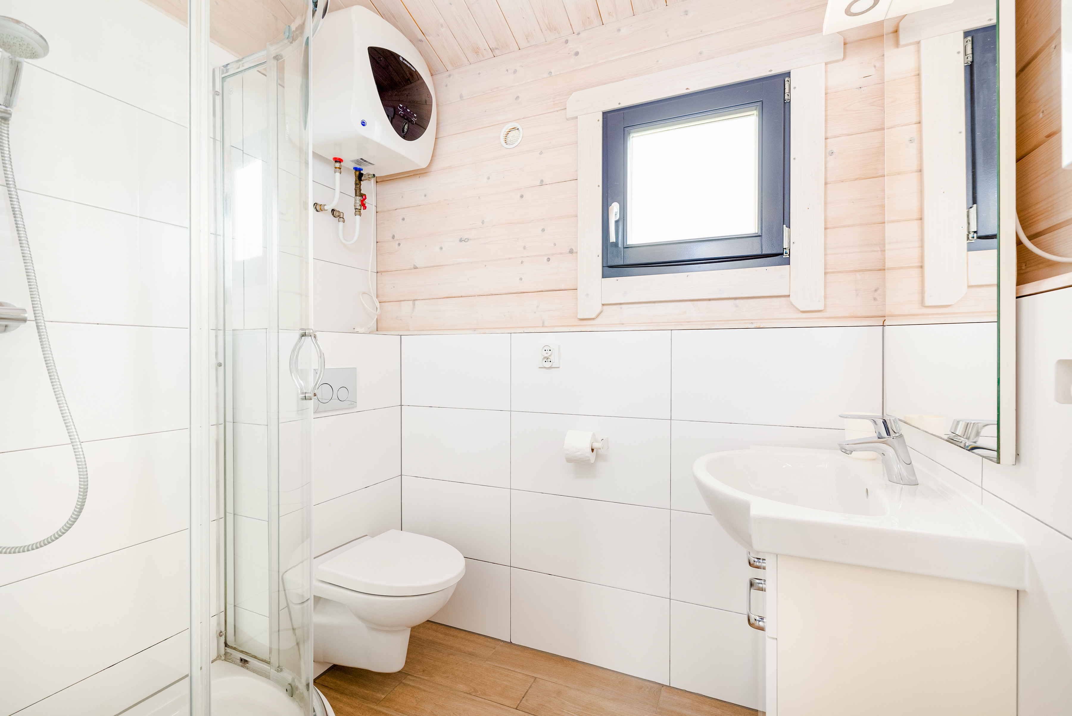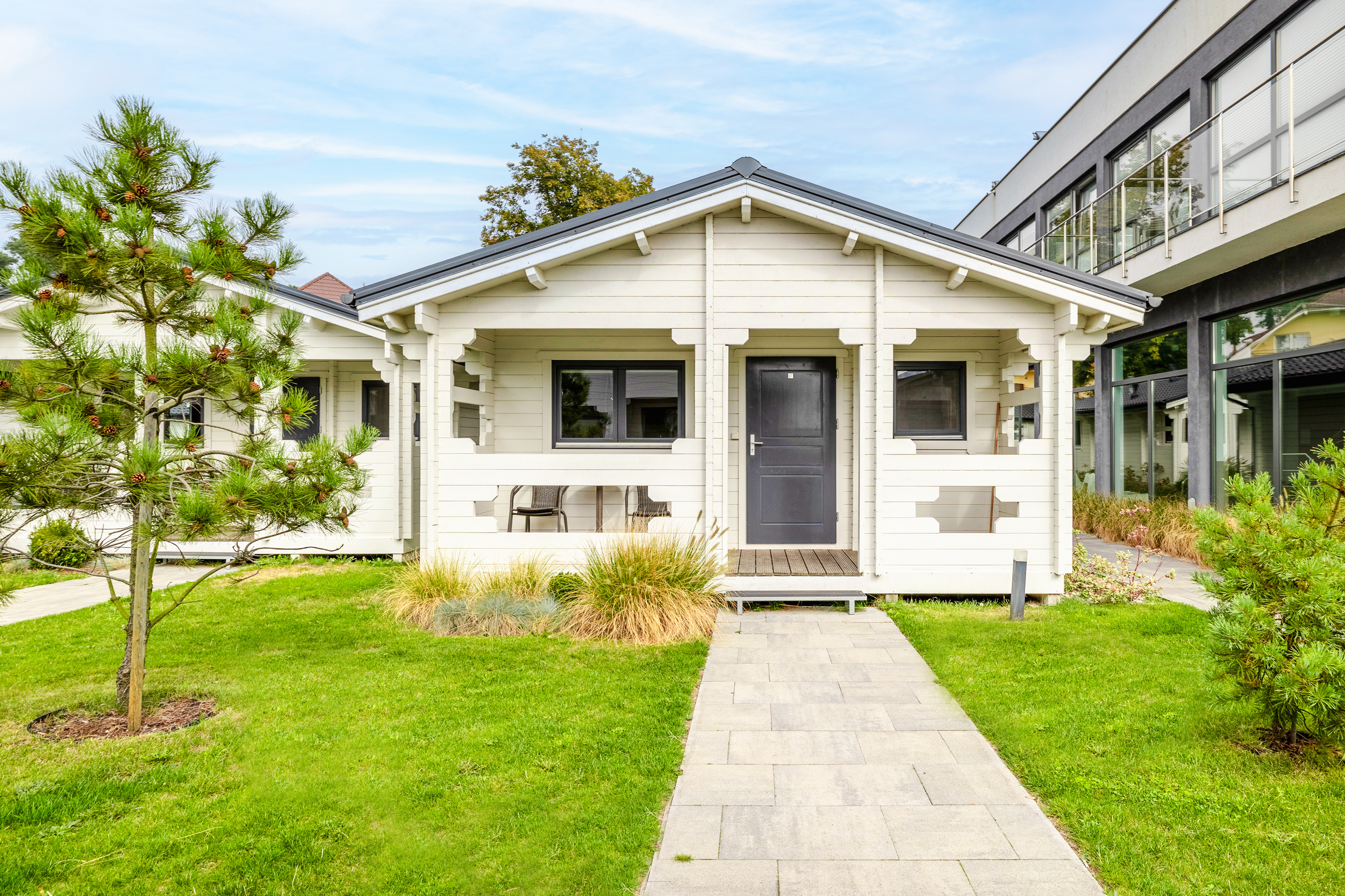 Schöne Ferienhäuser mit freundlicher Einrichtung im Chaletstil. Warmwasser über E-Boiler. Heizung über E-Radiatoren. Kleine Terrasse mit Sitzmöbeln, davor Rasenfläche. 1 Pkw-Stellplatz/Haus auf dem umzäunten Grundstück im Mietpreis inklusiv.