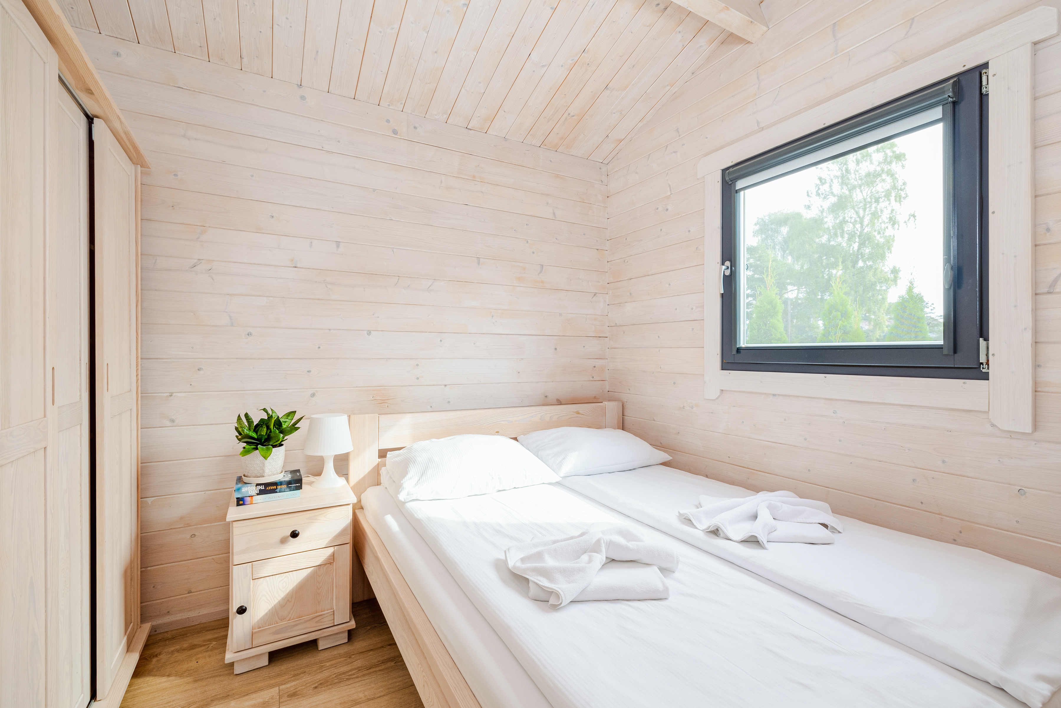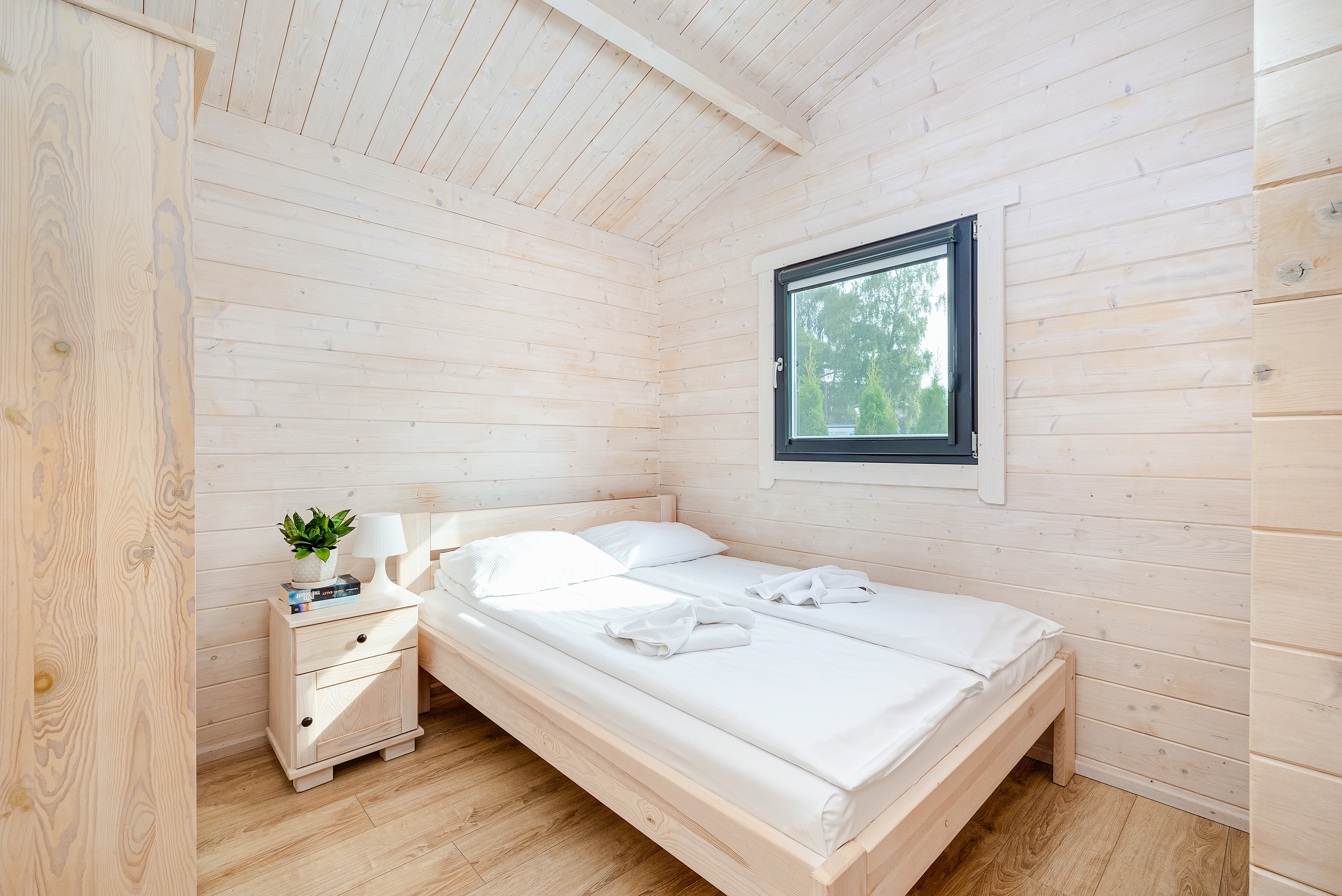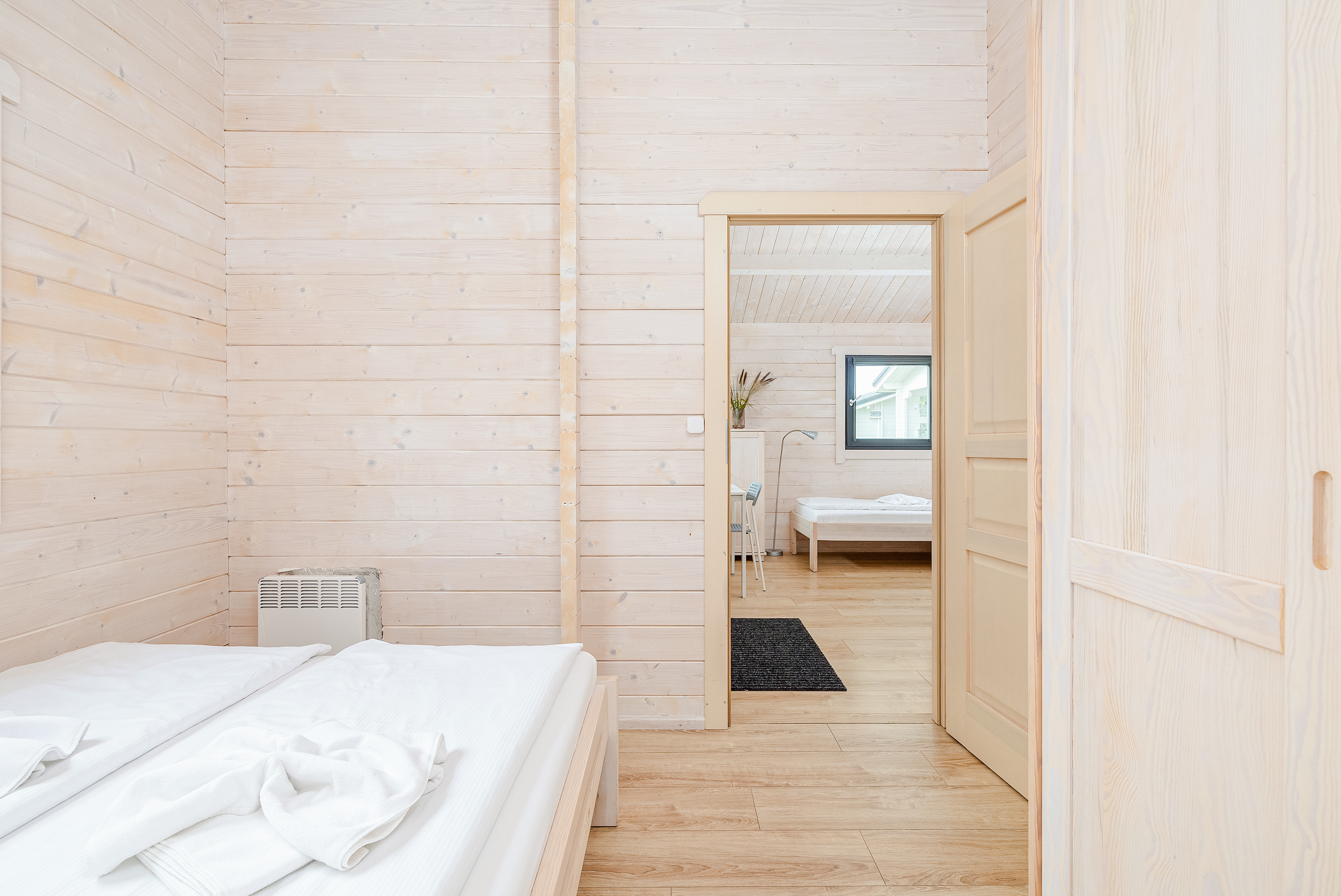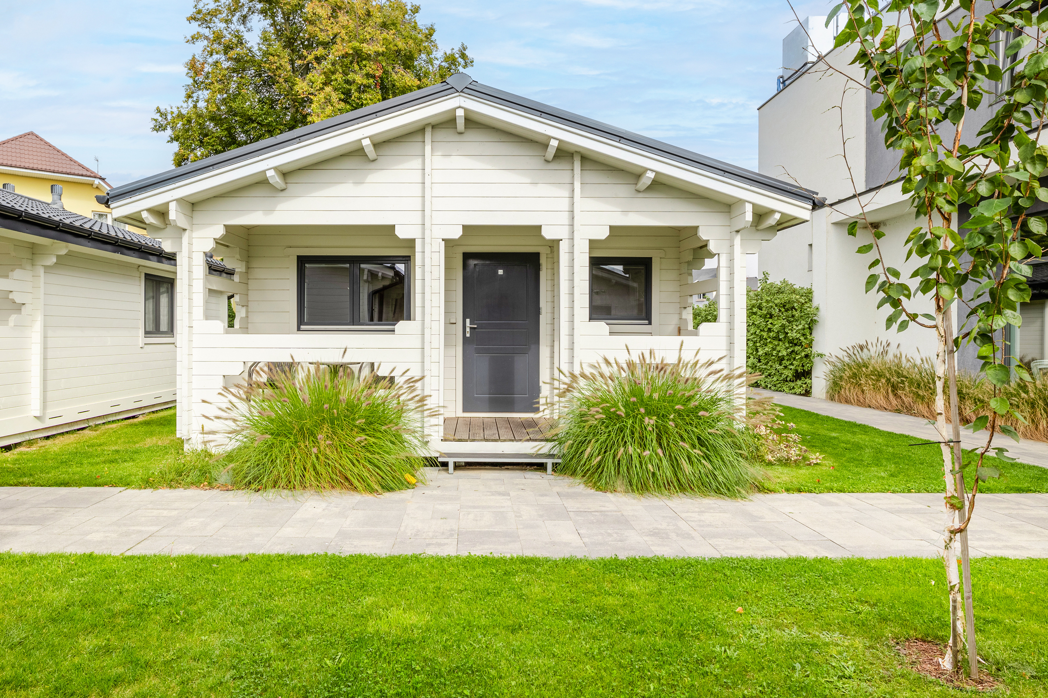 Schöne Ferienhäuser mit freundlicher Einrichtung im Chaletstil. Warmwasser über E-Boiler. Heizung über E-Radiatoren. Kleine Terrasse mit Sitzmöbeln, davor Rasenfläche. 1 Pkw-Stellplatz/Haus auf dem umzäunten Grundstück im Mietpreis inklusiv.