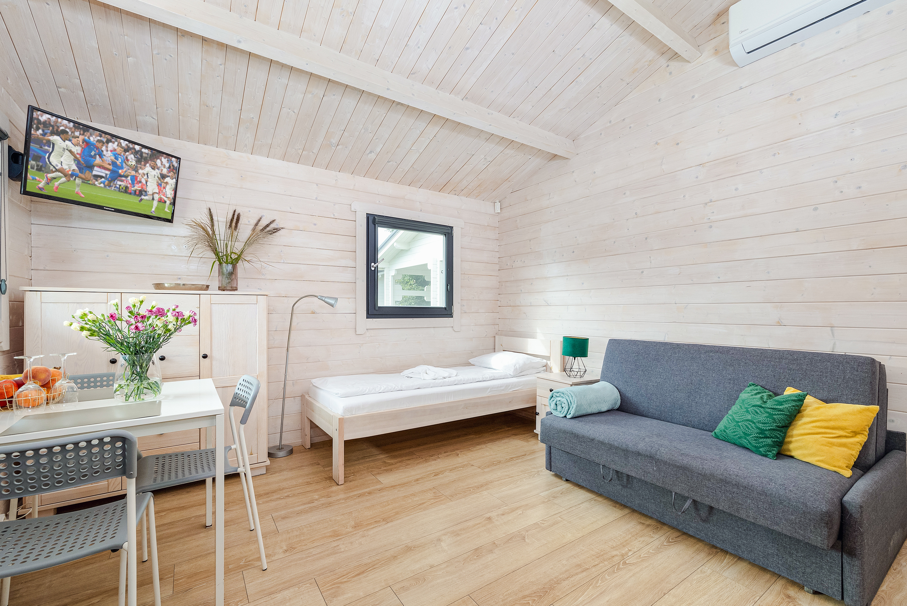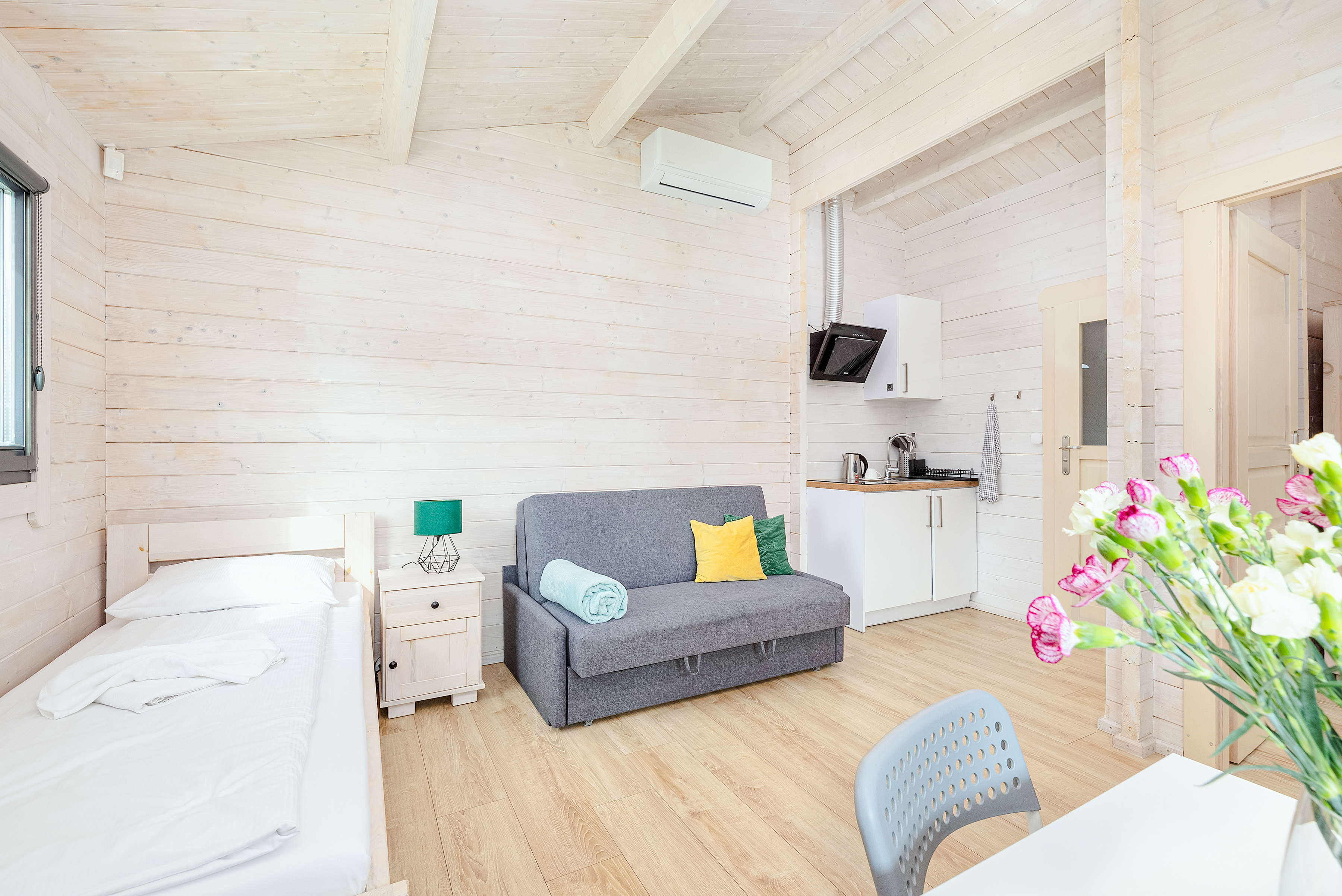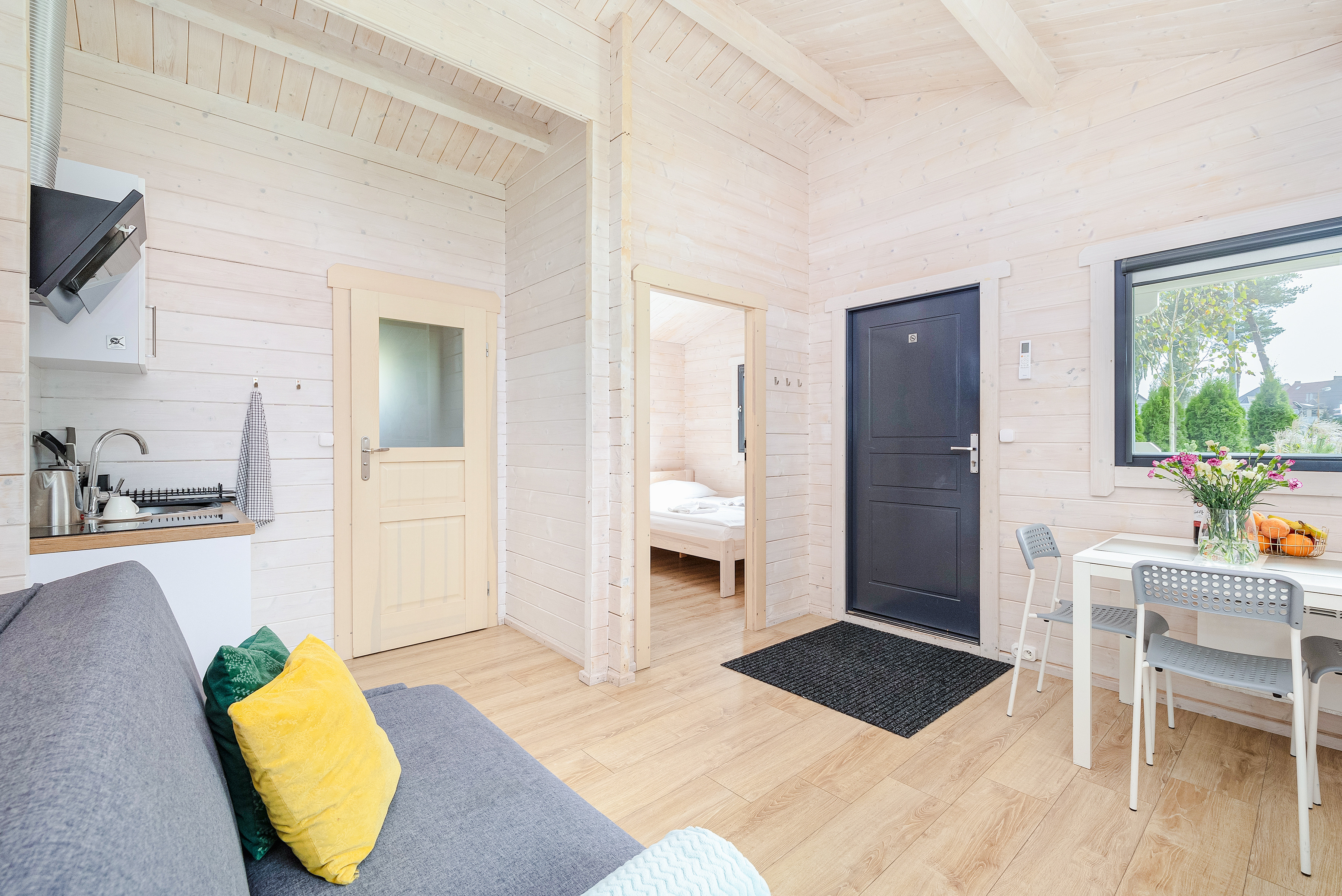 PL 38.11 Ferienhaus 2-3 Pers.: Komfortables 2-Zimmer-Ferienhaus mit 34 qm Wohnfläche. Parterre: Wohn-/Essraum mit Einzelbett, Sofa (Ausziehcouch 2 Pers), Flachbild-TV mit deutschen Programmen, Klimaanlage, Esstisch, Küchenzeile (2 Pl Ceran). Bad/WC. Doppelzimmer mit franz. Bett. Terrasse mit Sitzmöbeln.