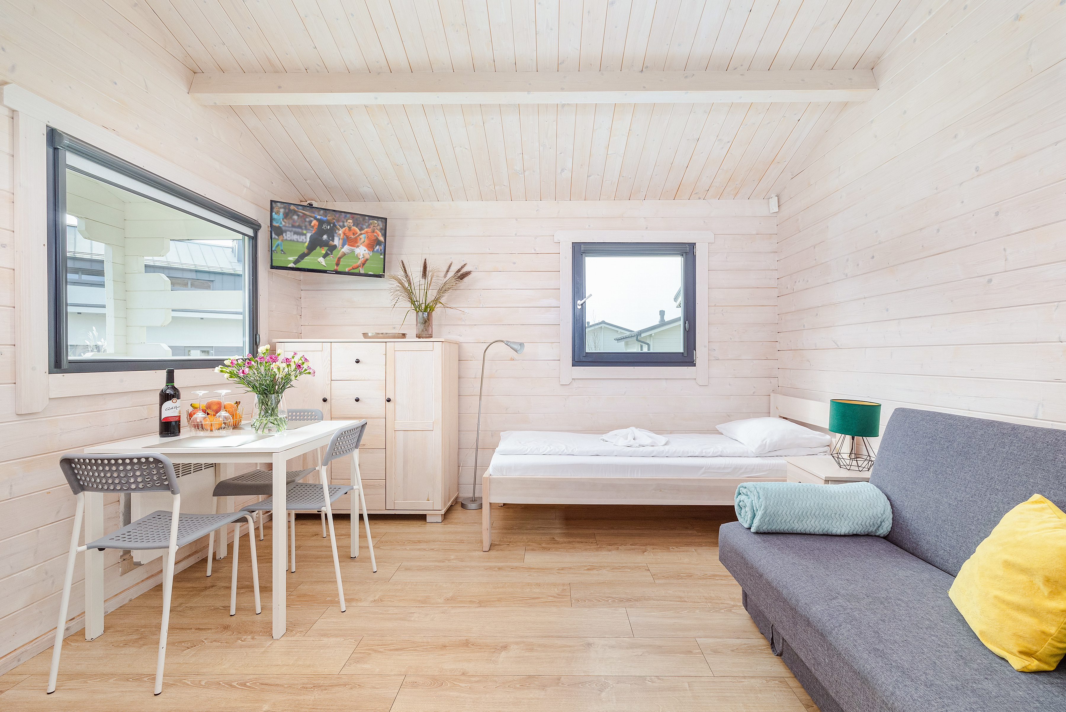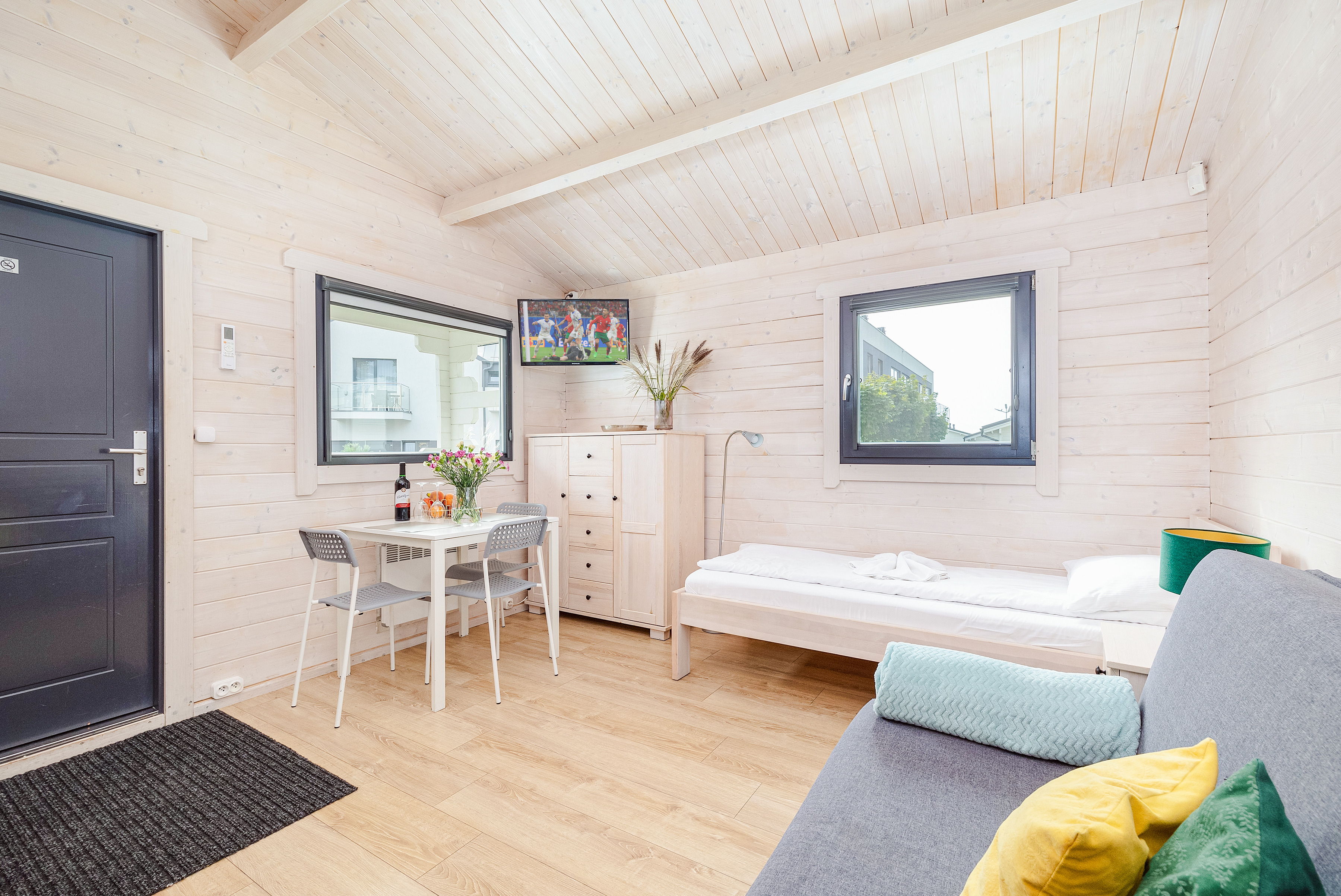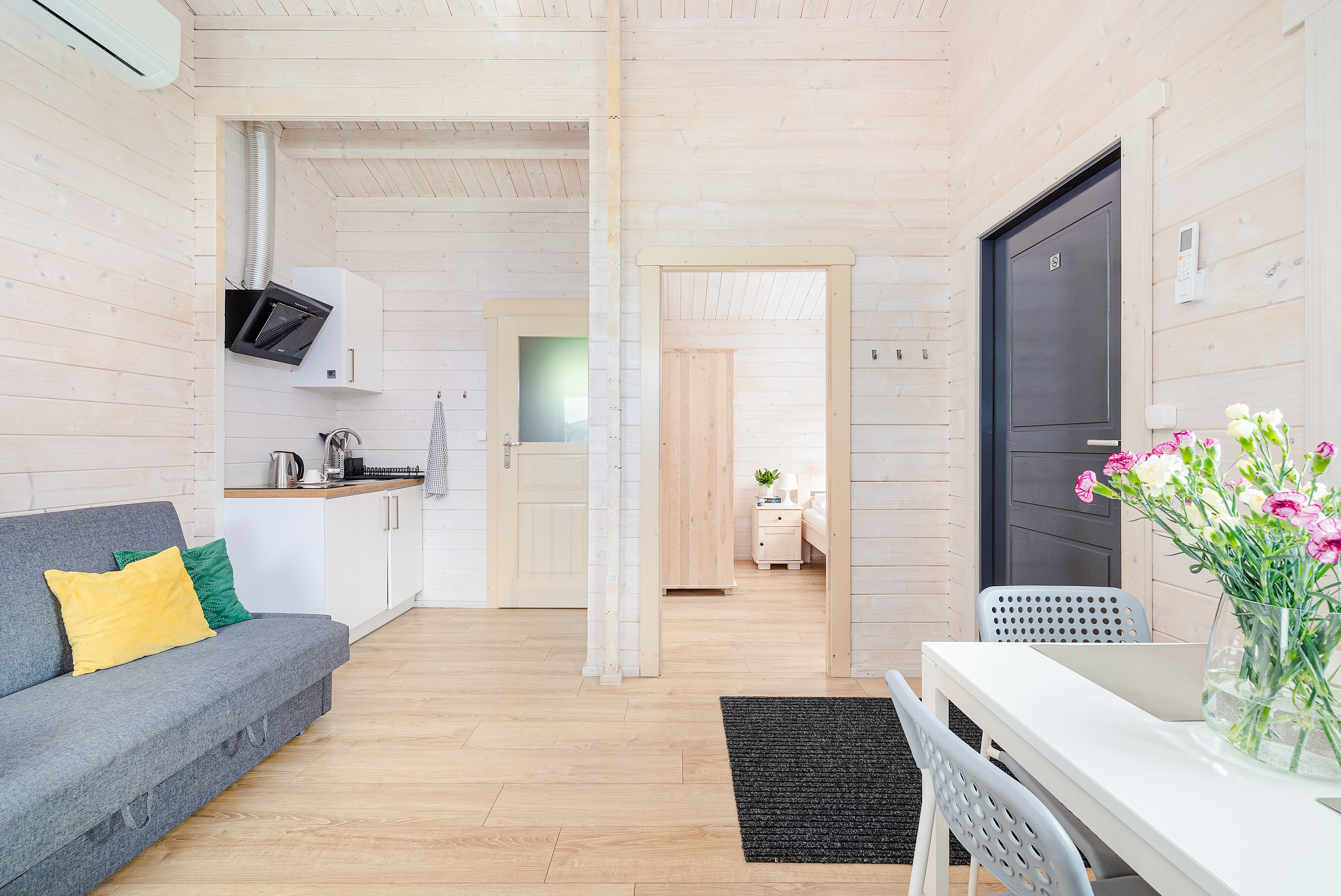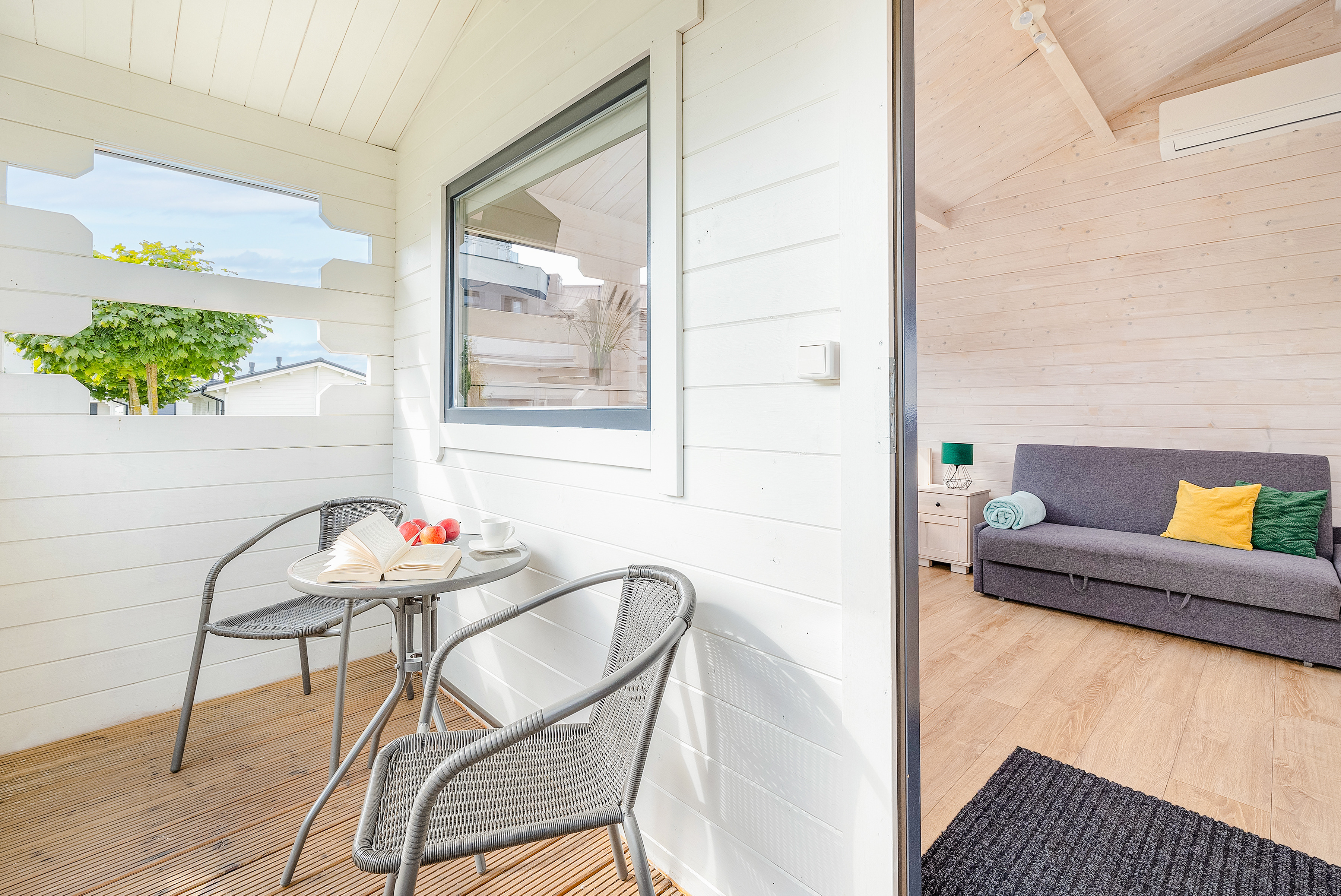 PL 38.11 Ferienhaus 2-3 Pers.: Komfortables 2-Zimmer-Ferienhaus mit 34 qm Wohnfläche. Parterre: Wohn-/Essraum mit Einzelbett, Sofa (Ausziehcouch 2 Pers), Flachbild-TV mit deutschen Programmen, Klimaanlage, Esstisch, Küchenzeile (2 Pl Ceran). Bad/WC. Doppelzimmer mit franz. Bett. Terrasse mit Sitzmöbeln.