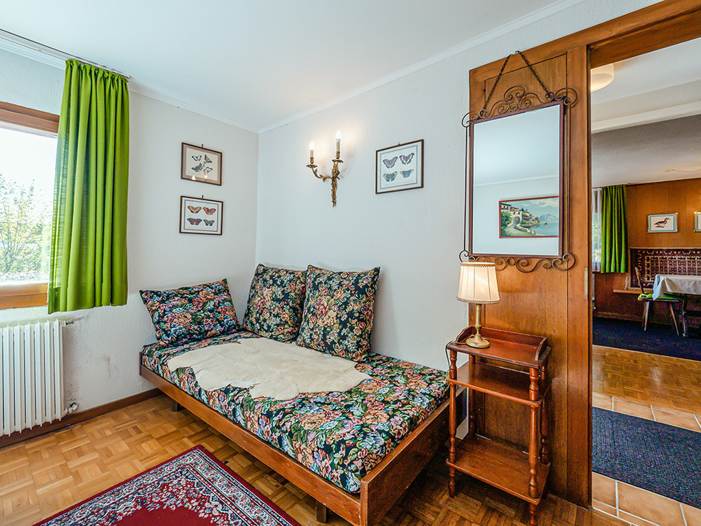 Haus: Schönes Chalet mit Schwimmbad und Sauna im Nebengebäude. 2 Ferienwohnungen mit separaten Zugängen, die einzeln oder gemeinsam vermietet werden. Rustikal-gemütliche Chalet-Atmosphäre mit Holzvertäfelungen in vielen Räumen. Bereits ältere, aber sehr gepflegte Einrichtung. Internetzugang über W-Lan. Zentralheizung. Nichtraucherhaus. Balkon oder Terrasse (Sitzmöbel). Tiefgarage mit 1 Pkw-Stellplatz pro Fewo (max. 1,95 m Höhe), weitere Außenplätze je nach Verfügbarkeit. Im Nachbarhaus: großes Schwimmbad (10 x 4,50 Meter, 24°C, kostenfrei nutzbar) mit Ruheliegen vor großen Panoramafenstern, Sauna (Gebühr), Duschen, WC. Waschmaschine. Hinweise: Betriebszeiten Schwimmbad nur von Mitte Juli bis Ende August. Gemeinschaftsnutzung mit zwei weiteren Fewos im Nachbarchalet. Geringe Schallisolierung zwischen der oberen und der unteren Wohnung.