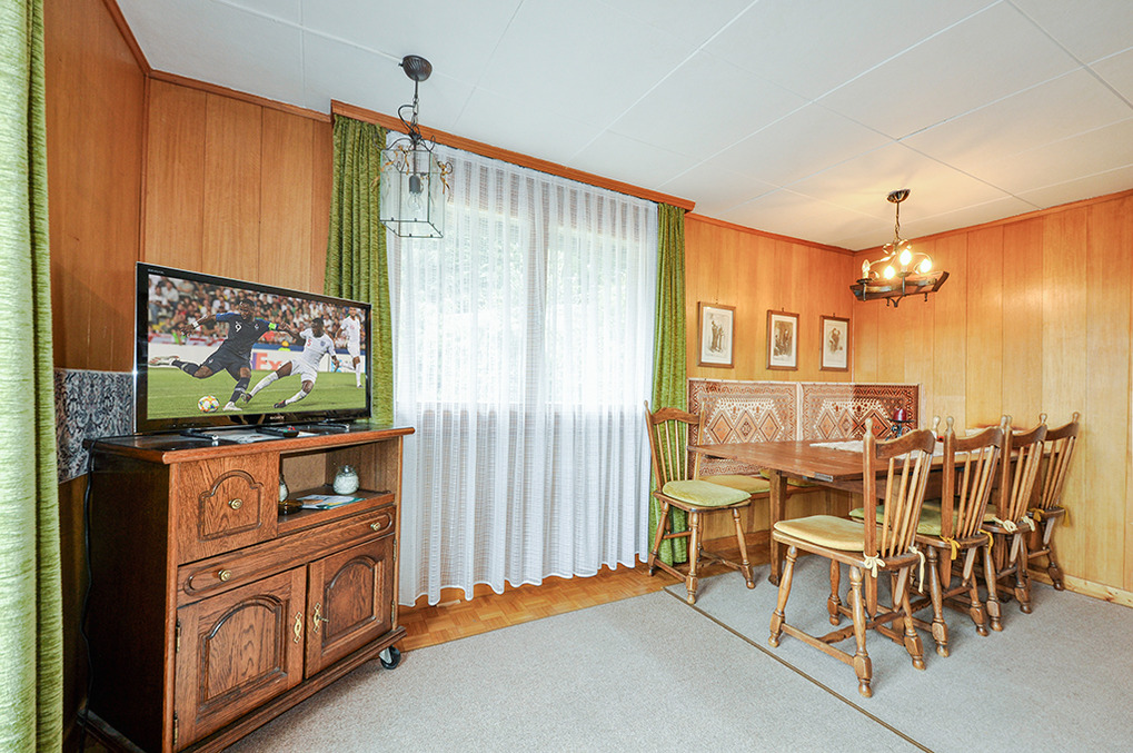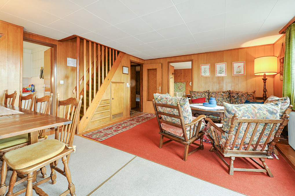 Haus: Schönes Chalet mit Schwimmbad und Sauna im Nebengebäude. 2 Ferienwohnungen mit separaten Zugängen, die einzeln oder gemeinsam vermietet werden. Rustikal-gemütliche Chalet-Atmosphäre mit Holzvertäfelungen in vielen Räumen. Bereits ältere, aber sehr gepflegte Einrichtung. Internetzugang über W-Lan. Zentralheizung. Nichtraucherhaus. Balkon oder Terrasse (Sitzmöbel). Tiefgarage mit 1 Pkw-Stellplatz pro Fewo (max. 1,95 m Höhe), weitere Außenplätze je nach Verfügbarkeit. Im Nachbarhaus: großes Schwimmbad (10 x 4,50 Meter, 24°C, kostenfrei nutzbar) mit Ruheliegen vor großen Panoramafenstern, Sauna (Gebühr), Duschen, WC. Waschmaschine. Hinweise: Betriebszeiten Schwimmbad nur von Mitte Juli bis Ende August. Gemeinschaftsnutzung mit zwei weiteren Fewos im Nachbarchalet. Geringe Schallisolierung zwischen der oberen und der unteren Wohnung.