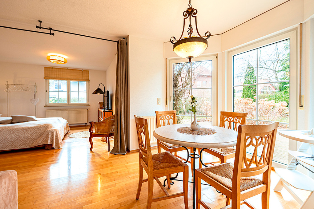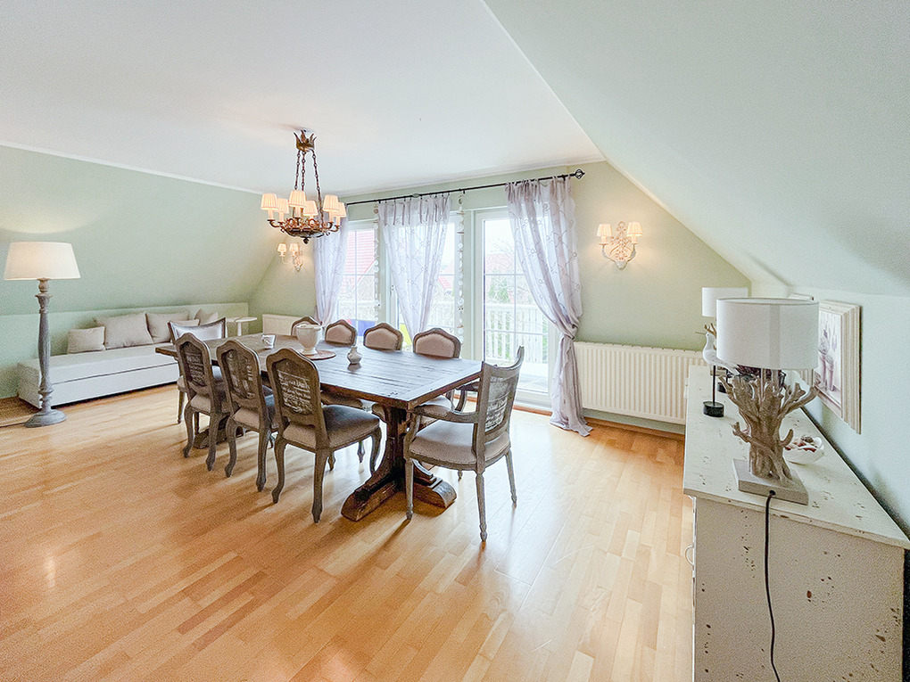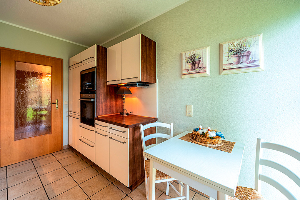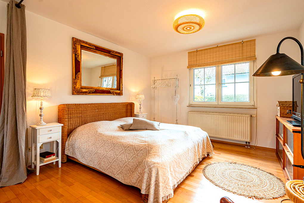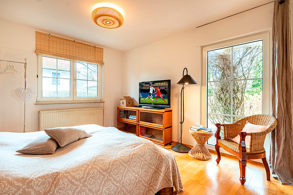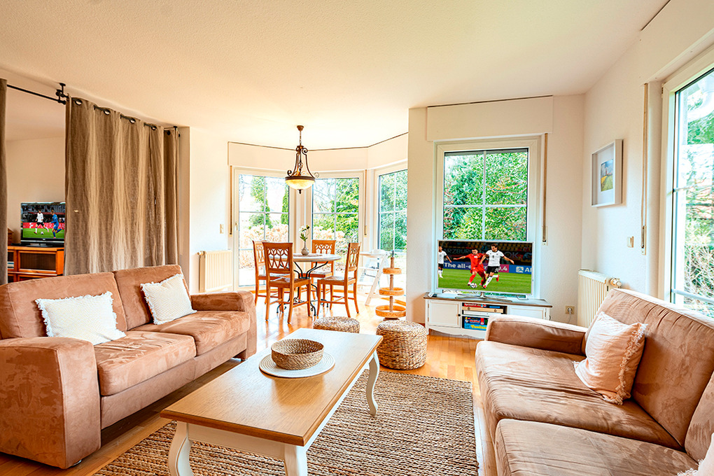 Haus: Schönes Ferienhaus auf einem 600 qm großen Gartengrundstück. Zwei Wohneinheiten, die zusammen vermietet werden. Es ergibt sich ein 5 ½ Zimmer-Haus mit 150 qm zum Alleinbewohnen. Moderne Einrichtung im Landhausstil. Kostenloser Internetzugang über W-Lan. Nichtraucherhaus. Zentralheizung. Liebevoll angelegter Blumengarten mit Gartenteich, Sitzecke und schönem Baumbestand. 2 Garagenstellplätze.
