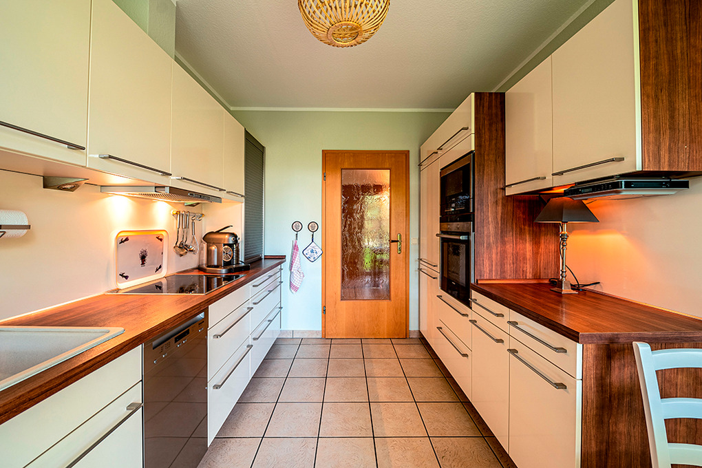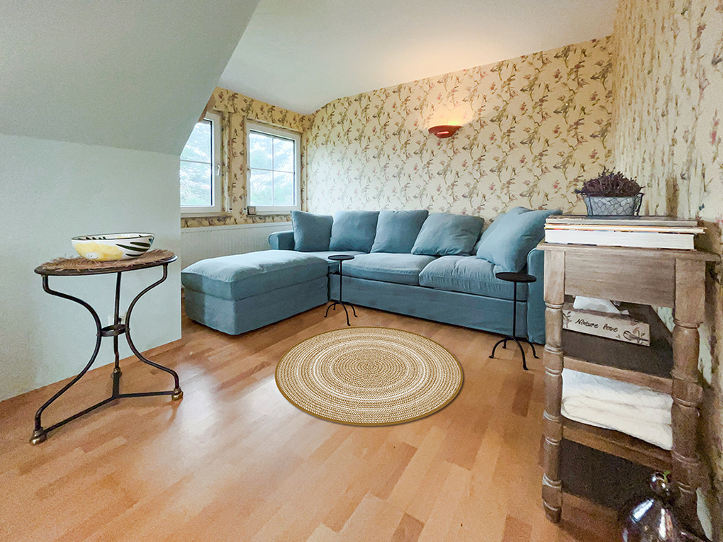 D 120.15 Ferienhaus 2-9 Pers.: Großzügiges 5 1/2-Zimmerhaus mit 150 qm Wohnfläche über 2 Etagen. Parterre: Geschmackvoll eingerichteter Wohn-/Essraum mit Sitzgarnitur, Sat-TV, Radio/CD, Esstisch, durch Vorhang abgetrennter Schlafbereich mit Doppelbett, Sat-TV. Sehr gut ausgestattete Küche mit Backofen, Spülmaschine, Mikrowelle, kleiner Esstisch. Doppelzimmer mit Kinderbett. Schönes Bad: Bw, Du, Wb, WC. Terrasse mit Sitzmöbeln. Separate Fewo für 2-3 Personen in der 1. Etage (leichte Schrägen) mit eigenem Eingang: Ansprechend eingerichteter Wohn-/Essraum mit Sitzgarnitur, Sat-TV, Radio/CD, Esstisch, moderne Pantryküche (Mikrowelle, Spülmaschine). 3-Bettzimmer mit Doppelbett, Einzelbett (90 x 180cm). Schönes Bad: Bw, Du, Wb, WC. Zusätzlicher, gemütlicher Aufenthaltsraum mit Sofa (Ausziehcouch für 2 Pers.), großem Esstisch für 8-9 Personen. Großzügige Dachterrasse (55 qm) mit Sitzmöbeln, Sonnenliegen, herrlichem Blick.