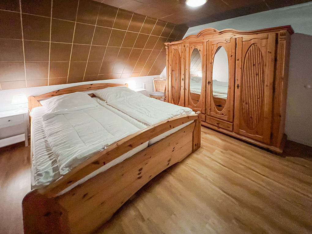 D 67.108 Ferienhaus 1-6 Pers.: Komfortables 4 ½ -Zimmerhaus mit 123 qm Wohnfläche über 2 Etagen. Parterre: Heller Wohn-/Essraum mit Couchgarnitur, Kaminofen, Smart-TV (Sat-TV), gemütlicher Essbereich mit Esstisch. Separate Küche mit kleinem Esstisch, gut ausgestatteter Einbauküche mit Backofen, Mikrowelle, Spülmaschine. Kleines Bad: Wb, WC. 1. Etage: Großes Doppelzimmer. Weiteres Doppelzimmer. Kleines Doppelzimmer mit französischem Bett (140 x 200 cm). Bad: Du, Bw, Wb, WC.