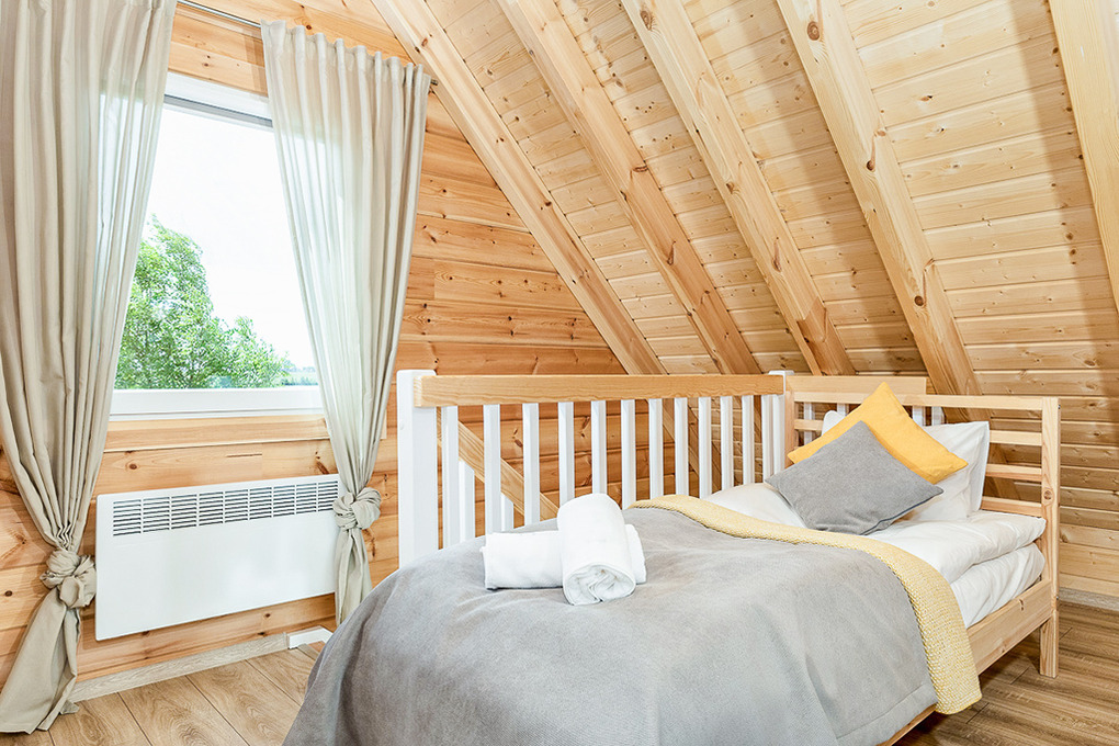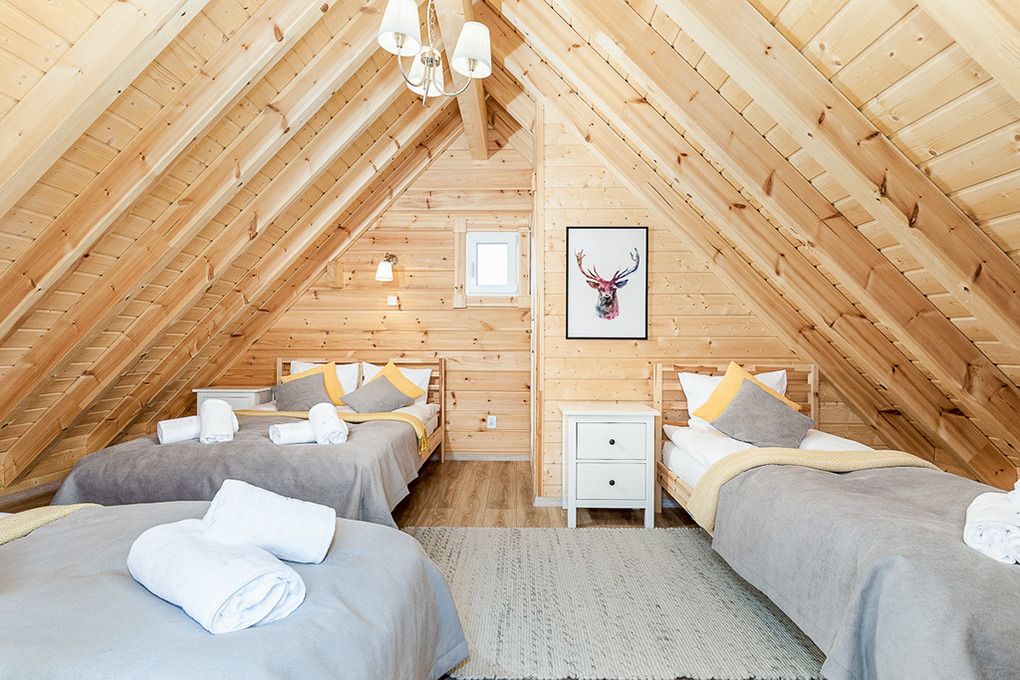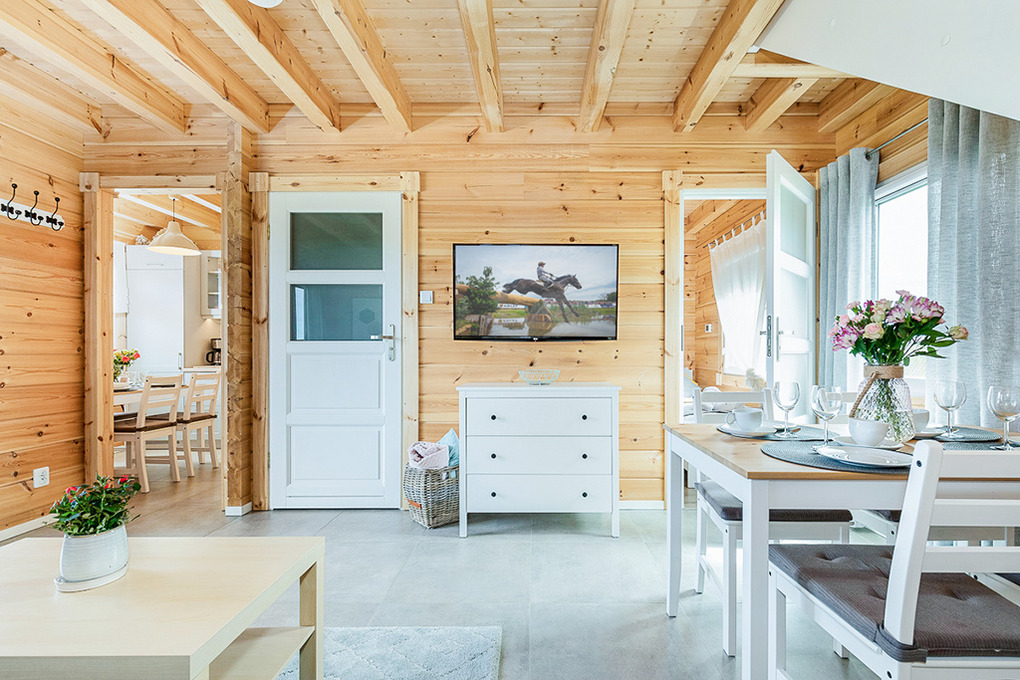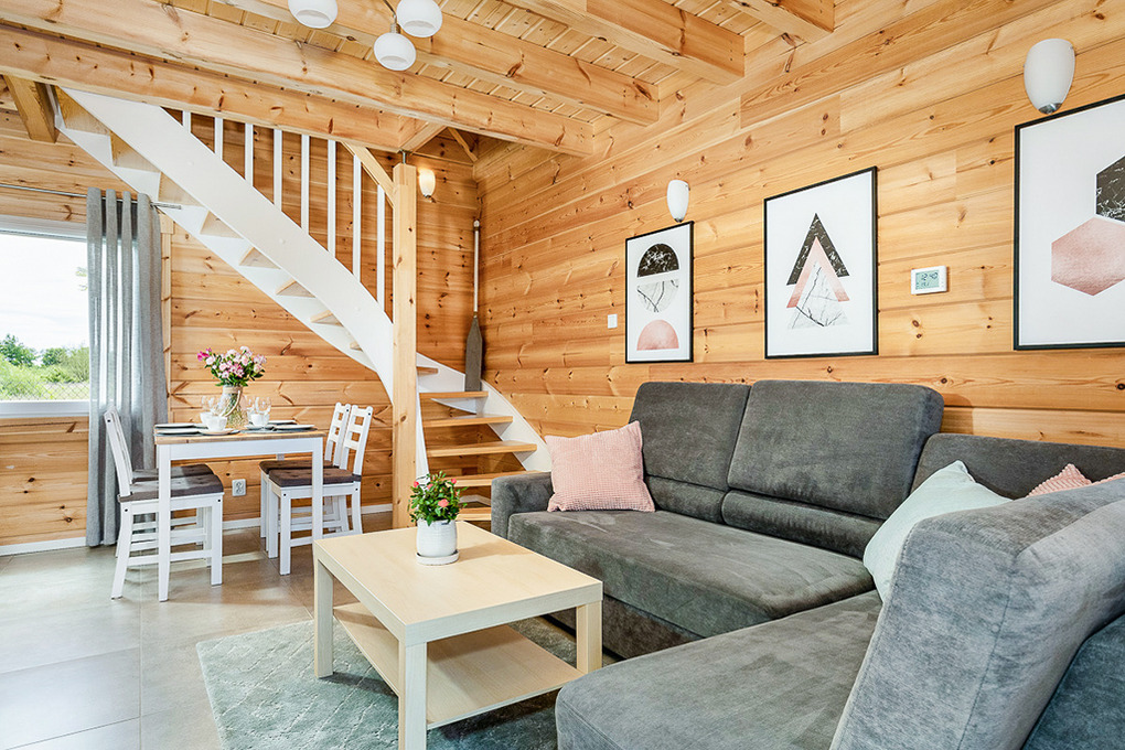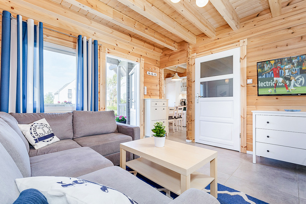 PL 55.36 Ferienhaus 1-6 Pers.: Komfortables 3-Zimmerhaus mit ca. 76 qm Wohnfläche über 2 Etagen. Parterre: Wohn-/Essraum mit Ecksofa (Ausziehcouch 2 Pers.), Smart-TV mit deutschen Programmen, großem Esstisch. Separate Küche mit Esstisch und moderner Küchenzeile (4 Induktionsplatten, Abzugshaube, Tiefkühltruhe 60 l). Bad: Du, Wb, WC, Waschmaschine. Doppelzimmer. Holztreppe in die 1. Etage: Offenes 4-Bettzimmer mit zwei Einzelbetten und franz. Doppelbett. Kleines Bad mit Wb, WC. Terrasse mit Sitzmöbeln, Grill.