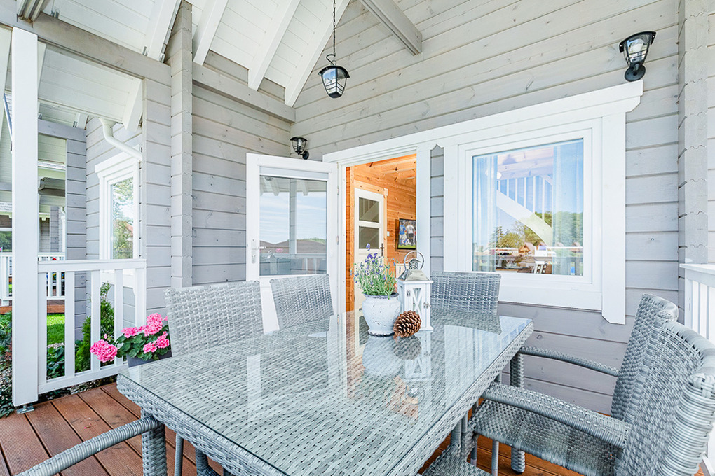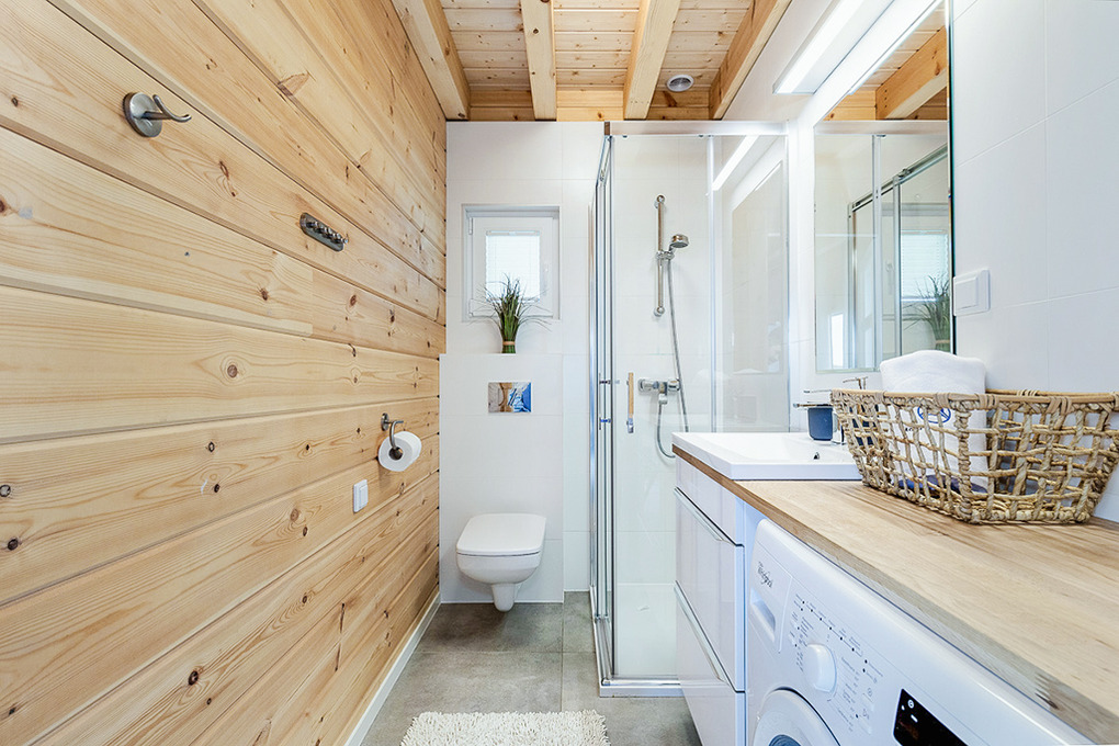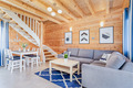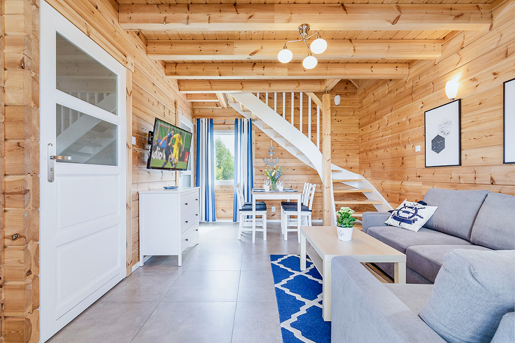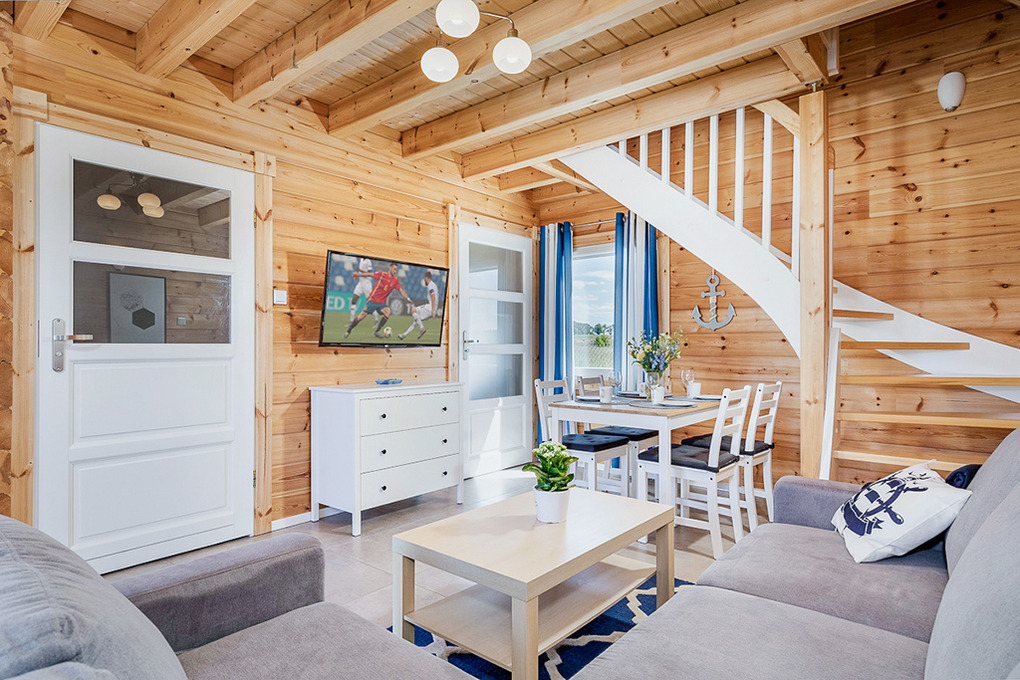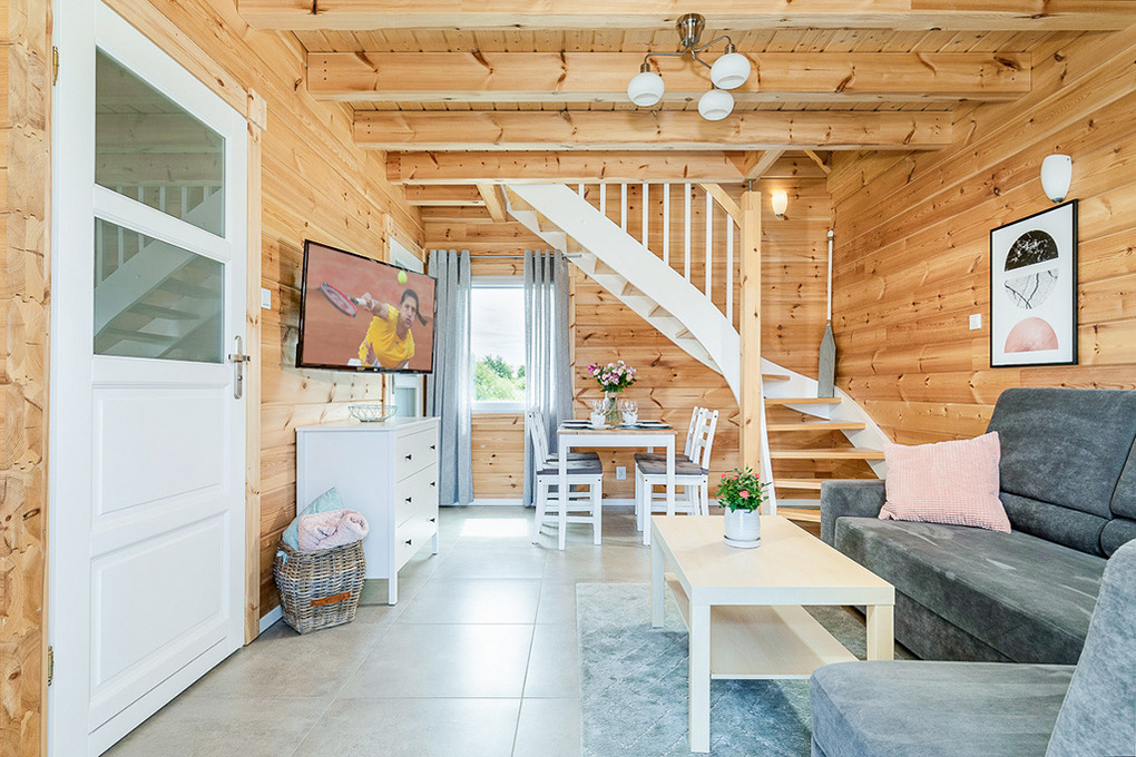 PL 55.36 Ferienhaus 1-6 Pers.: Komfortables 3-Zimmerhaus mit ca. 76 qm Wohnfläche über 2 Etagen. Parterre: Wohn-/Essraum mit Ecksofa (Ausziehcouch 2 Pers.), Smart-TV mit deutschen Programmen, großem Esstisch. Separate Küche mit Esstisch und moderner Küchenzeile (4 Induktionsplatten, Abzugshaube, Tiefkühltruhe 60 l). Bad: Du, Wb, WC, Waschmaschine. Doppelzimmer. Holztreppe in die 1. Etage: Offenes 4-Bettzimmer mit zwei Einzelbetten und franz. Doppelbett. Kleines Bad mit Wb, WC. Terrasse mit Sitzmöbeln, Grill.