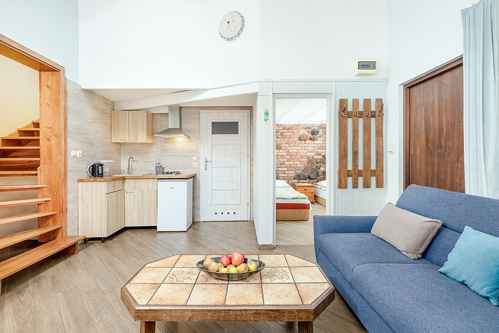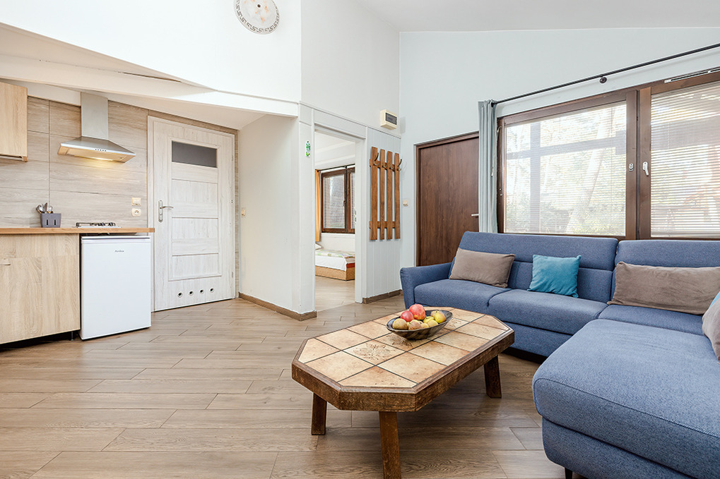 PL 30.45 Ferienhaus 1- 6 Pers.: 3-Zimmer-Haushälfte mit 53 qm Wohnfläche über 2 Etagen. Parterre: Wohn-/Essraum mit modernem Ecksofa (Schlafsofa 2 Pers.), Flachbild Sat-TV (deutsche Programme), Couchtisch, kleiner Küchenzeile (Gasherd 2 Flammen, Abzugshaube). Modernes Bad mit Du, Wb, WC. Doppelzimmer. 1. Etage: 3-Bettzimmer mit Doppelbett, Schlafsessel. Hinweis: die maximale Belegung des Ferienhauses darf 6 Personen nicht überschreiten!