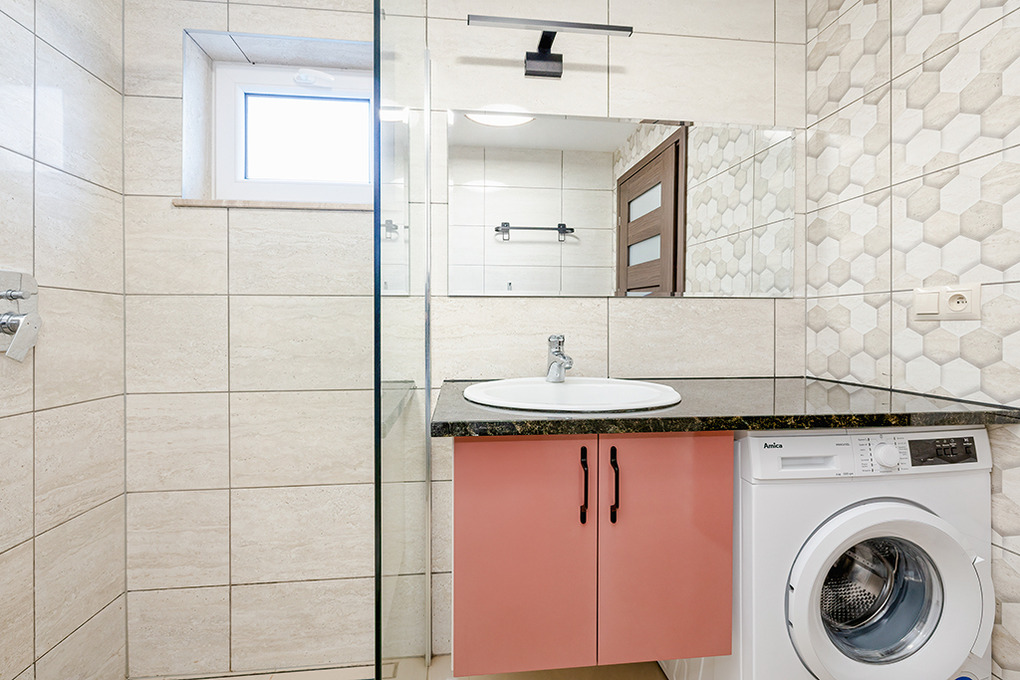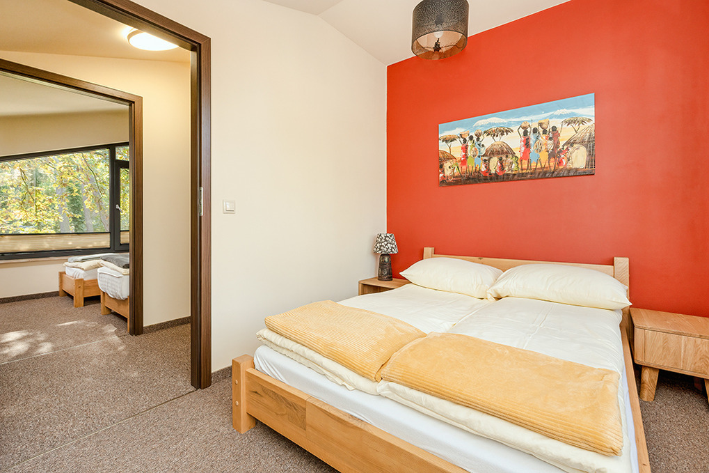 PL 30.43 Ferienhaus 2-4 Pers.: 3-Zimmer-Haushälfte mit 66 qm Wohnfläche über 2 Etagen. Parterre: Wohn-/Essraum mit Couchgarnitur, Flachbild Sat-TV (deutsche Programme), Esstisch, Küchenzeile (Gasherd 2 Flammen, Abzugshaube, Mikrowelle). Modernes Bad mit Du, Wb, WC, Waschmaschine. 1. Etage: 2 Doppelzimmer. Kleines Bad mit Wb, WC.