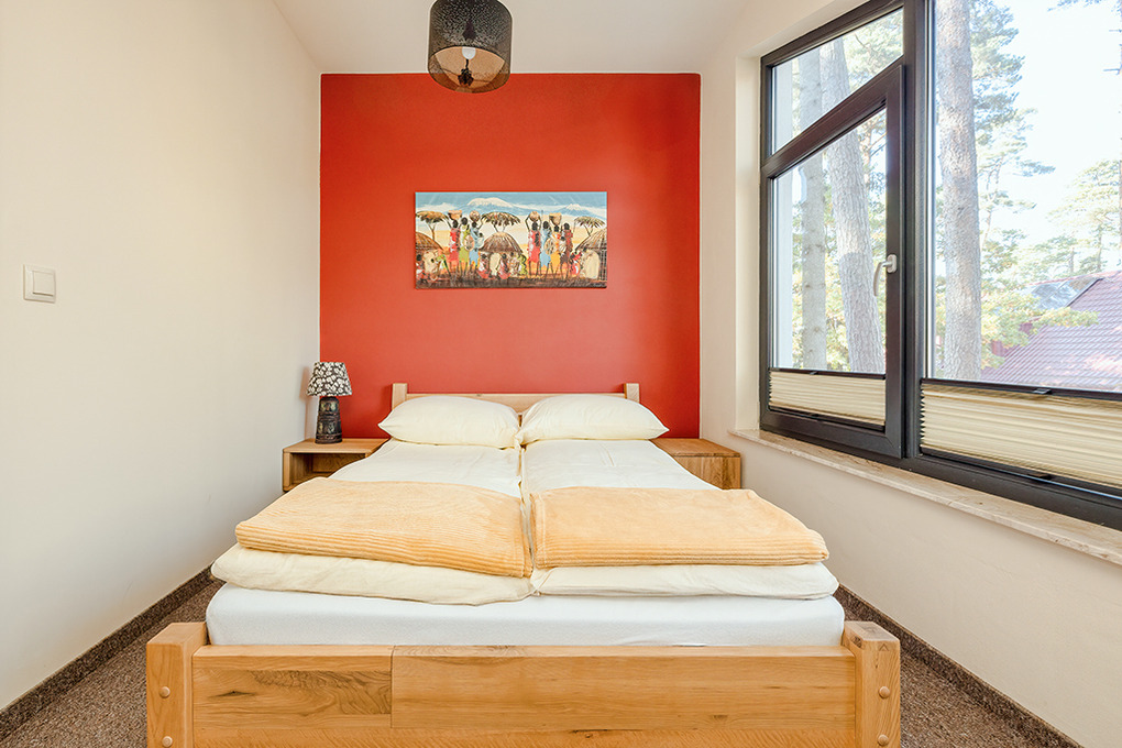 PL 30.43 Ferienhaus 2-4 Pers.: 3-Zimmer-Haushälfte mit 66 qm Wohnfläche über 2 Etagen. Parterre: Wohn-/Essraum mit Couchgarnitur, Flachbild Sat-TV (deutsche Programme), Esstisch, Küchenzeile (Gasherd 2 Flammen, Abzugshaube, Mikrowelle). Modernes Bad mit Du, Wb, WC, Waschmaschine. 1. Etage: 2 Doppelzimmer. Kleines Bad mit Wb, WC.