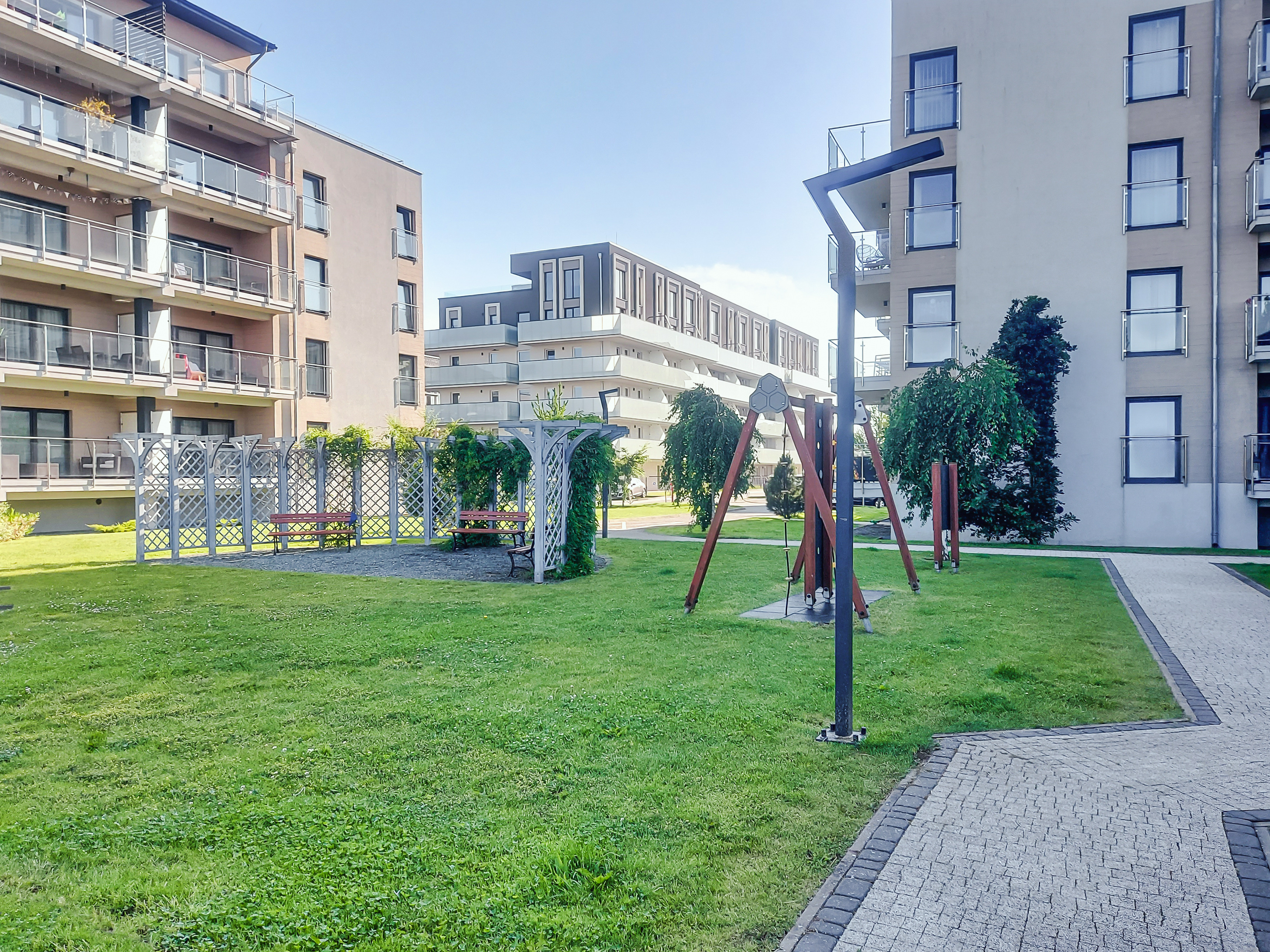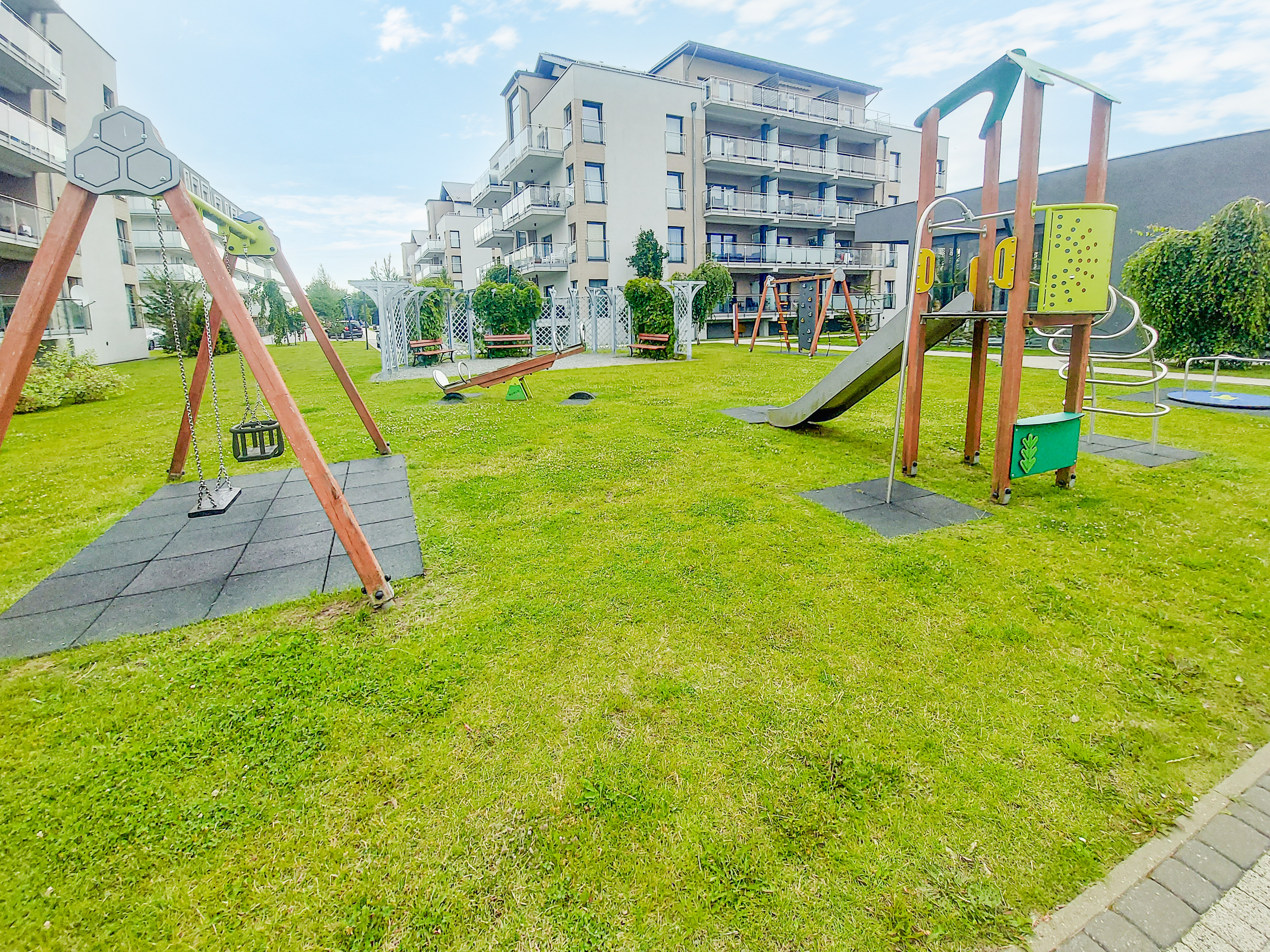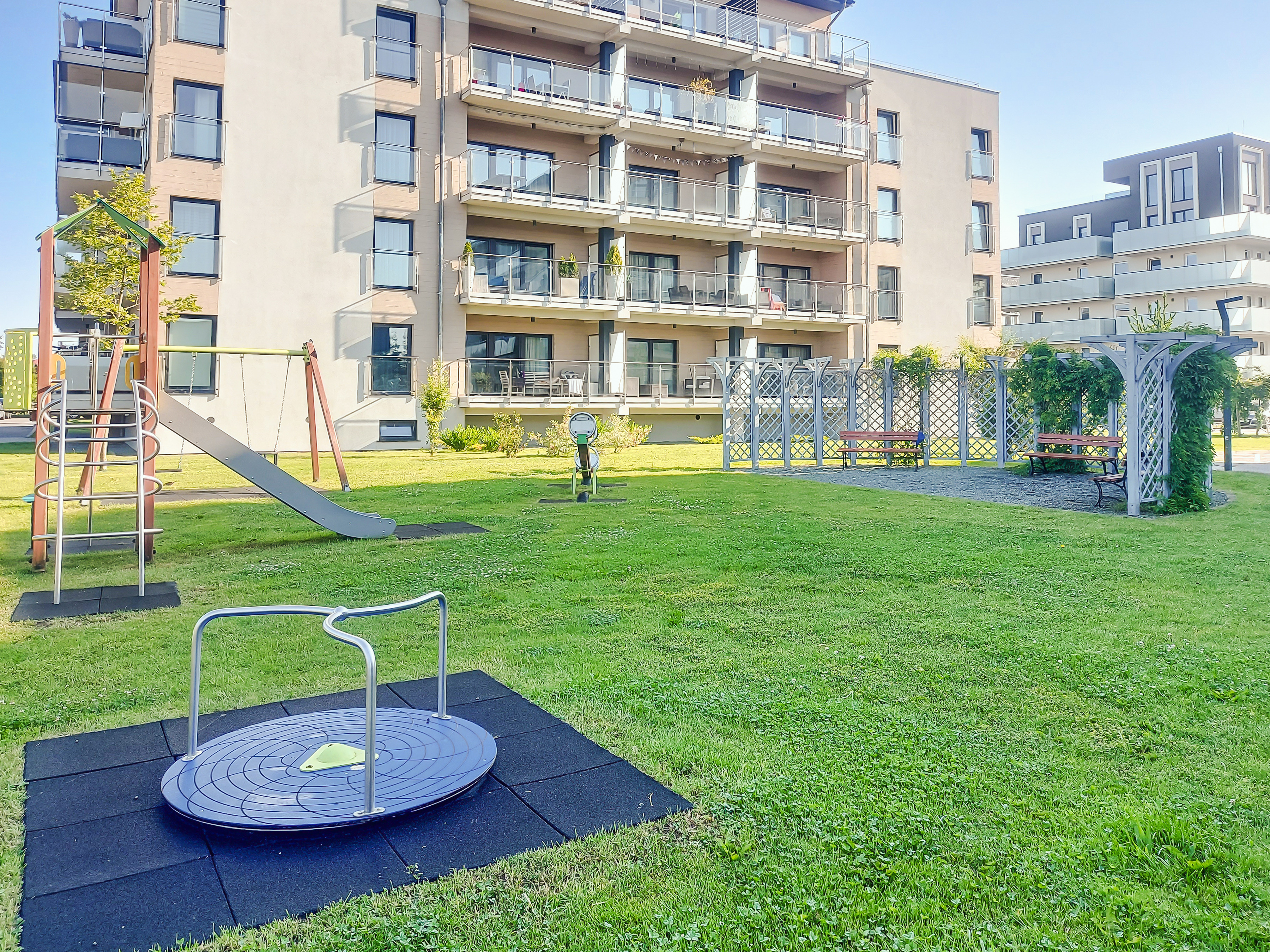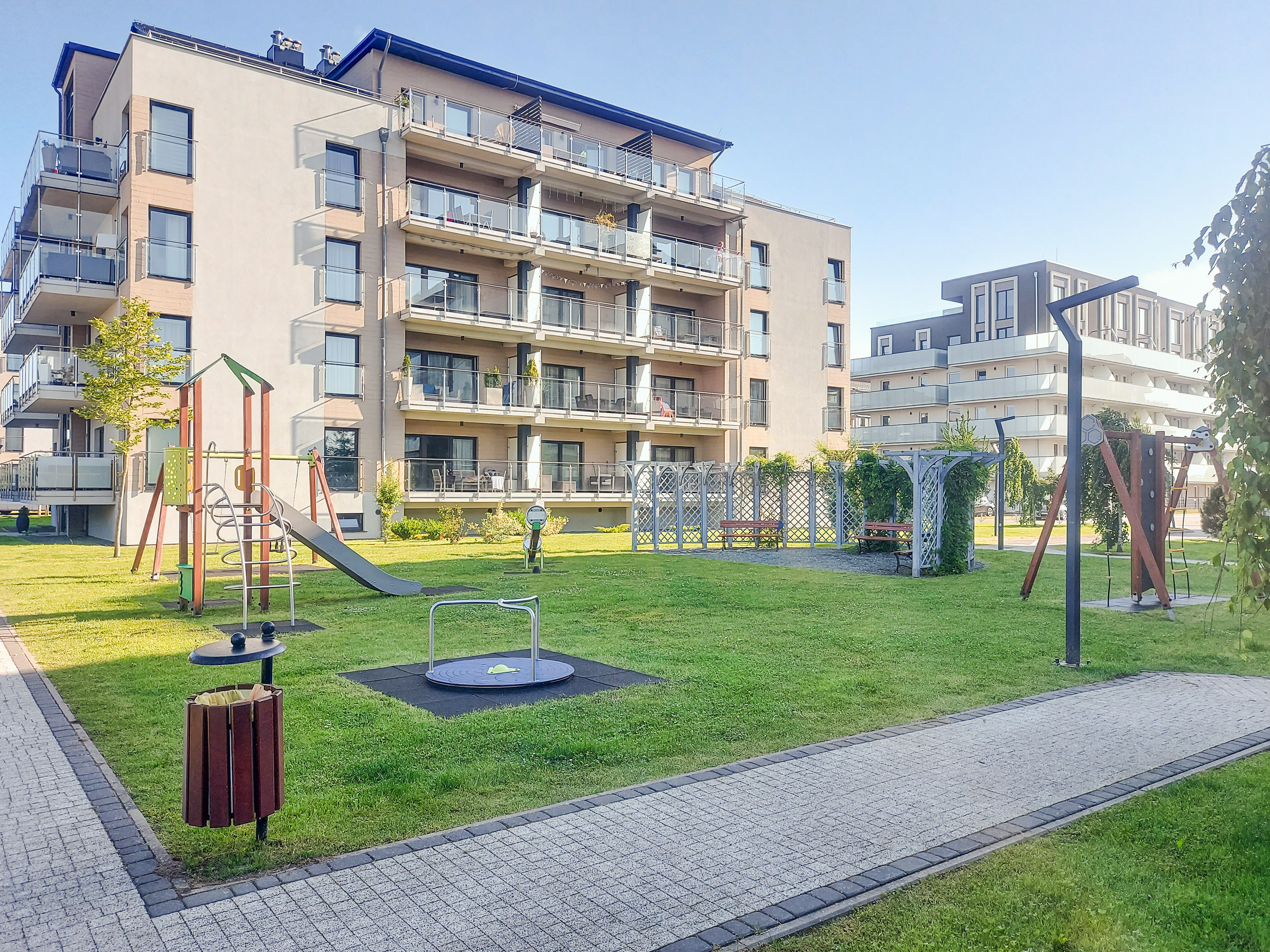 Haus: Stilvolle Residenz mit schönen Ferienwohnungen, 2023 neu erbaut. Moderne Einrichtung. Kostenloser Internetzugang über WLAN. Zentralheizung. Klimaanlage im Wohnzimmer. Alle Fewos mit Terrasse oder Balkon. Aufzug im Haus. 1 Tiefgaragenplatz/Fewo. In der Anlage: Kinderspielplatz (Rutschen, Wippen, Klettergerüst, Sandkasten, Trampolin).