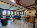 Parterre: Schöner Wohnraum (45 qm) mit Kaminofen, gemütlicher Sitzgruppe, Sat-TV, Radio, Esstisch, Einbauküche (Backofen, Mikrowelle, Spülmaschine).