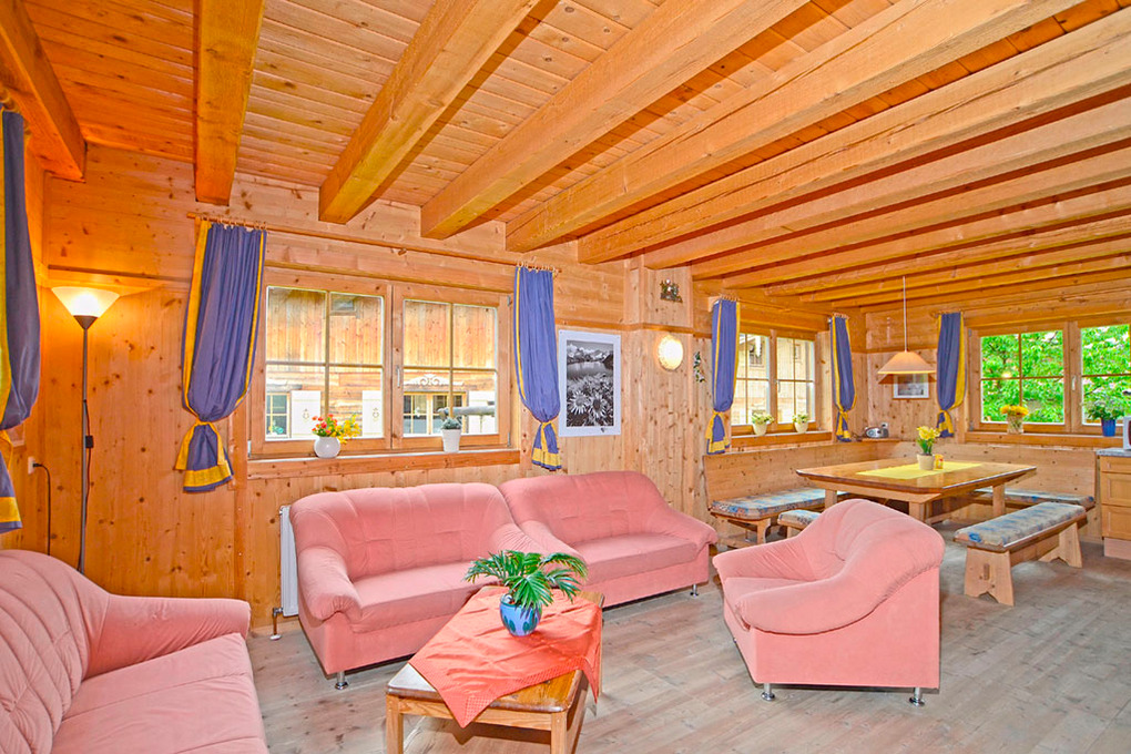 Parterre: Großer, heller Wohn-/Essraum mit Kaminofen, großem Esstisch, Sat-TV, Radio, moderner Küchenzeile (Backofen, Spülmaschine). Doppelzimmer. Separates WC. Abstellraum.