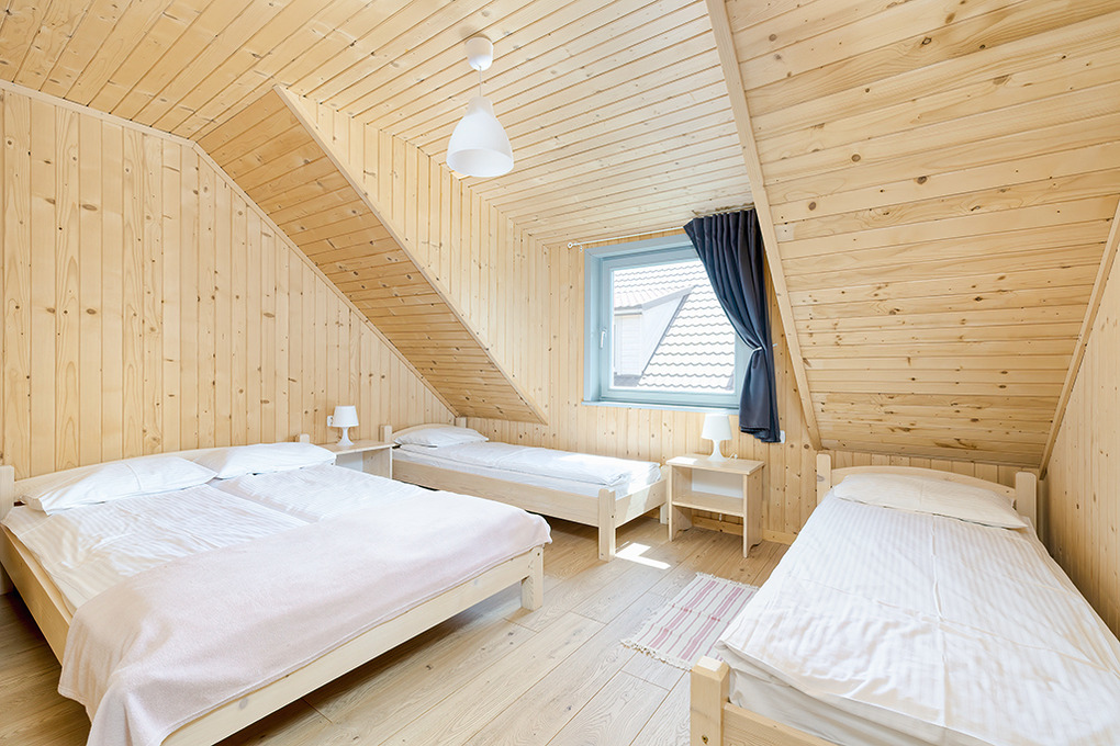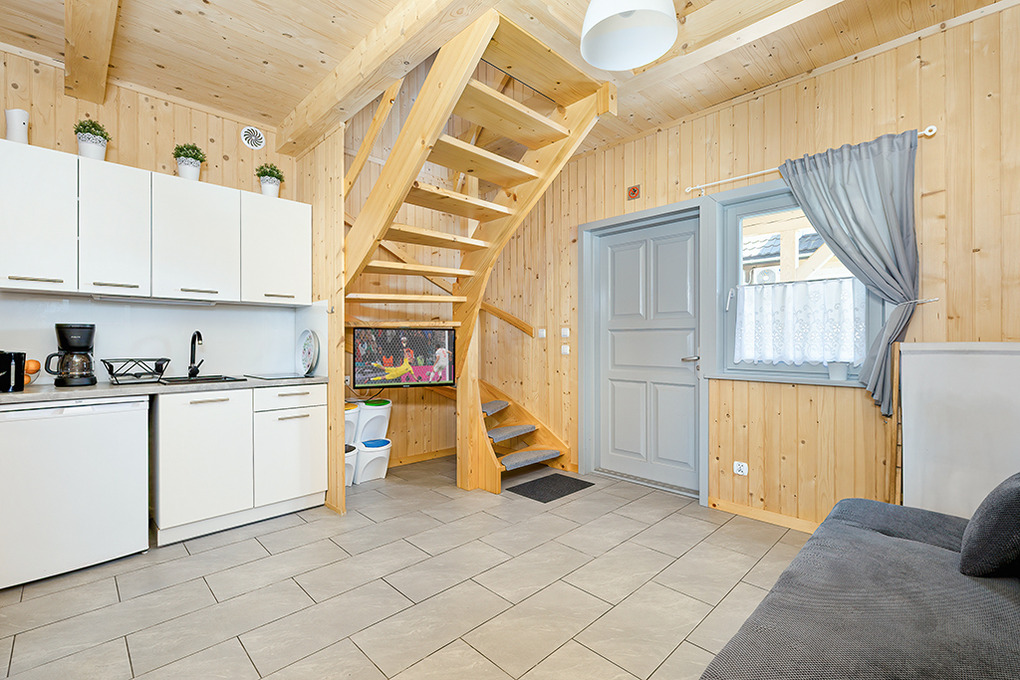 PL 50.10 Ferienhaus 2-8 Pers.: Rustikal eingerichtetes, helles Reihenhaus mit 60 qm Wohnfläche über 2 Etagen. Parterre: Wohn-/Essraum mit rustikaler Holzbalkendecke, Sofa (Klappcouch 2 Pers.), SAT-TV (dt. Programme), Esstisch, Küchenzeile (2 Pl. Ceranfeld). Bad: Du, Wb, WC. Vom Wohnzimmer Holztreppe ins Dachgeschoß: 4-Bettzimmer mit Doppelbett, Einzelbetten. 3-Bettzimmer mit Doppelbett, Einzelbett. Überdachte Terrasse mit Sitzmöbeln, Grill mit Blick auf den davorliegenden Garten.
