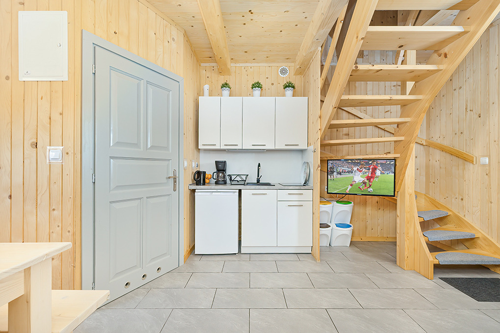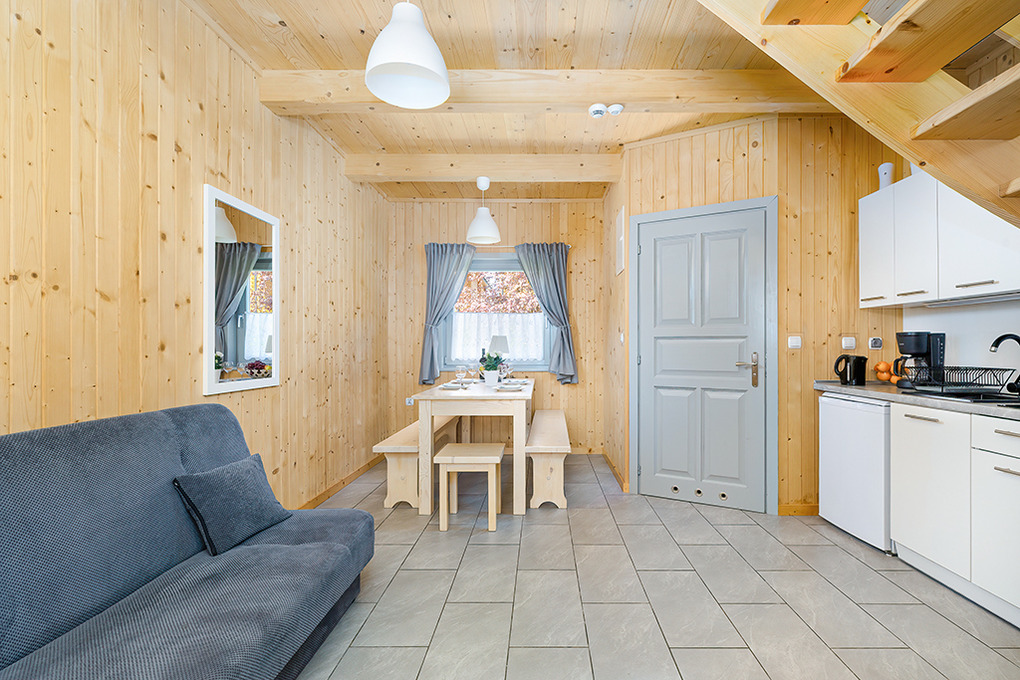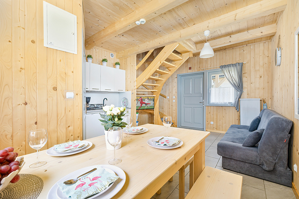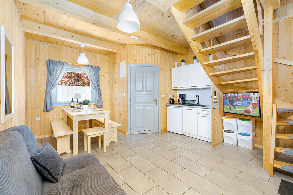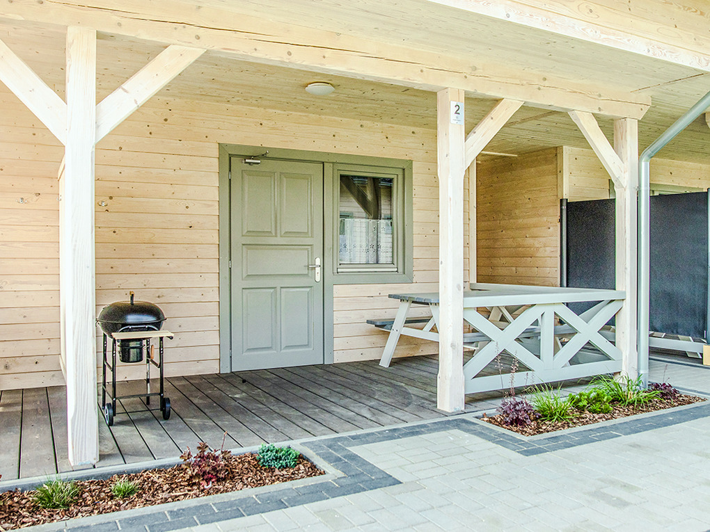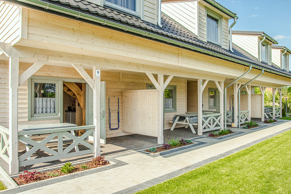 PL 50.10 Ferienhaus 2-8 Pers.: Rustikal eingerichtetes, helles Reihenhaus mit 60 qm Wohnfläche über 2 Etagen. Parterre: Wohn-/Essraum mit rustikaler Holzbalkendecke, Sofa (Klappcouch 2 Pers.), SAT-TV (dt. Programme), Esstisch, Küchenzeile (2 Pl. Ceranfeld). Bad: Du, Wb, WC. Vom Wohnzimmer Holztreppe ins Dachgeschoß: 4-Bettzimmer mit Doppelbett, Einzelbetten. 3-Bettzimmer mit Doppelbett, Einzelbett. Überdachte Terrasse mit Sitzmöbeln, Grill mit Blick auf den davorliegenden Garten.