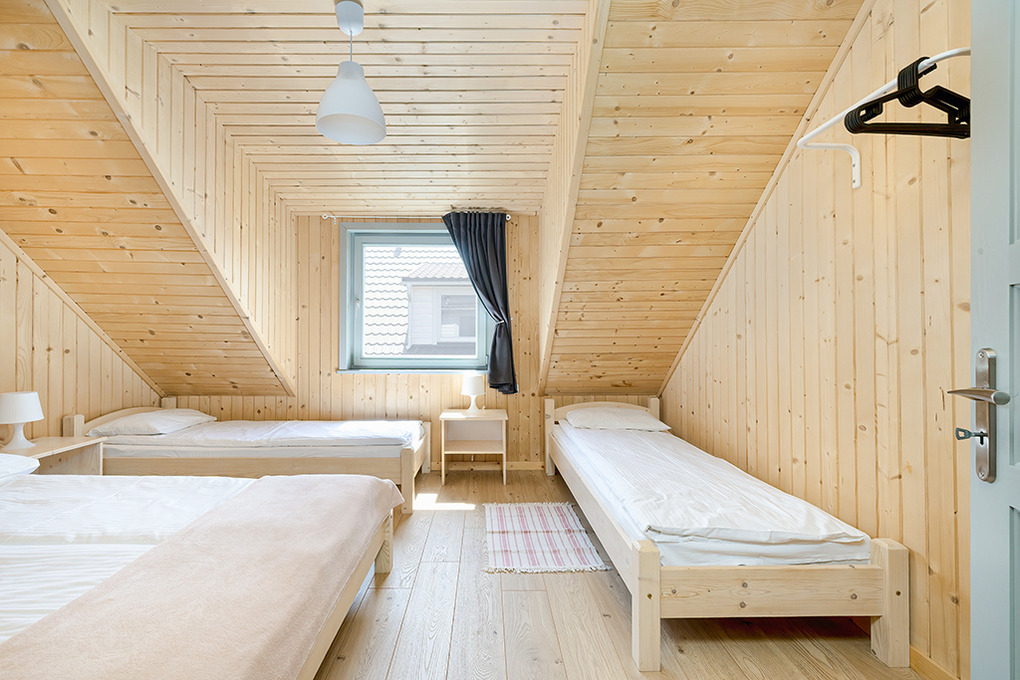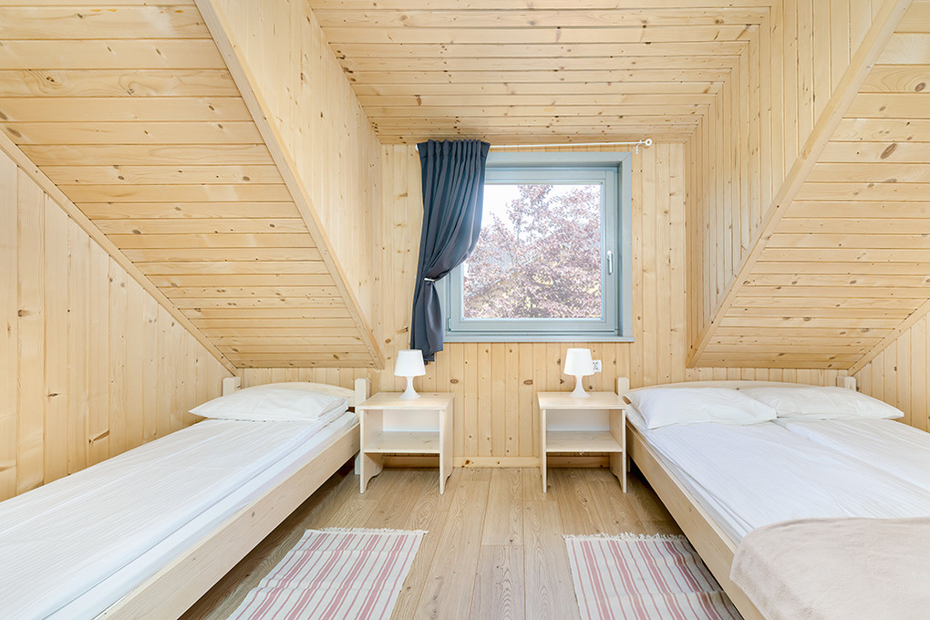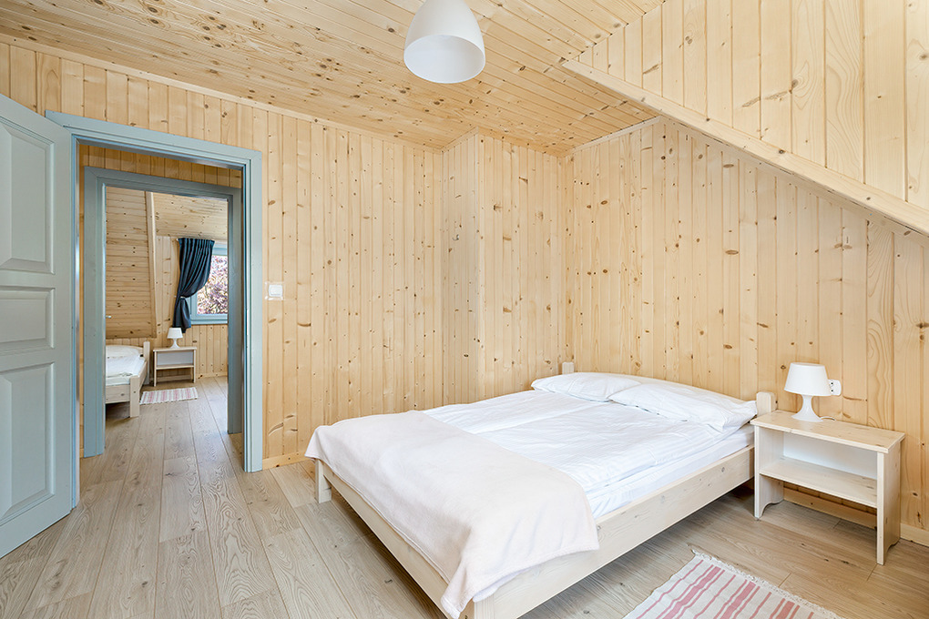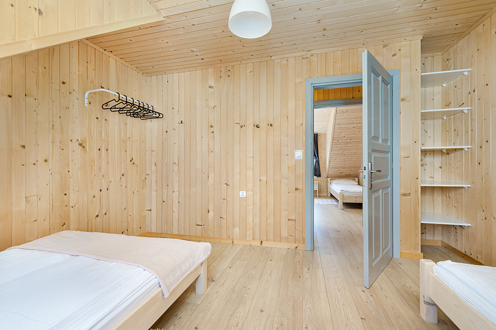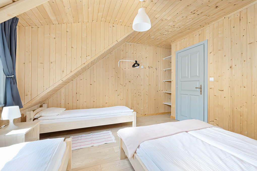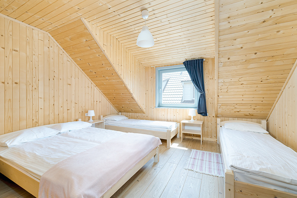 PL 50.10 Ferienhaus 2-8 Pers.: Rustikal eingerichtetes, helles Reihenhaus mit 60 qm Wohnfläche über 2 Etagen. Parterre: Wohn-/Essraum mit rustikaler Holzbalkendecke, Sofa (Klappcouch 2 Pers.), SAT-TV (dt. Programme), Esstisch, Küchenzeile (2 Pl. Ceranfeld). Bad: Du, Wb, WC. Vom Wohnzimmer Holztreppe ins Dachgeschoß: 4-Bettzimmer mit Doppelbett, Einzelbetten. 3-Bettzimmer mit Doppelbett, Einzelbett. Überdachte Terrasse mit Sitzmöbeln, Grill mit Blick auf den davorliegenden Garten.