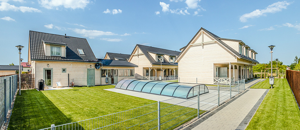 Haus: Sehr gepflegte Ferienhausanlage mit 12 Holzblock-Reihenhäusern 2019 erbaut auf einem ca 2800 qm großen, eingezäuntem Grundstück. In der Anlage: Rezeption, überdachter Außenpool (4,3 x 10 m. 31.5.-15.9. geöffnet und beheizt). Kinderspielplatz mit Schaukeln, Rutschen, Sandkasten,