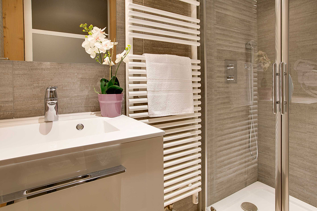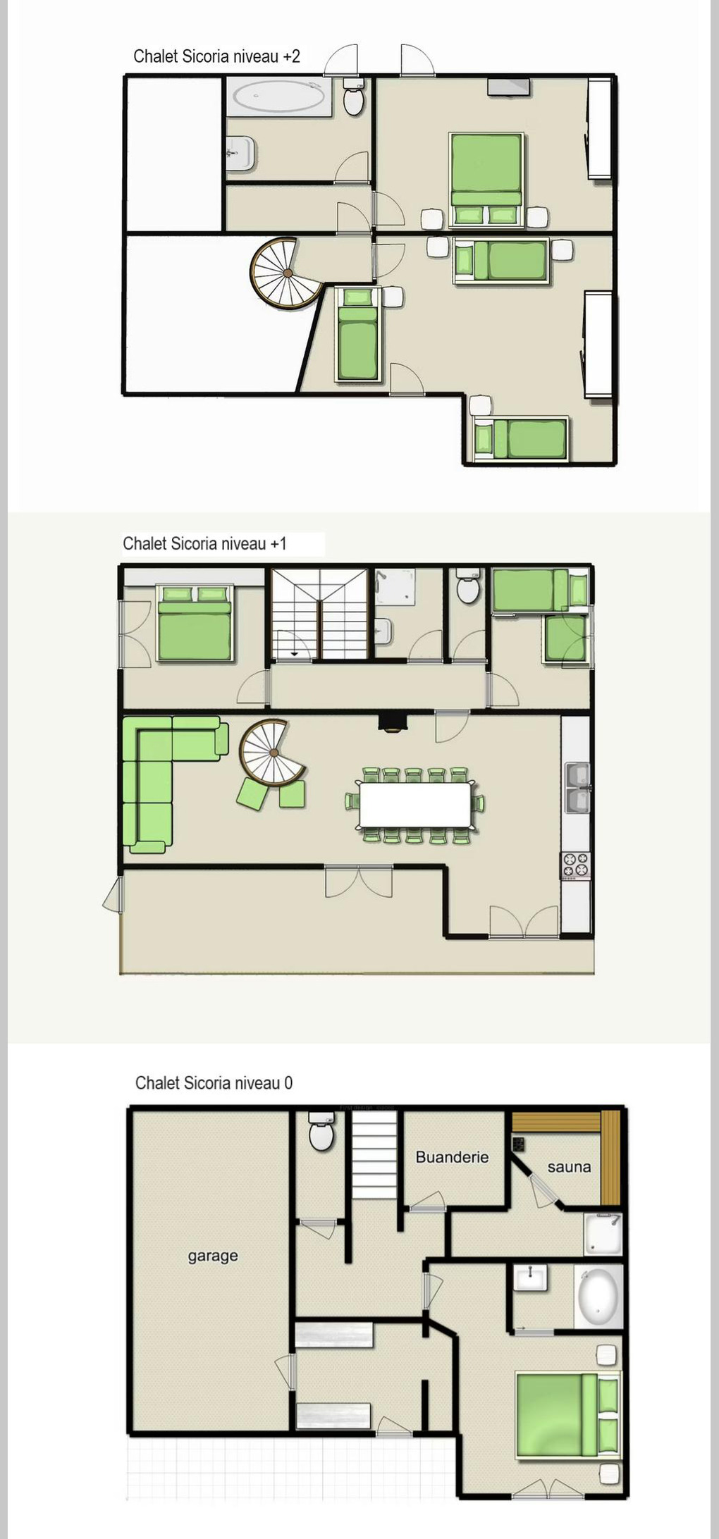 Parterre: Skiständer in der Garage. Skischuhraum mit beheizten Schuhtrocknern. Doppelzimmer mit Sat-TV, Bad (Dusche, Wb). Sauna mit Dusche. Separates WC. Waschmaschine im Heizungsraum.
