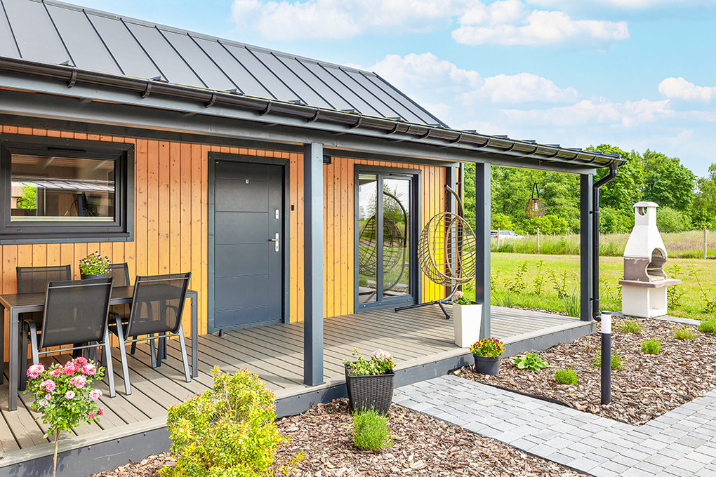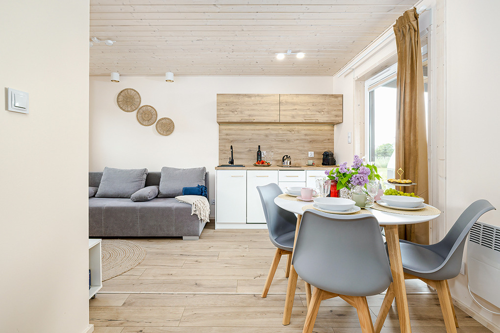 PL 33.10 Ferienhaus 1-5 Pers.: 2 -Zimmer-Ferienhaus mit 45 qm Wohnfläche. Wohn-/Essraum mit Couch (Schlafsofa 2 Pers.), Flachbild Sat-TV mit deutschen Programmen, Esstisch, Küchenzeile (2 Induktionsplatten, Mikrowelle, Spülmaschine). 3-Bettzimmer mit Sat-TV. Modernes Bad: Dusche, Wb, WC. Terrasse mit Sitzmöbeln, Grill, schönem Blick.