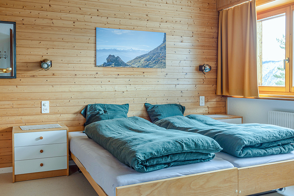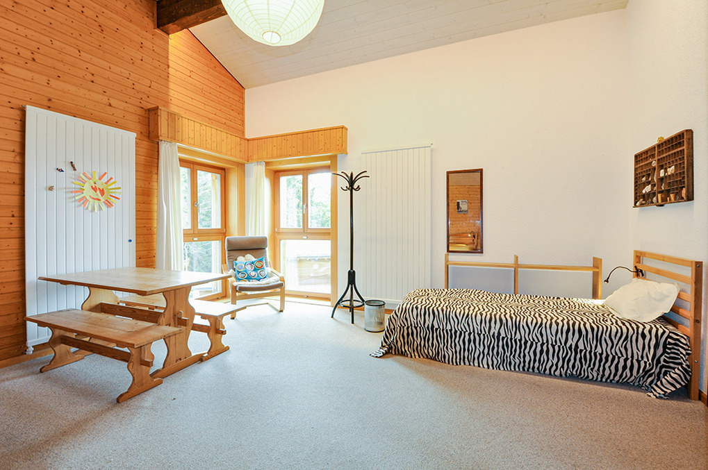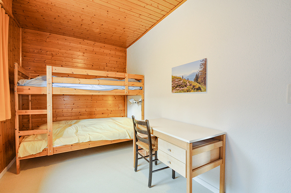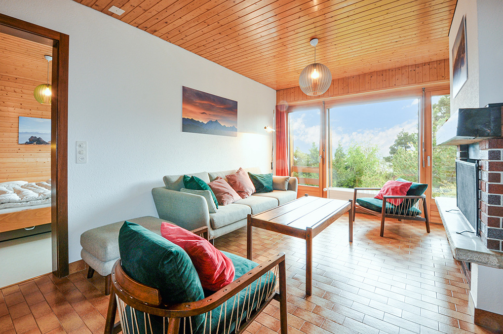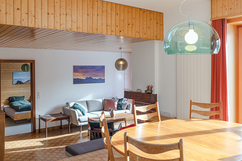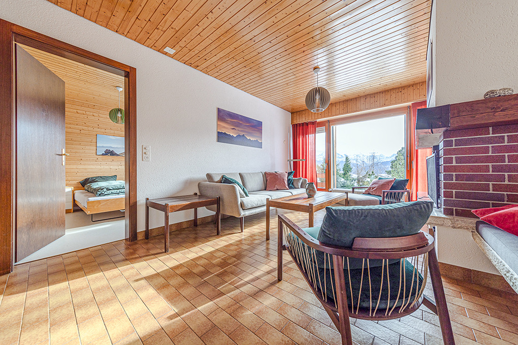 Ch 361.22 Wohnung 4-11 Pers.: 5-Zimmerwohnung mit 150 qm Wohnfläche über 2 Etagen. Parterre: Großzügiger Wohnraum (50 qm) über 2 Ebenen mit Panoramafenstern, Sitzgruppe am Kamin, Kabel-TV, Esstisch, moderner Einbauküche (Backofen, Spülmaschine), Terrasse. Großes Doppelzimmer. Doppelzimmer. Bad: Dusche, 2 Waschbecken. 2-Bettzimmer mit Etagenbett. Separates WC, Wb. 1. Etage (Zugang über Gemeinschaftsflur): Großes 5-Bettzimmer, ausgebaut bis zum Dachboden mit sehr schönem Blick, Einzelbett, Doppelbett, Etagenbett, eigenem Bad (Dusche, Wb, WC).