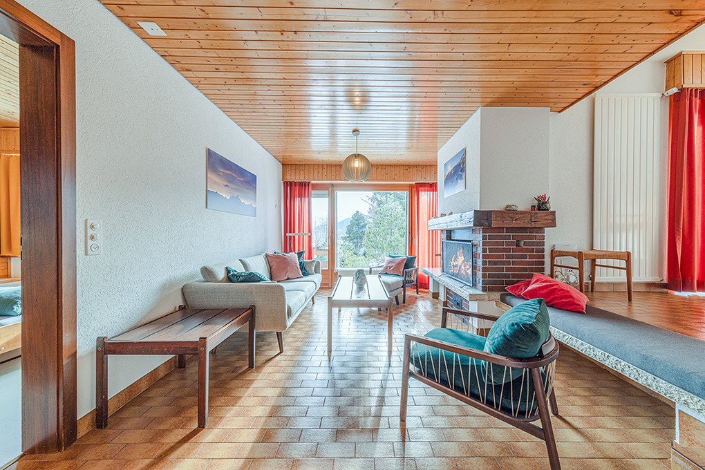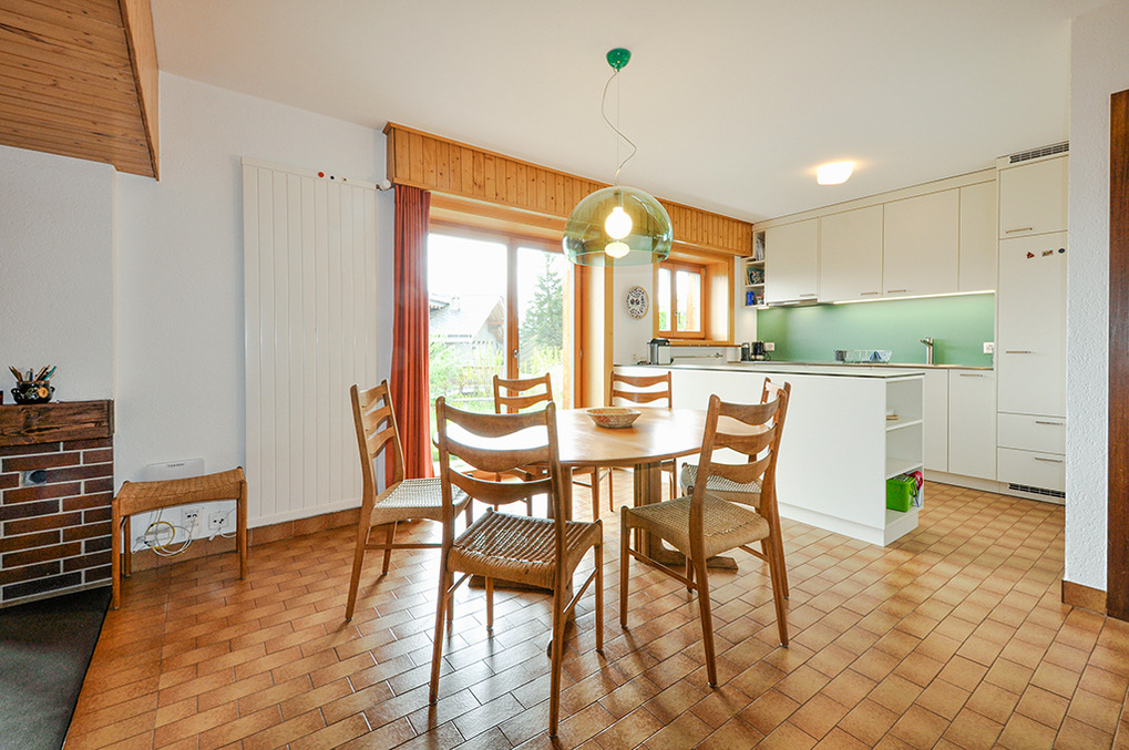 Haus: Sehr gepflegte Chaletwohnung mit Kamin. Regionaltypisches Ferienhaus mit zwei schönen Ferienwohnungen. Gemütliche, familiäre Chalet-Atmosphäre mit Holzvertäfelung in vielen Räumen. Offen gestaltete, sehr großzügige Architektur. Moderne Komfort-Ausstattung. Internetzugang kostenlos über W-Lan. Pellet-Zentralheizung. Nichtraucherhaus. Terrasse mit Sitzmöbeln. Kleiner Garten mit Sonnenliegen. Garage für einen kleinen Pkw. 2 weitere Pkw-Stellplätze am Haus.
