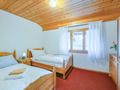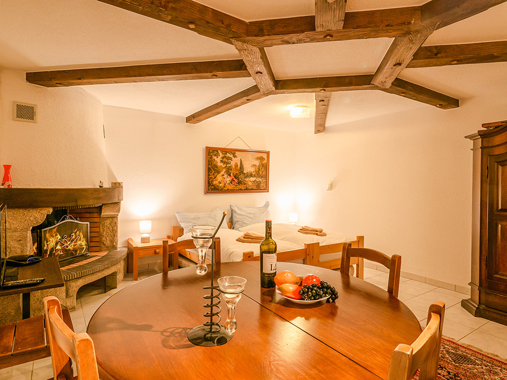 2. Etage: Heller Wohn-/Essraum, ausgebaut bis in den Dachgiebel, mit Kamin, Sitzgruppe, Smart-TV, Esstisch, Küchenzeile (Backofen, Spülmaschine). Zwei Doppelzimmer. 4-Bettzimmer mit 2 Einzelbetten, Etagenbett. Bad: Du, Bw, Wb, WC. Balkon mit Sitzmöbeln, schönem Talblick. Zusätzlich im