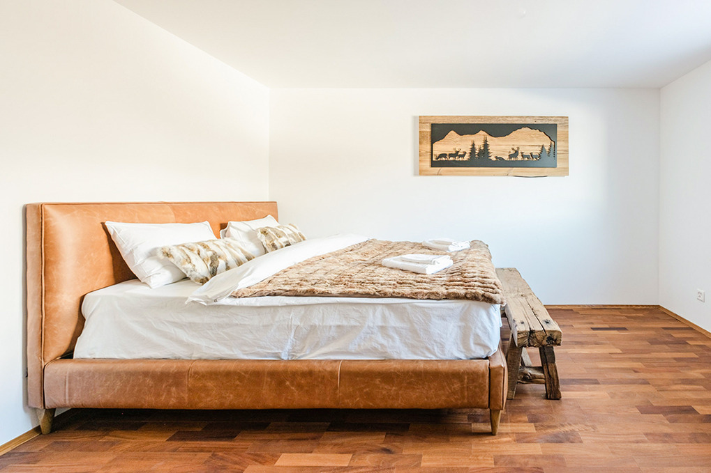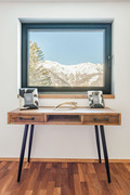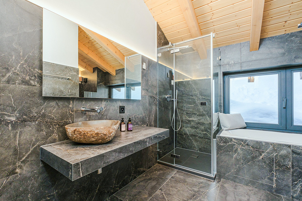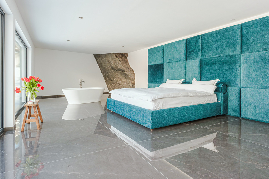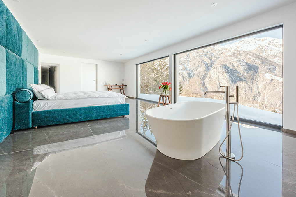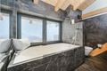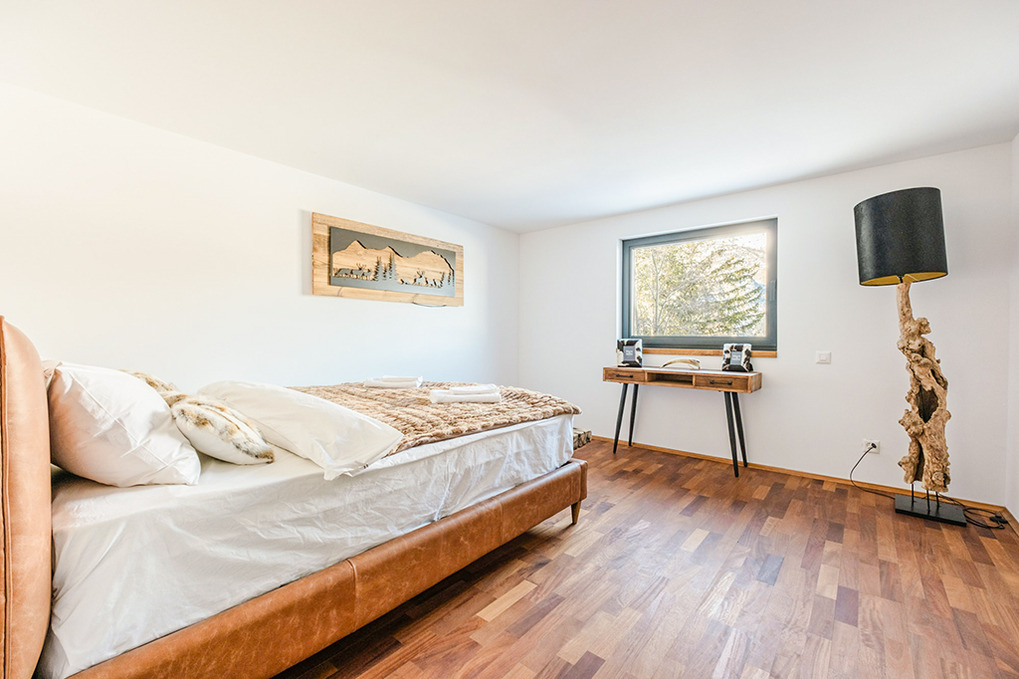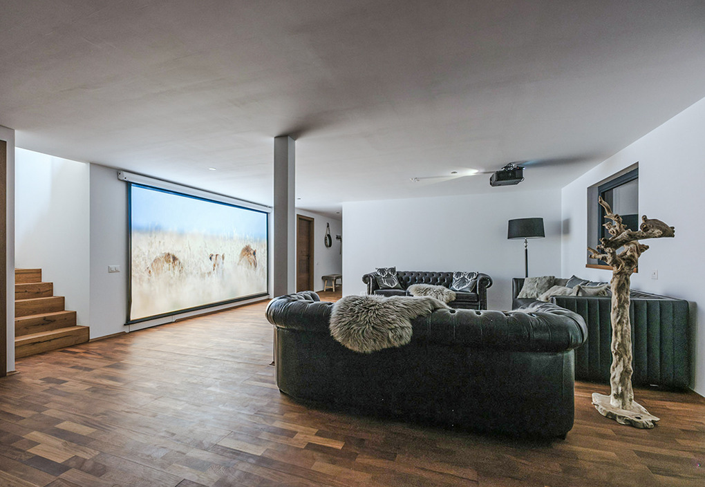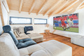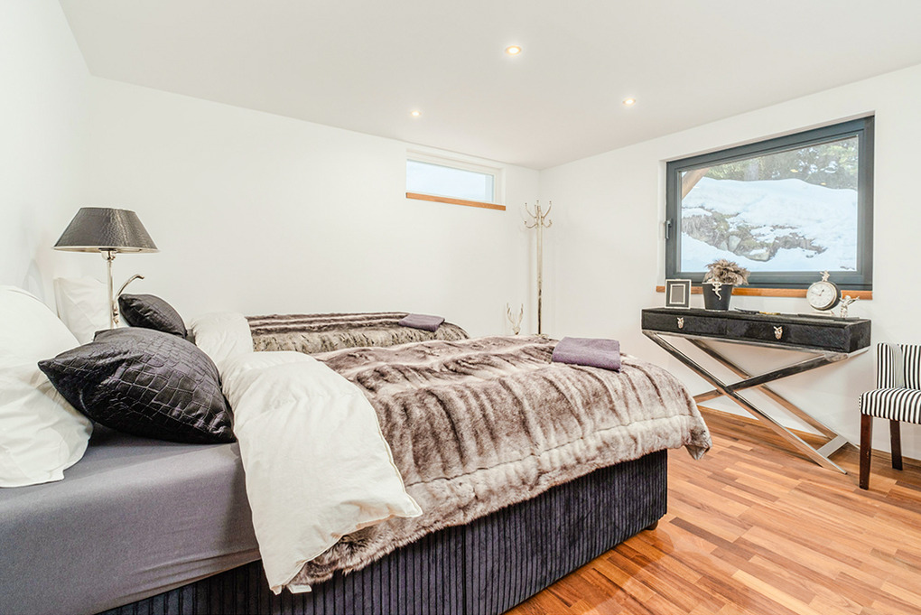Parterre: Weiterer Wohnraum mit Sofa-Sitzecke, Home-Cinema (Beamer). Großes Doppelzimmer mit freistehender Badewanne vor großen Panoramafenstern (herrlicher Bergblick). Zwei weitere schöne Doppelzimmer. Bad: Dusche, Wb, WC. Weiteres Bad mit Dusche, großem Dampfbad. Zugang zur Terrasse mit Sitzmöbeln, Panorama-Sauna, Hot-Tub-Whirlpool.