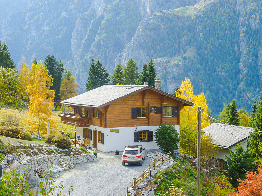 Ort: Niedergrächen. Ruhige Lage auf 1.500 m Höhe in einer Chaletsiedlung unterhalb des autofreien Orts Grächen. Schöner Panoramablick auf das Weisshorn (4.505 m) und die imposante Bergwelt des Mattertals. Ortsmitte Grächen mit Supermarkt, Restaurants, Gondel (Sommerbetrieb) zu Fuß nur 1,2 km (Wanderweg), per Pkw 2,5 km. Postbus 250 m. Der Europaweg Grächen-Zermatt verläuft in unmittelbarer Nähe des Hauses. Vielfältige Wander- und Mountainbikewege rund um Grächen und die Hannigalp.