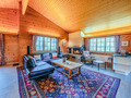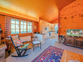 1. Etage: Sehr schöner, bis zum Dachgiebel ausgebauter Wohnraum (60 qm) mit umlaufenden Panoramafenstern, gemütlicher Sofa-Sitzgruppe, Kamin, Sat-TV, Esstisch, gut ausgestatteter Einbauküche (Backofen, Mikrowelle, Spülmaschine), Balkon. Doppelzimmer. Separates WC.