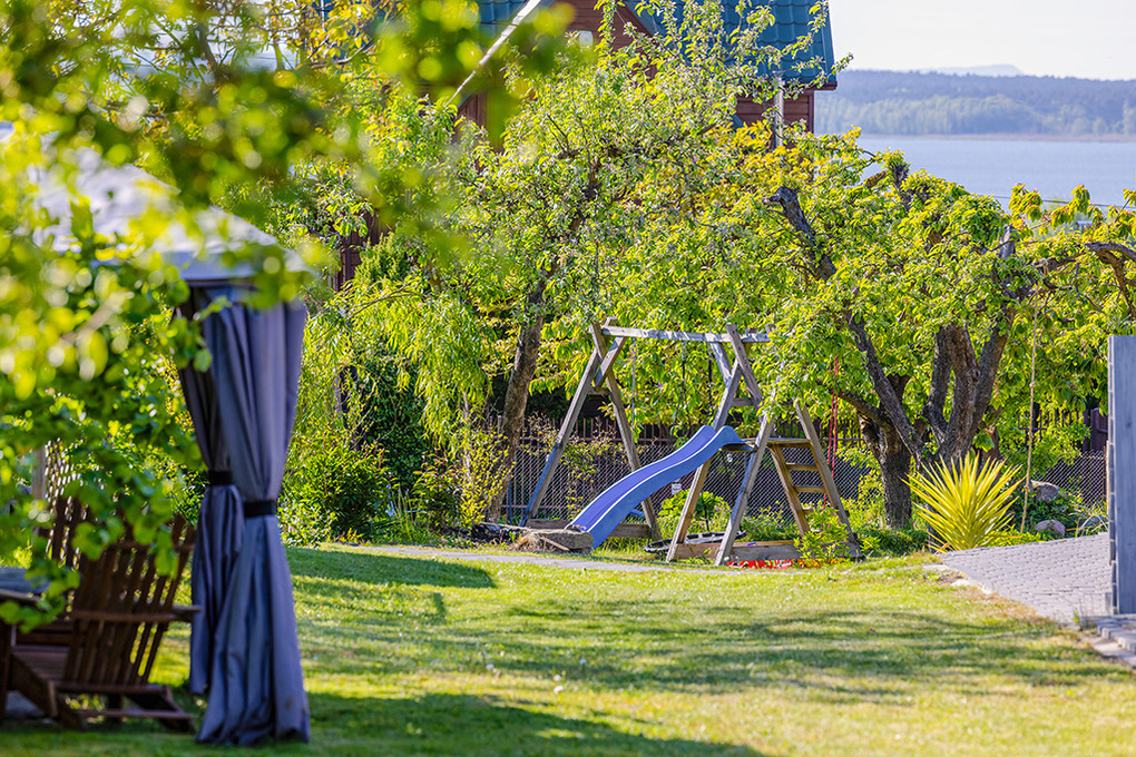 Ort: Ostseebad Miedzyzdroje, Ortsteil Lubin. Kleiner, ruhiger Ort in idyllischer Lage auf den Hügeln der Insel Wolin mit einem herrlichen Blick auf den Wicko Wielkie See, einer großen Bucht des Stettiner Haffs. Restaurant 400 m, Lebensmittelgeschäft in Wapnica 2 km. Naturstrand 700 m mit flachem Wasser, ideal für Familien mit Kindern. Weiterer Strand mit Liegen, Hängematen, kleinem Spielplatz in Wapnica 2 km. Aussichtspunkt Grodzisko Lubin mit Cafe 450 m, von hier herrlicher Blick von der Steilküste auf das Stettiner Haff.