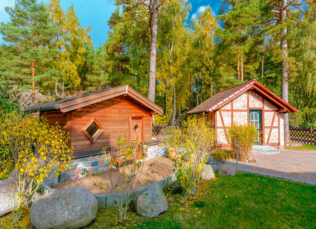 Haus: Zwei hintereinander liegende Doppelhäuser auf einem großen, abgeschlossenem, eingezäuntem Grundstück (1200 qm). Komfortable, nahezu identische Haushälften mit Kamin und Sauna. Moderne, geschmackvolle Einrichtung. E-Zentralheizung. Terrasse mit Sitzmöbeln. Zur gemeinschaftlichen Nutzung: Blockbohlenhaus mit Sauna, Dusche. Gepflegter Garten mit 2 Grillplätzen, rustikalen Tischen, Bänken. Kleiner Spielplatz mit Schaukel, Rutsche, Sandkasten. 1 Pkw-Stellplatz pro Haushälfte.
