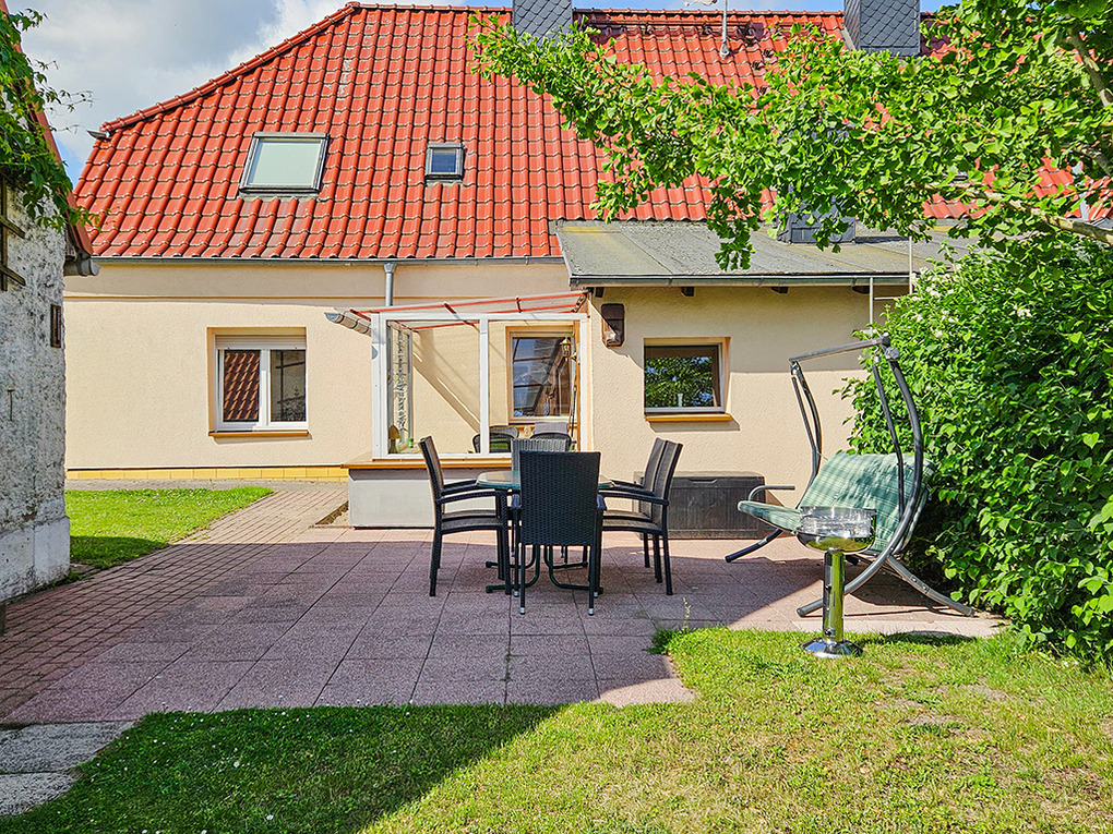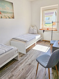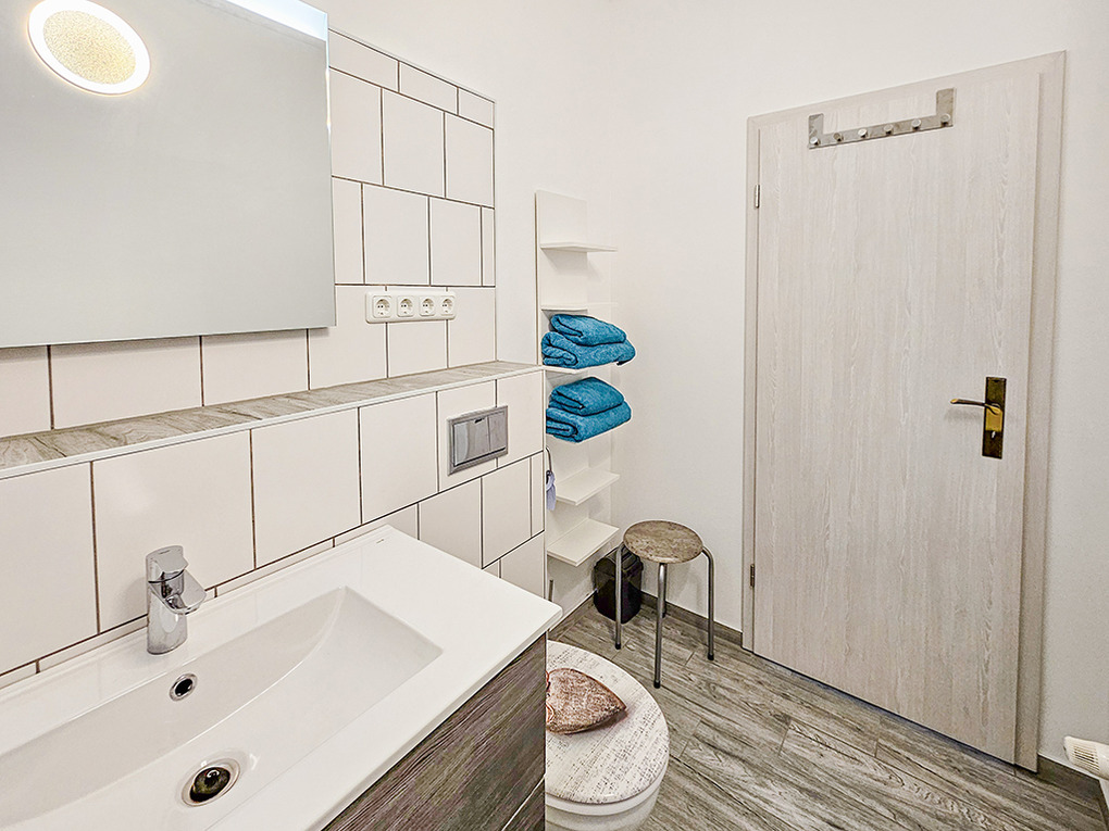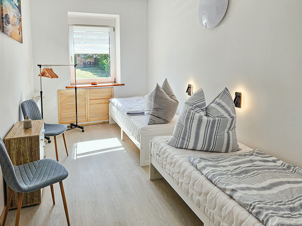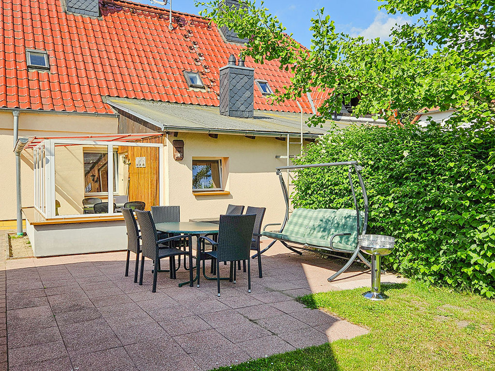 Haus: Regionaltypische Doppelhaushälfte mit einer Ferienwohnung, 2025 komplett renoviert. Mit ihrem eigenen Eingang, zwei Terrassen und kleinem Garten hat die hübsche Fewo Ferienhaus-Charakter. Sehr geschmackvolle Einrichtung, moderne Komfortausstattung. Internetzugang über W-Lan. Waschmaschine. Zentralheizung. Nichtraucherhaus. Überdachte, windgeschützte Terrasse mit Sitzmöbeln. Weitere große Terrasse mit Sitzmöbeln, Hollywood-Schaukel, Grill. Kleiner Garten mit Rasenfläche. 3 Pkw-Stellplätze vorhanden.
