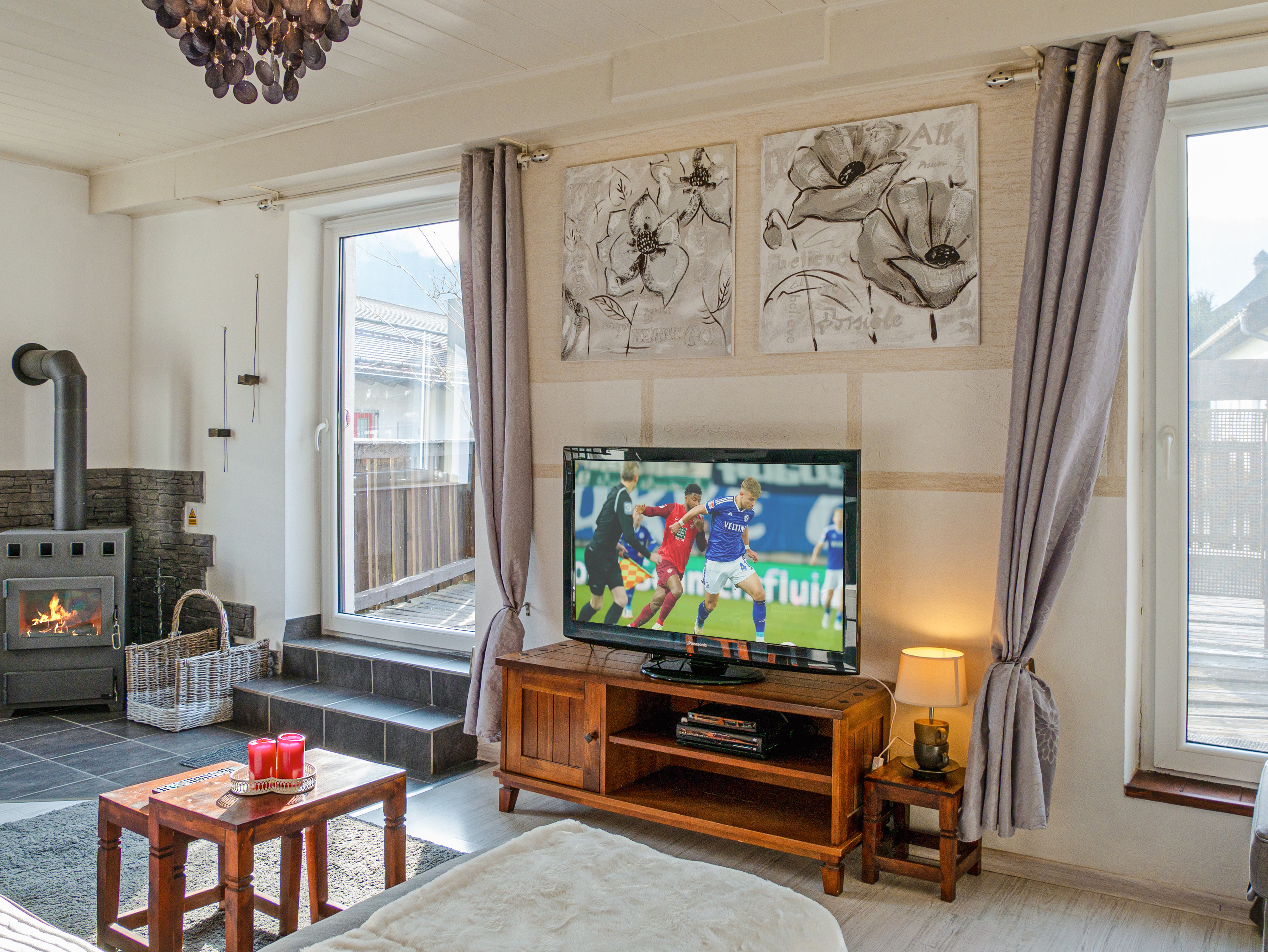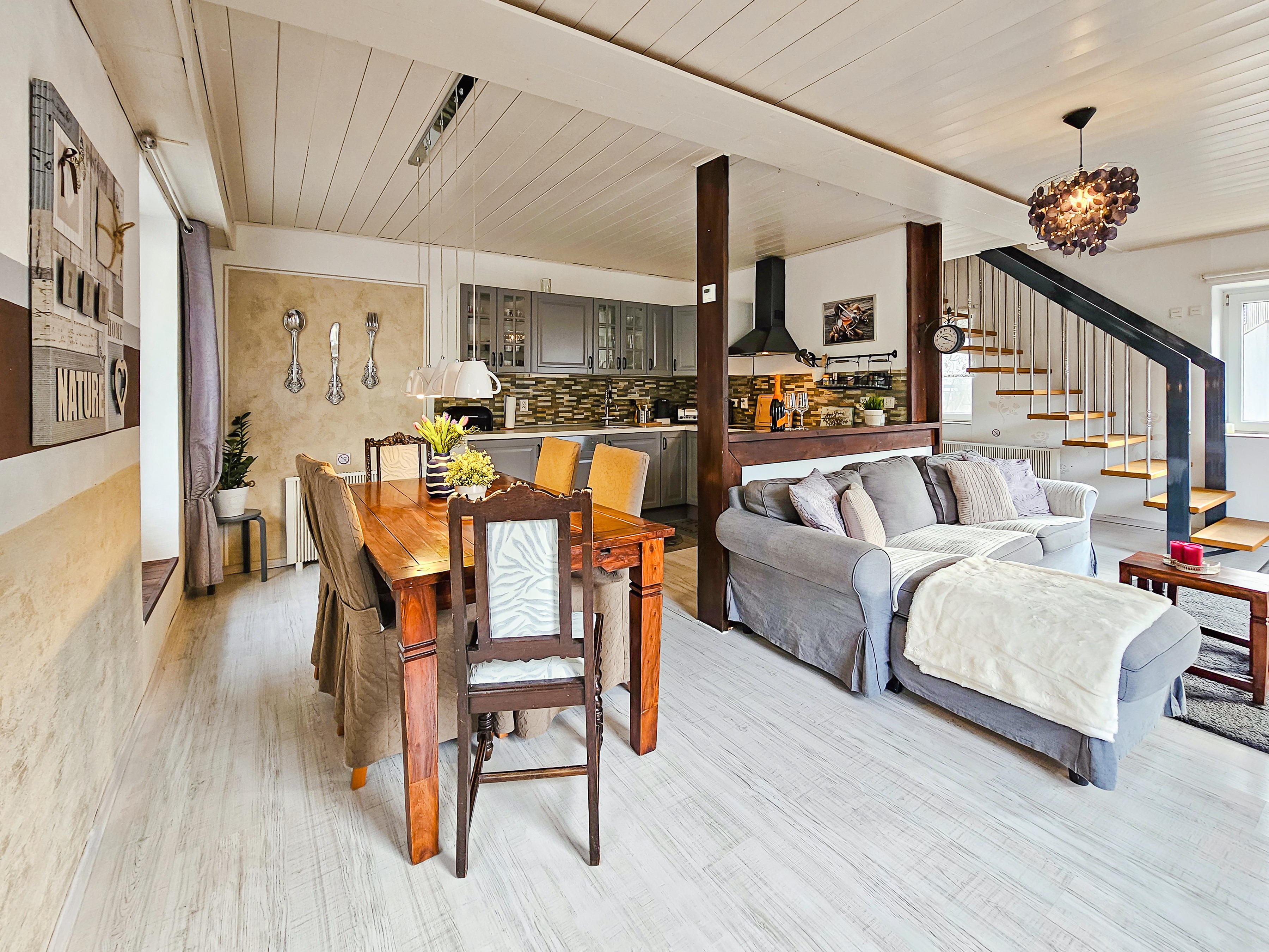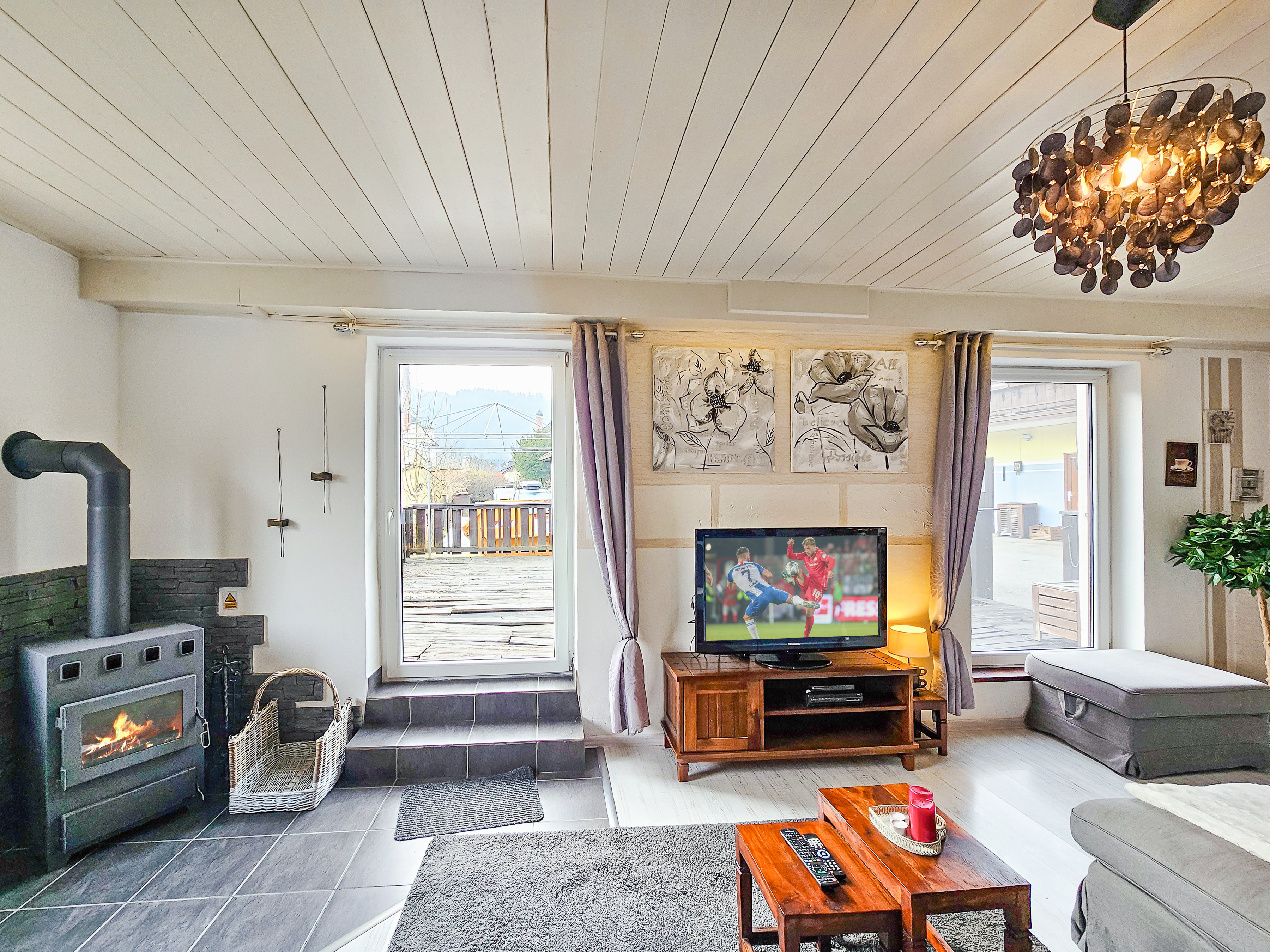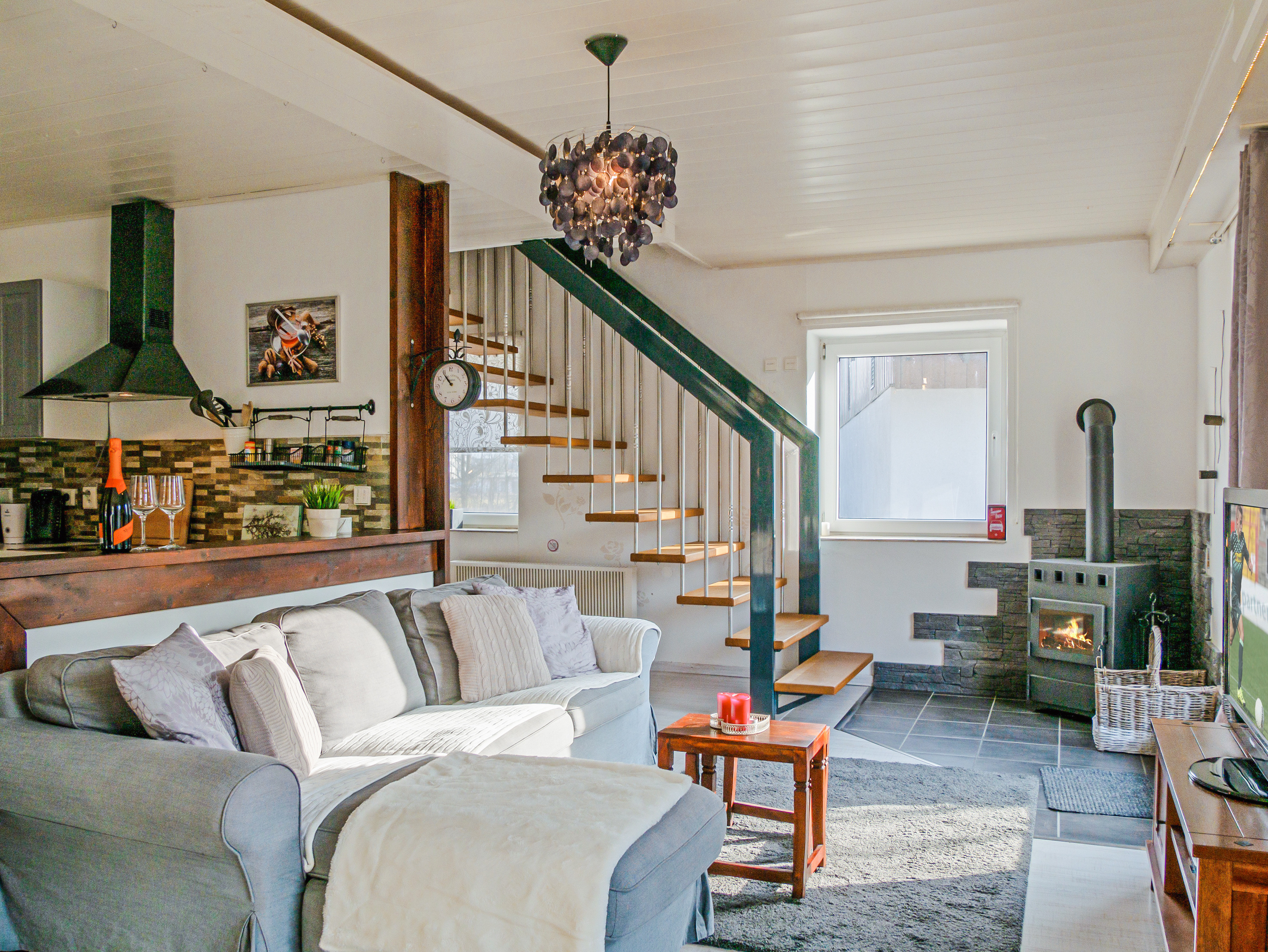 Haus: Großzügiges Ferienhaus mit Kaminofen. Geschmackvolle, rustikale Einrichtung. Kostenloser Internetzugang über WLan. E-Heizung. Große Terrasse mit Sitzmöbeln. 2 Pkw-Stellplätze am Haus im Preis inklusive.