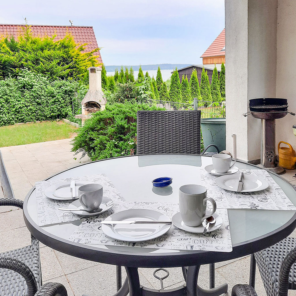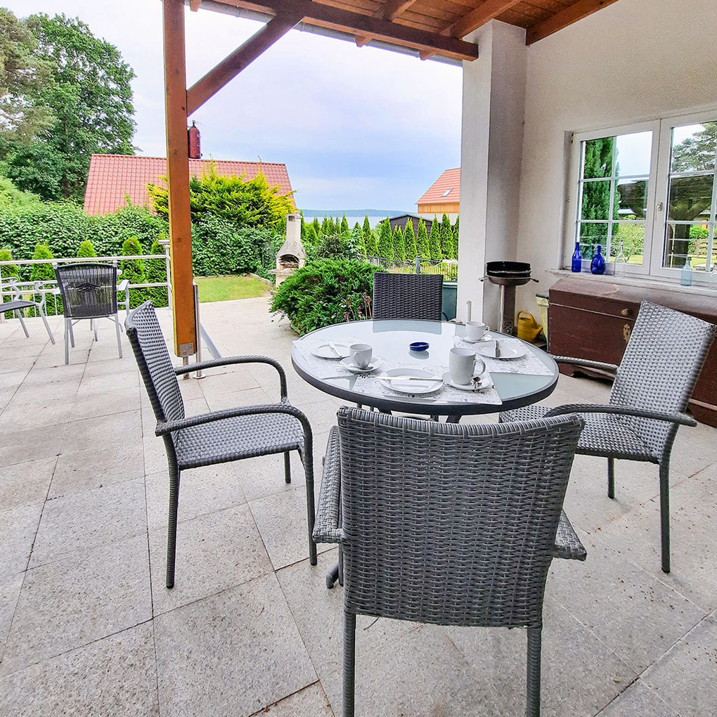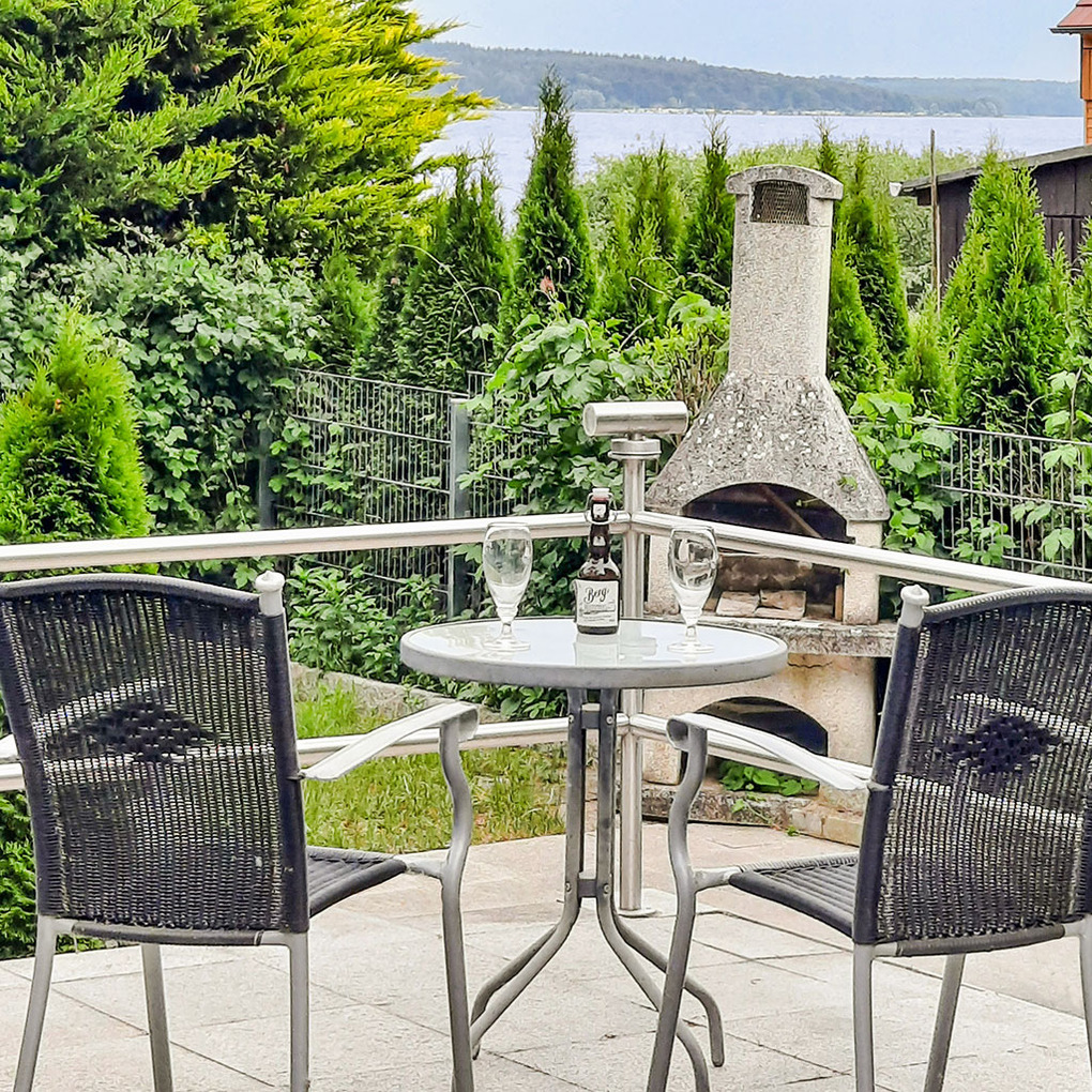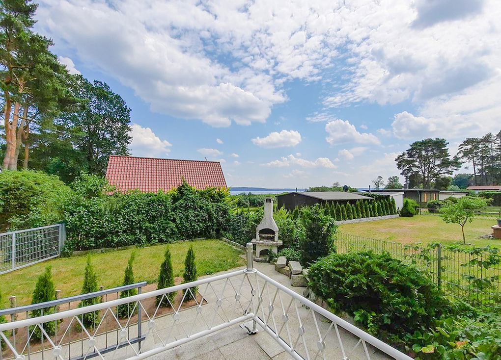 Haus: Freistehender Bungalow mit Kaminofen und Seeblick. Gemütliche Atmosphäre mit Holzvertäfelungen, gepflegte Einrichtung. Heizung über Kaminofen. Nichtraucherhaus. Windgeschützte Terrasse, großzügig überdacht mit Sitzmöbeln, Grill, schönem Wasserblick aus der zweiten Reihe. Abgeschlossener Garten mit kleiner Rasenfläche, Grillkamin. 2 ältere Fahrräder vorhanden. Bootshaus mit Ruderboot (kostenfrei nutzbar). 1 Pkw-Stellplatz vorhanden.