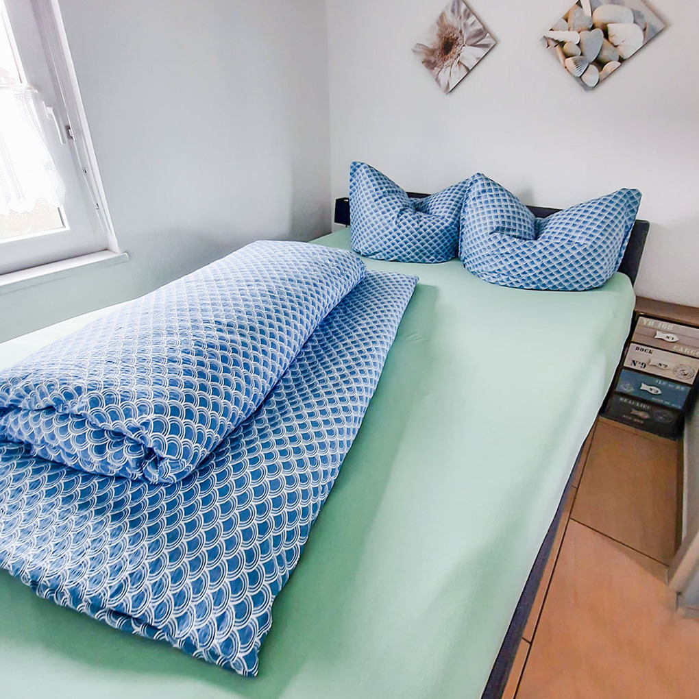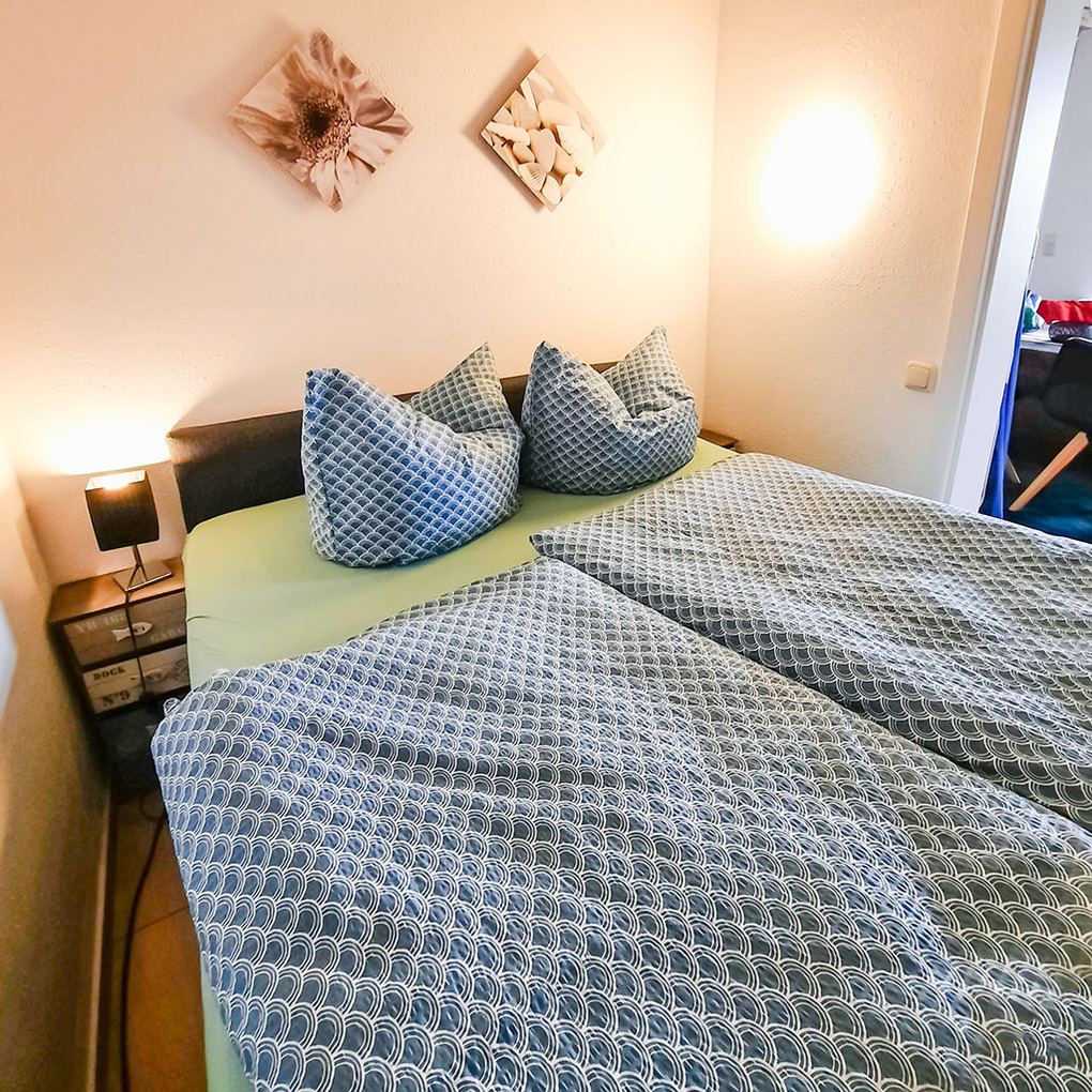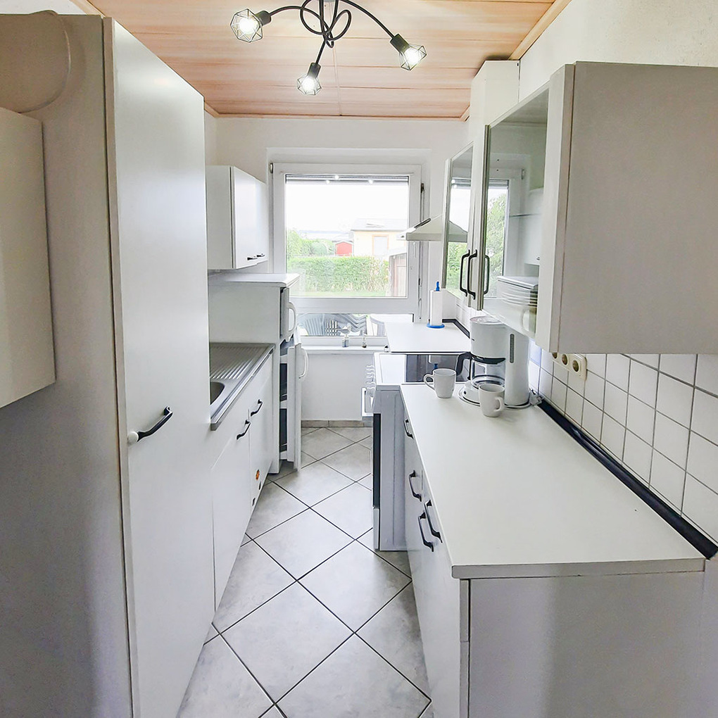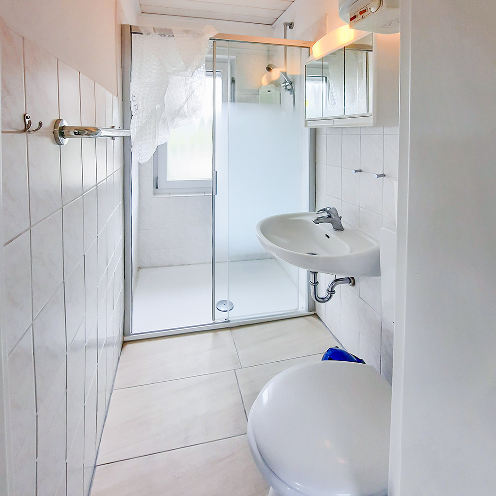 D 47.17 Ferienhaus 1-4 Pers.: 3-Zimmerhaus mit 40 qm Wohnfläche, Parterre. Gemütlicher Wohnraum mit Sitzgruppe, Kaminofen, Sat-TV, Radio/CD, Esstisch. Separate Küche mit Backofen, Mikrowelle, Gefrierschrank. Zwei Doppelzimmer mit franz. Bett. Bad: Dusche, Wb, WC.