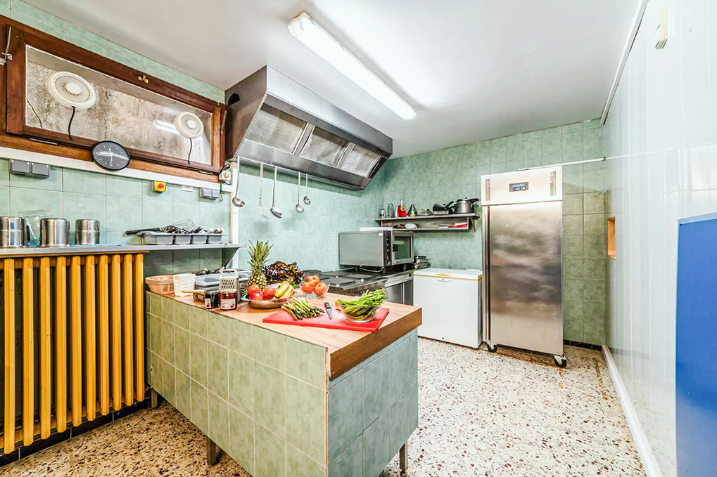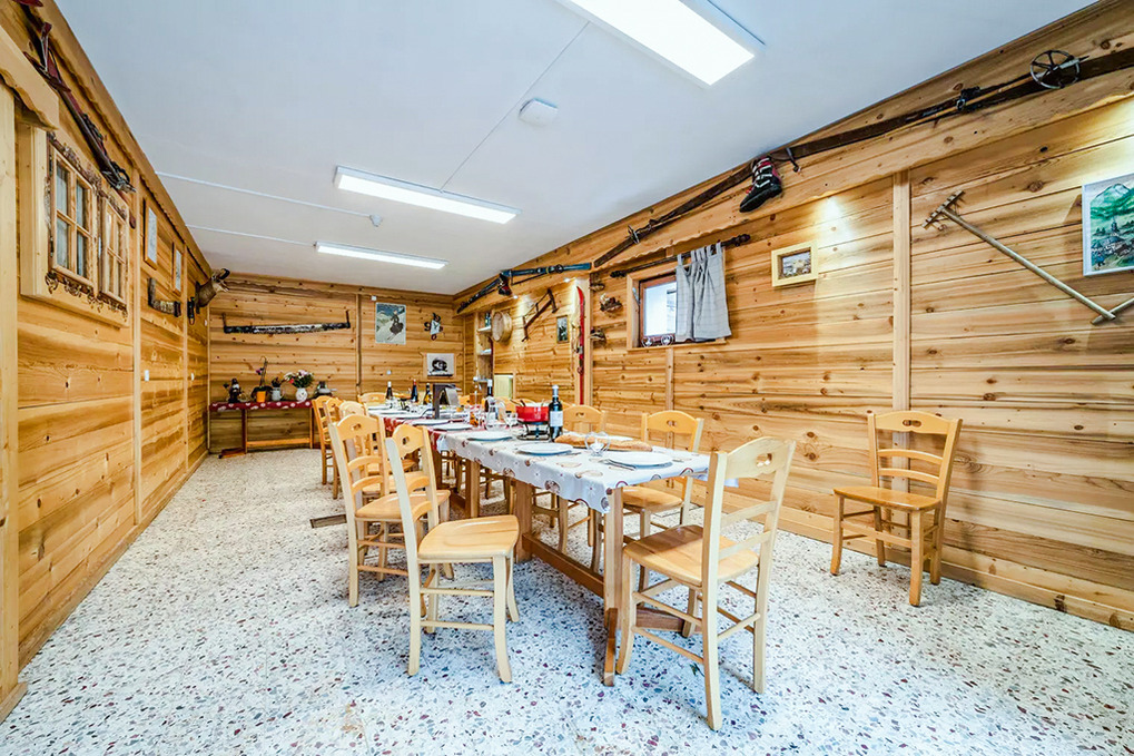 Parterre: Großer Tagesraum mit Esstischen. Gut ausgestattete Gruppenküche mit großem Herd, Konvektomat, Spülmaschine. Spieleraum mit Tischtennis-Platte, Kicker. Wellnessbereich mit Außensauna, großem Whirlpool, Dusche, Wb. Separates WC.