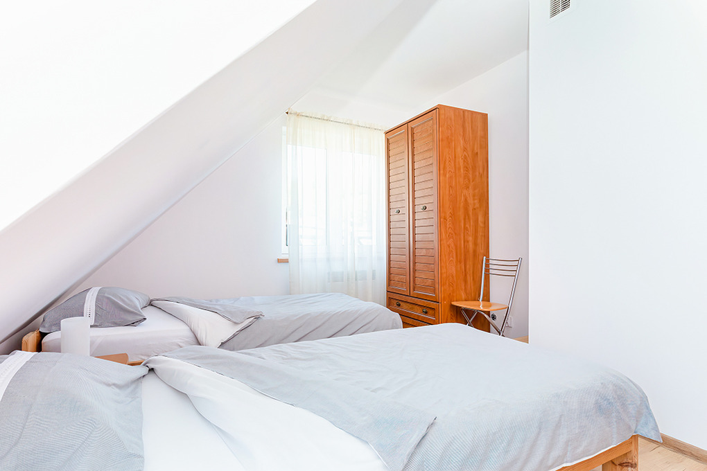 PL 33.1 Ferienhaus 3-6 Pers.: Freundliche 4-Zimmerhaushälfte, ca. 85 qm Wohnfläche über 2 Etagen. Parterre: Großzügiger, lichtdurchfluteter Wohn-/Essraum in offener Bauweise mit Kamin, Sitzecke mit 2 Sofas, 2 Sesseln, Flachbild-Sat-TV (deutsche Programme), Radio-CD Player, Esstisch im schönem, verglastem Erker mit herrlichem Gartenblick. Offene Küche (Backofen, Mikrowelle, Kühlfach (40 l), Spülmaschine). Bad/WC. 1. Etage: 3 Doppelzimmer mit Balkon. Bad/WC.