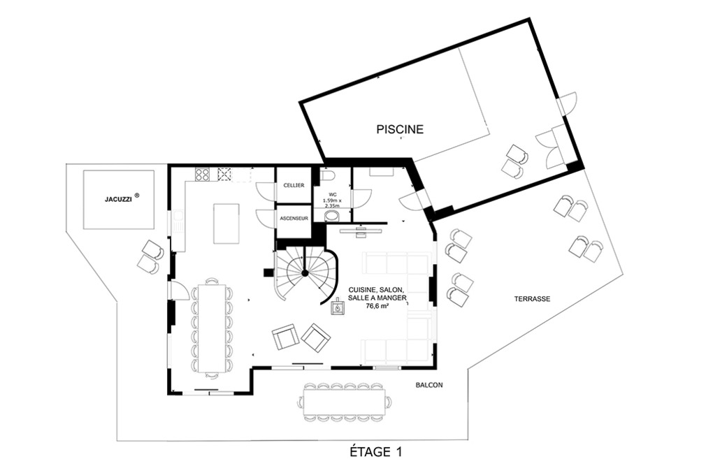 1. Etage: Offener großer Wohn-/Essraum mit gemütlichem Sitzbereich, Kaminofen (Holz wird gestellt), Sat-TV, Essbereich mit großem Esstisch für 14 Personen, moderner, großer, gut ausgestatteter Küchenbereich (Backofen, Mikrowelle, Tiefkühlschrank, Geschirrspüler, Kaffeemaschine, Nespressomaschine,Wasserkocher, Toaster, Raclette-, Fonduegeräte). Separates WC. Zugang zum Poolbereich. Großer Balkon mit Whirpool, Tisch, Sitzmöbeln, Liegen, herrlichem Blick ins Skigebiet.