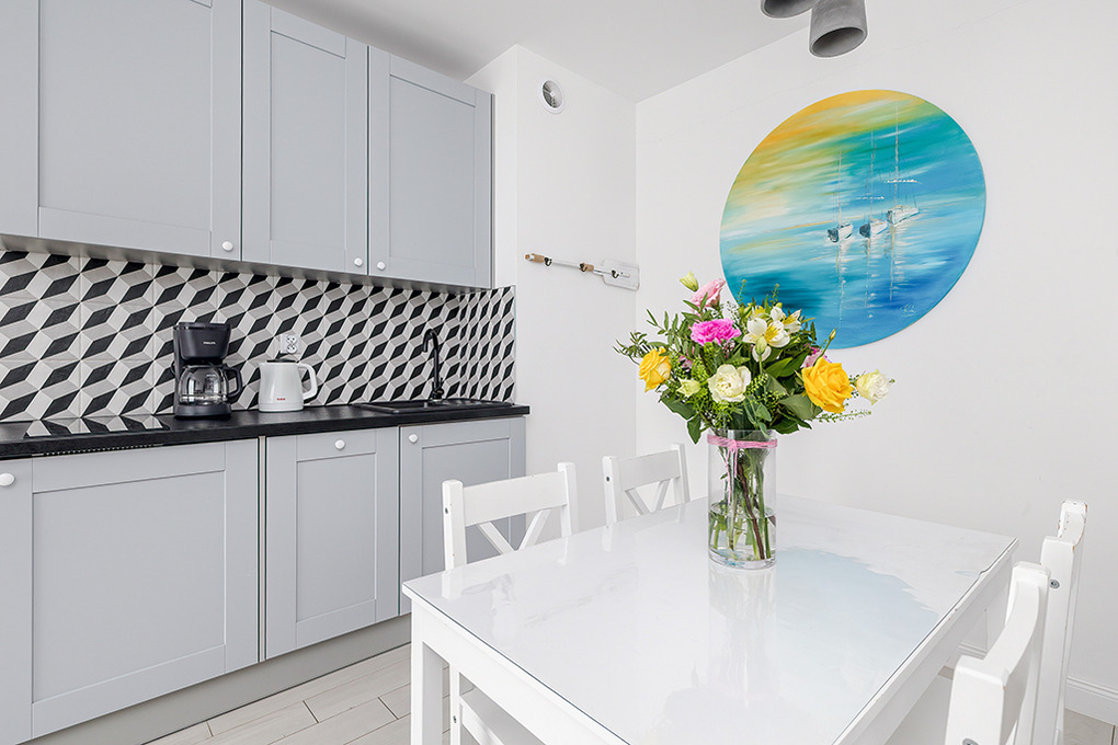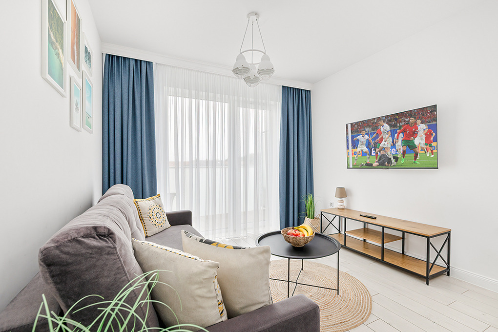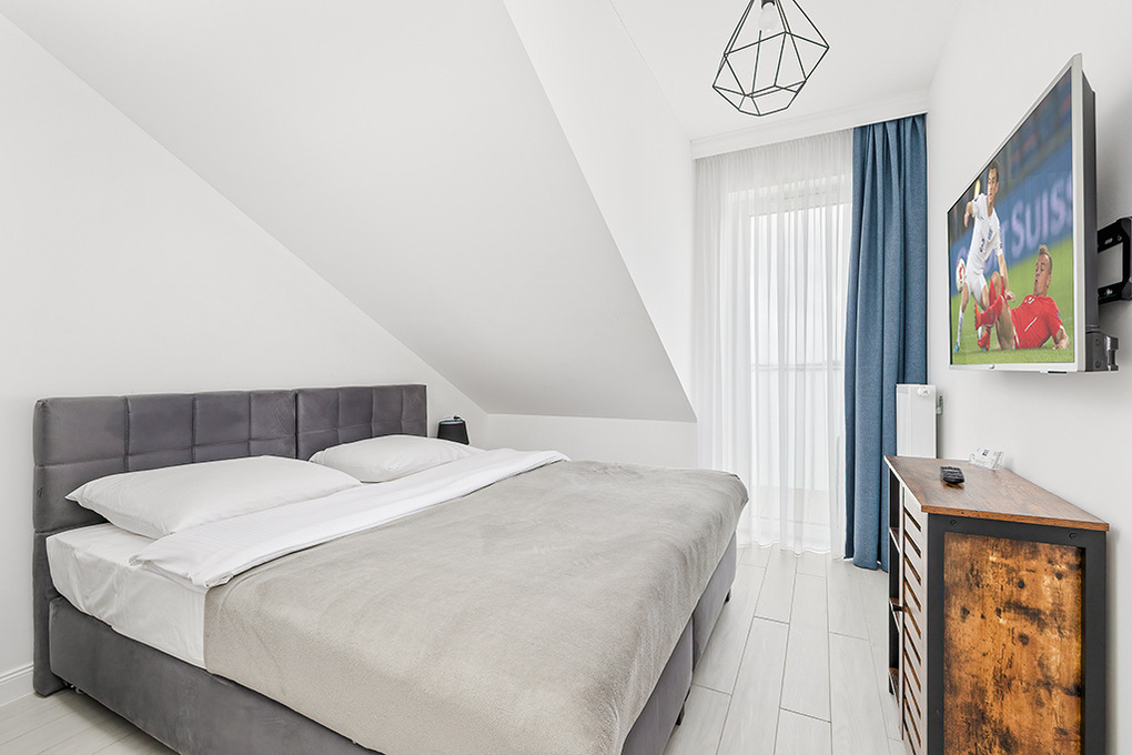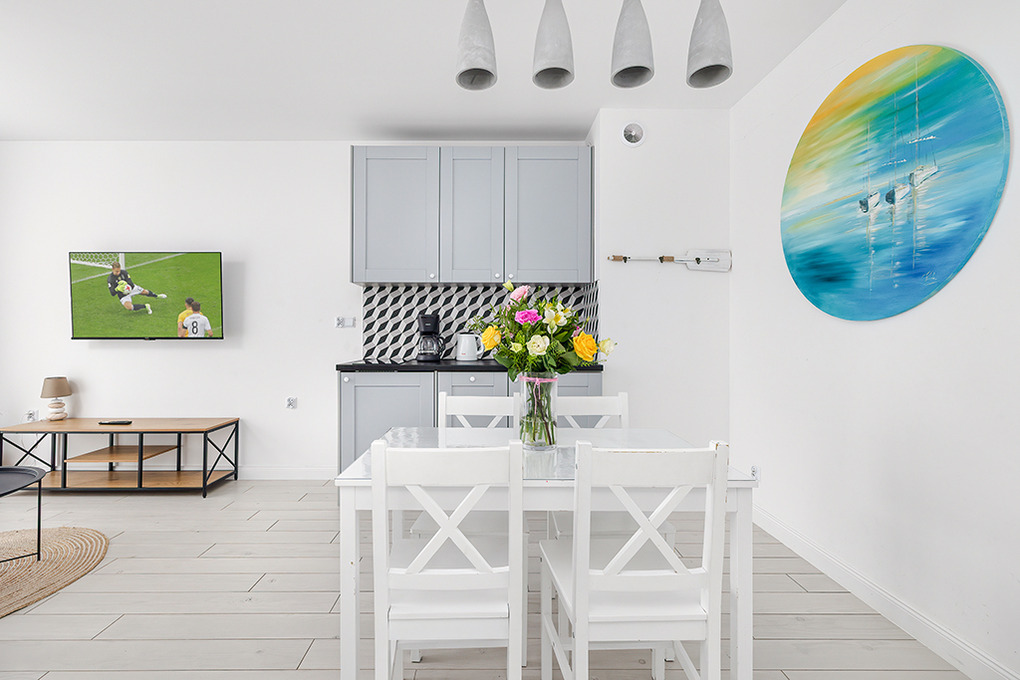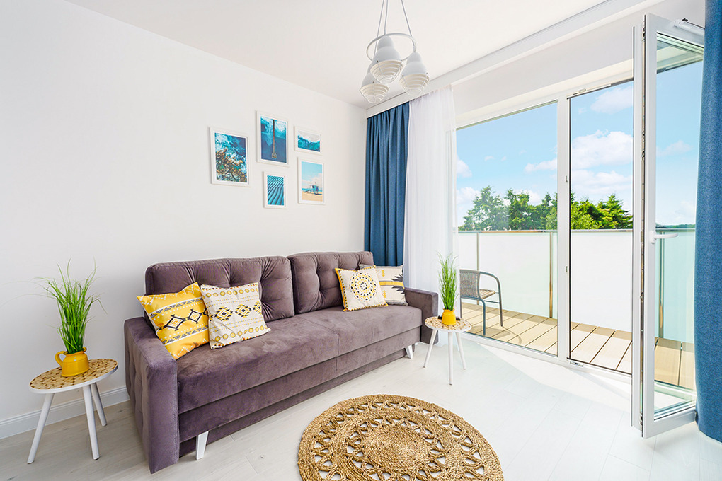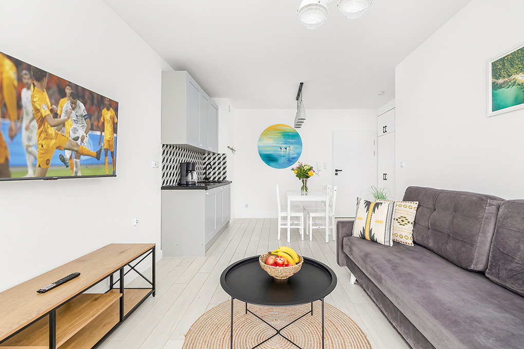 PL 41.22 Wohnung 1-4 Pers.: Niveauvoll eingerichtete 2-Zimmerwohnung mit 39 qm Wohnfläche, 2. Etage. Schöner, heller Wohn-/Essraum mit bodentiefer Fensterfront, Klappcouch (Schlafsofa 2 Pers.), SMART-TV, Esstisch, Küchenzeile (2 Pl.-Induktionsfeld, Spülmaschine). Doppelzimmer. Bad/WC. Balkon mit Sitzmöbeln.