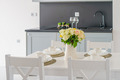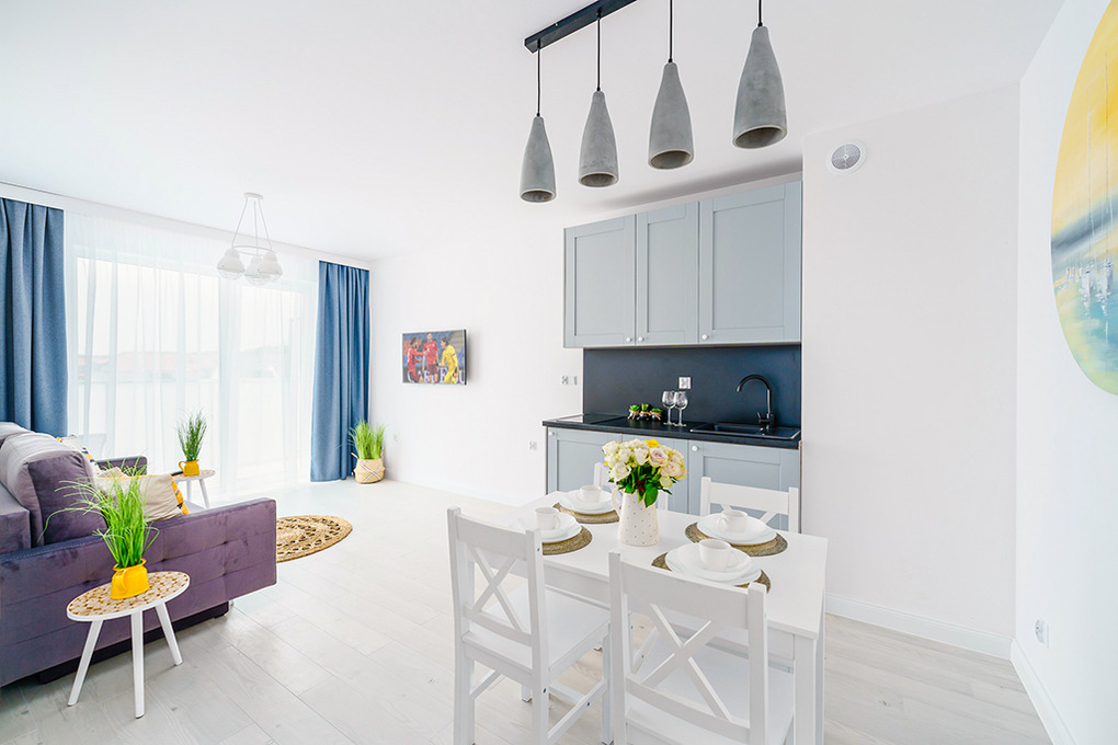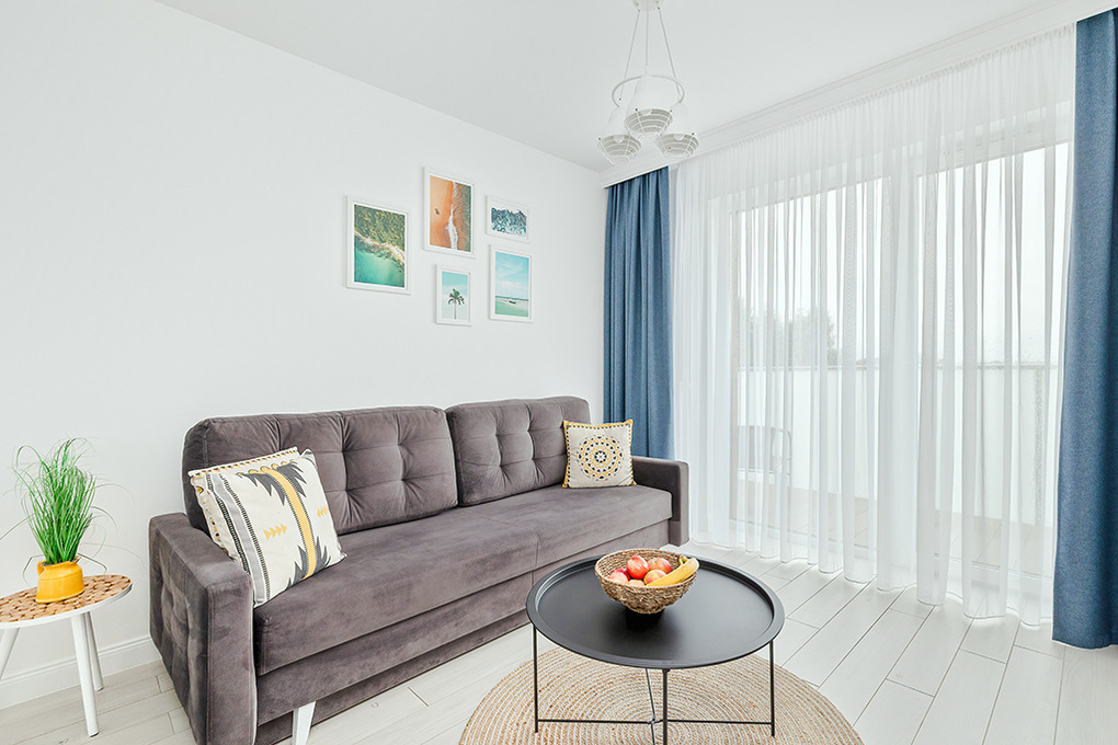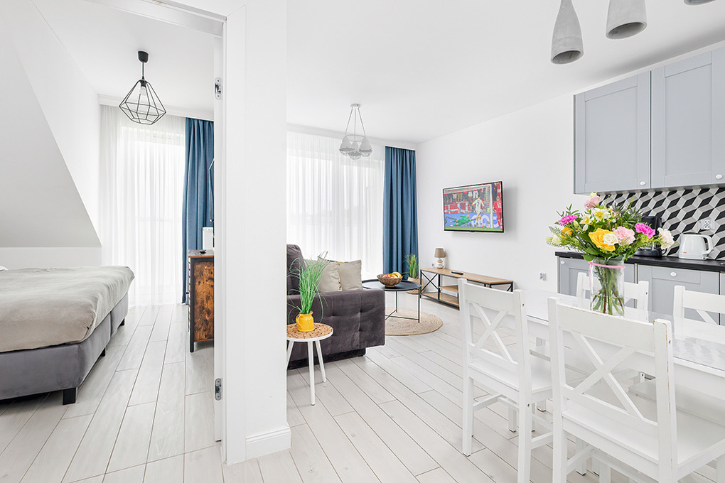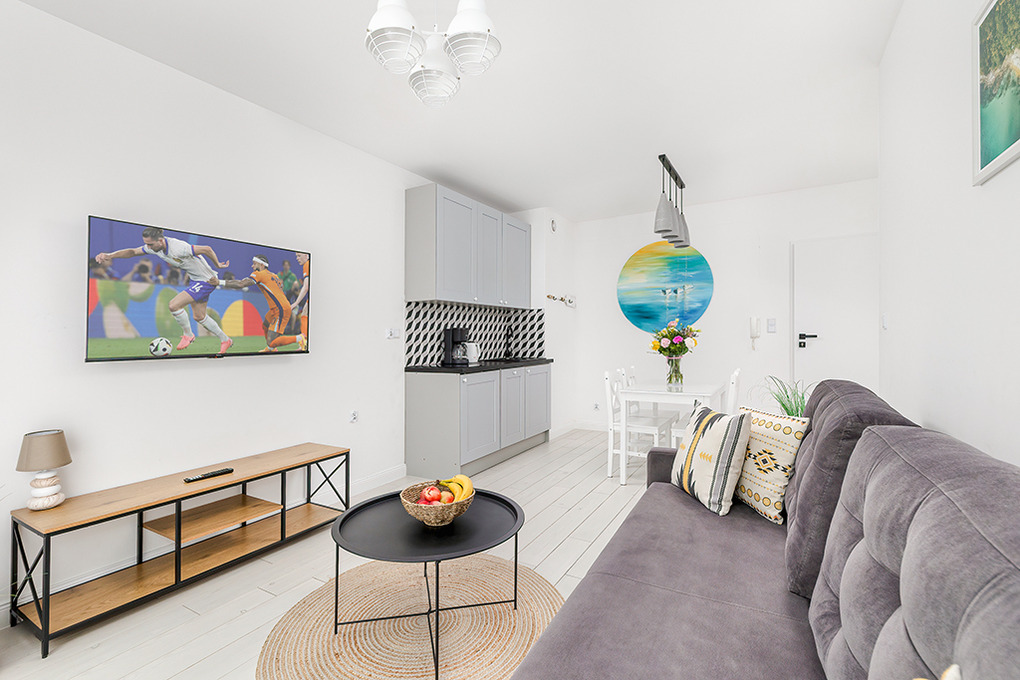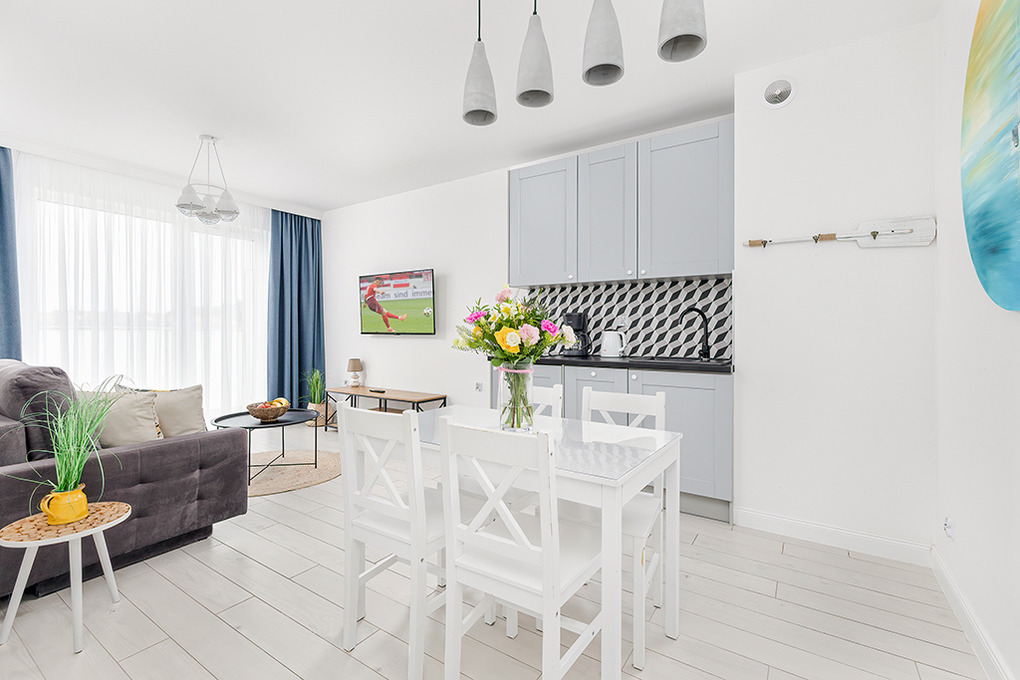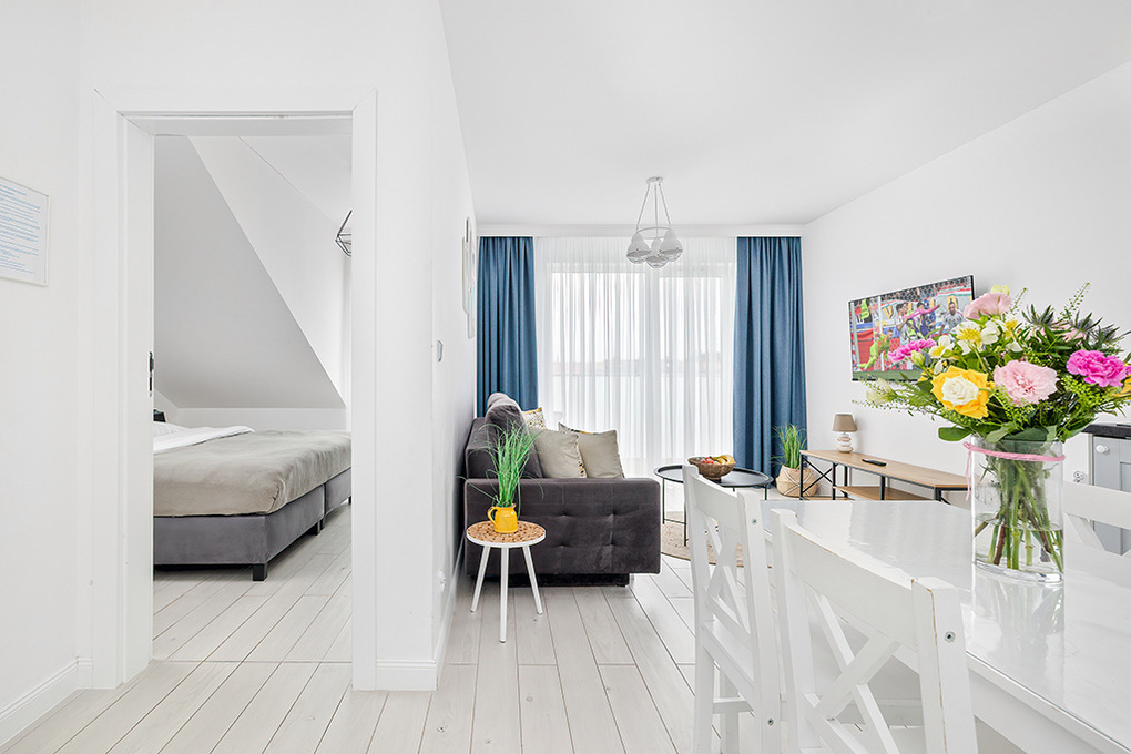 PL 41.22 Wohnung 1-4 Pers.: Niveauvoll eingerichtete 2-Zimmerwohnung mit 39 qm Wohnfläche, 2. Etage. Schöner, heller Wohn-/Essraum mit bodentiefer Fensterfront, Klappcouch (Schlafsofa 2 Pers.), SMART-TV, Esstisch, Küchenzeile (2 Pl.-Induktionsfeld, Spülmaschine). Doppelzimmer. Bad/WC. Balkon mit Sitzmöbeln.