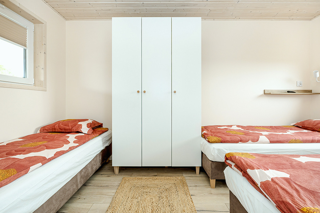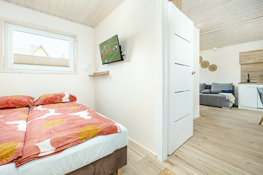 PL 33.10 Ferienhaus 1-5 Pers.: 2 -Zimmer-Ferienhaus mit 45 qm Wohnfläche. Wohn-/Essraum mit Couch (Schlafsofa 2 Pers.), Flachbild Sat-TV mit deutschen Programmen, Esstisch, Küchenzeile (2 Induktionsplatten, Mikrowelle, Spülmaschine). 3-Bettzimmer mit Sat-TV. Modernes Bad: Dusche, Wb, WC. Terrasse mit Sitzmöbeln, Grill, schönem Blick.
