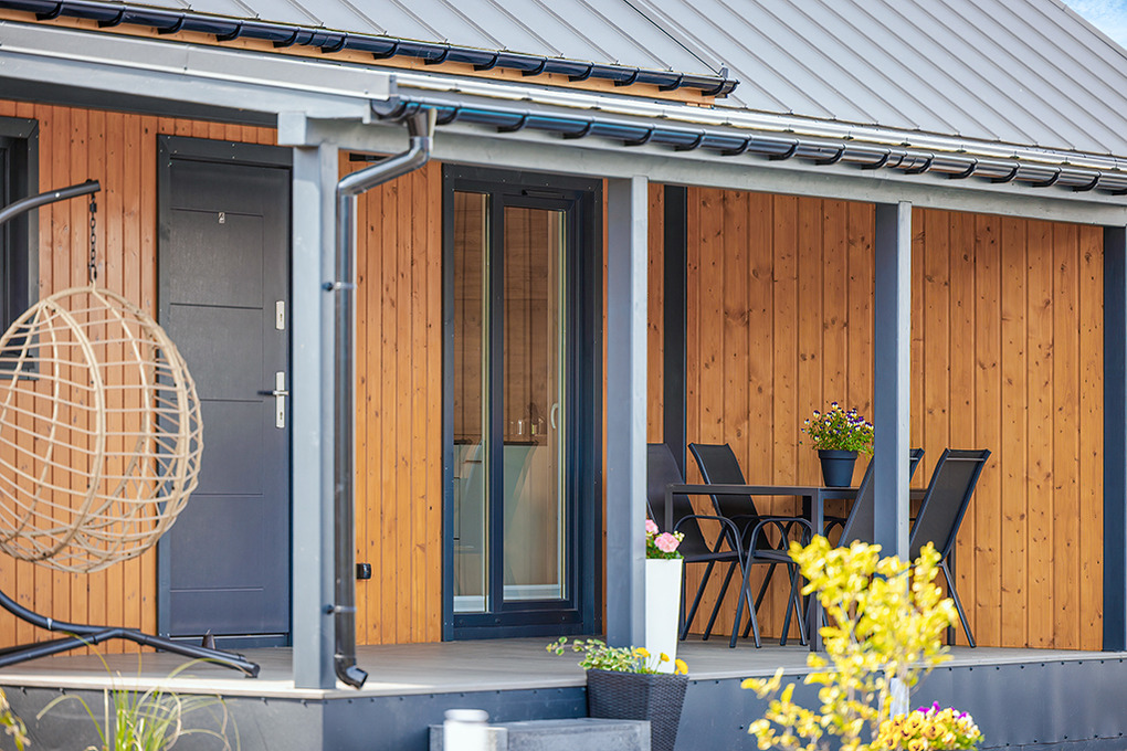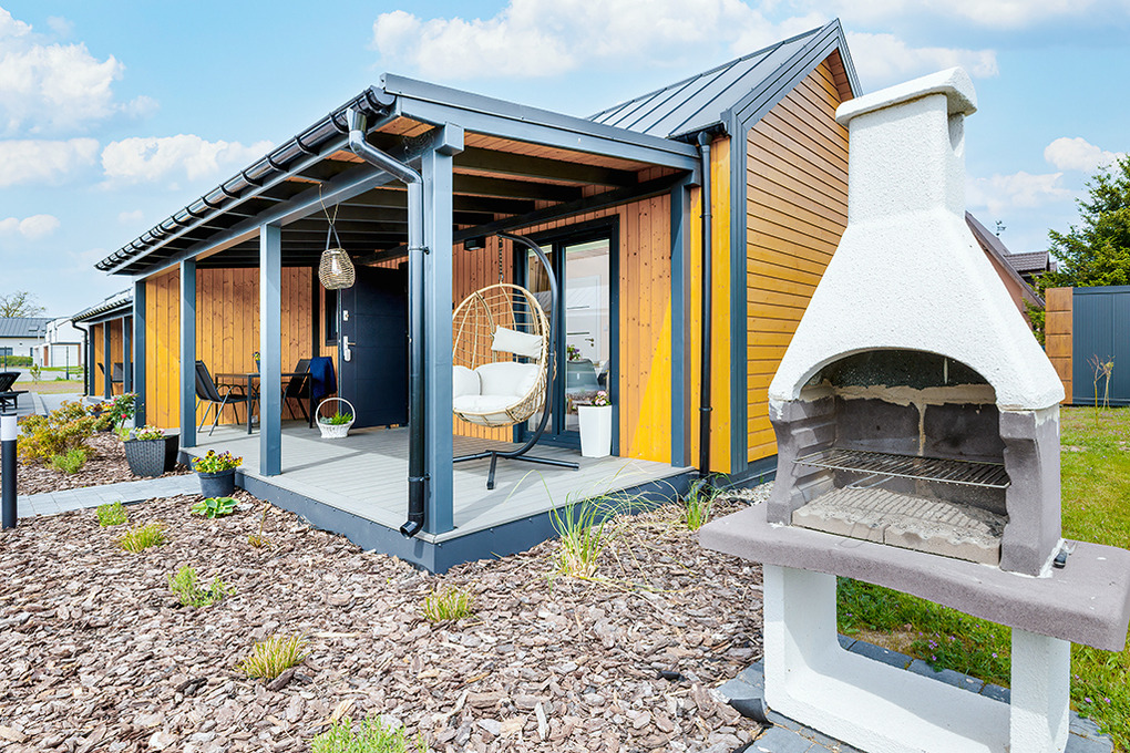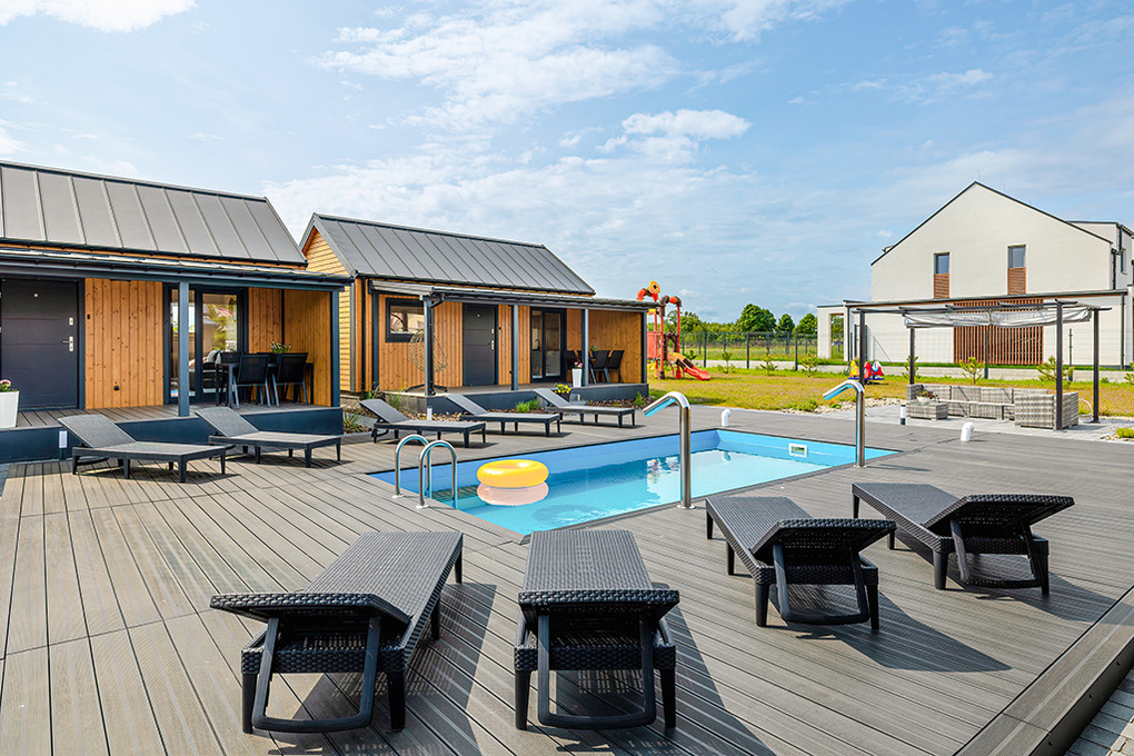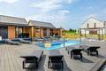 Haus: Gepflegte Ferienhaus-Anlage mit Pool und Rezeption, in 2025 neu erbaut. Holzferienhäuser mit moderner Einrichtung. Kostenloses Internet über WiFi. Heizung über Klima-Anlage und E-Radiator. Warmwasser über E- Boiler (60 l). Terrasse mit Sitzmöbeln, Grill. 1 Pkw-Stellplatz/Haus.