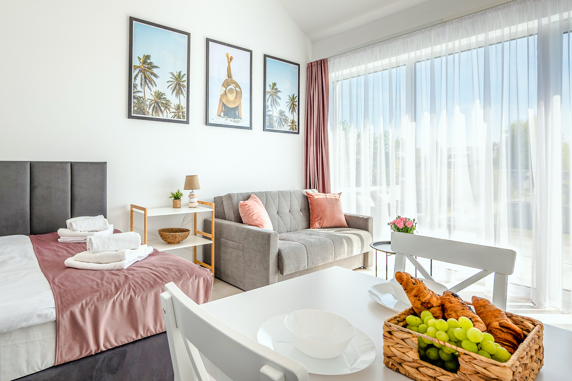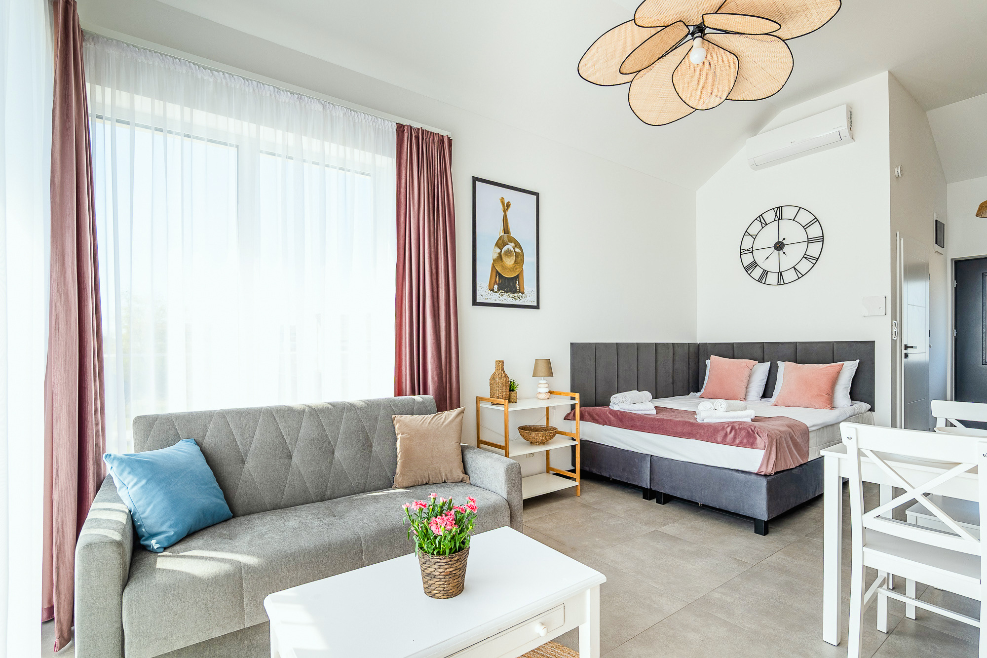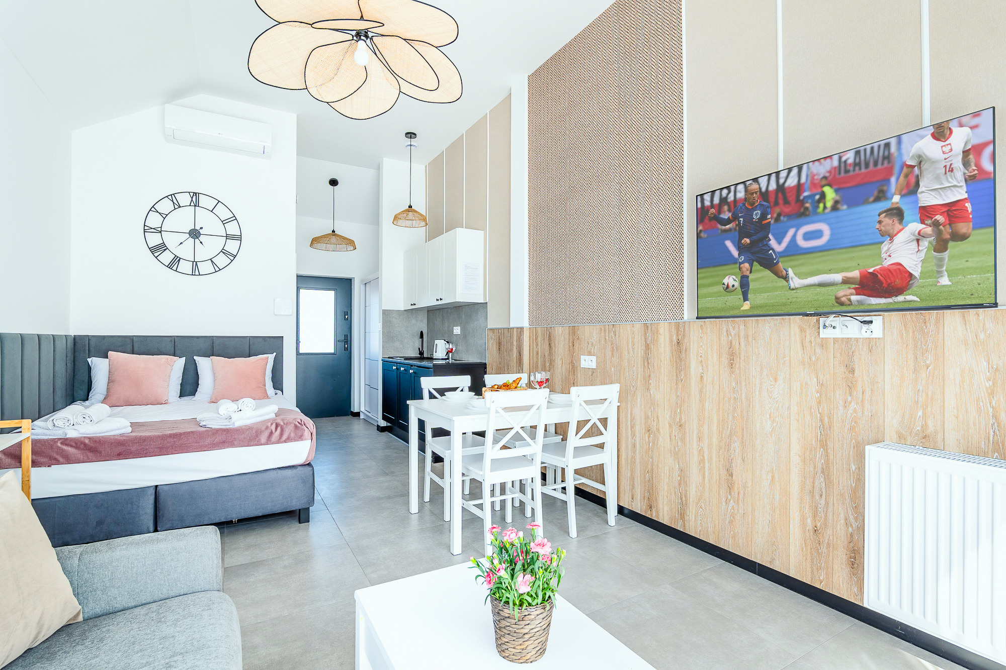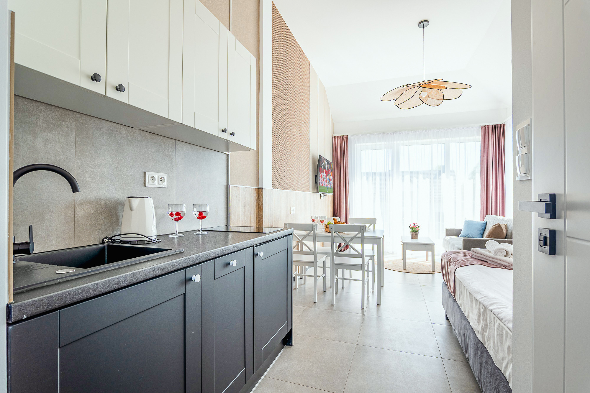 PL 41.24 Wohnung 1-4 Pers.: Niveauvoll eingerichtete 1-Zimmerwohnung mit 28 qm Wohnfläche, 1 Etage. Mit viel Liebe zum Detail möblierter, heller Wohn-/Essraum mit bodentiefer Fensterfront, Doppelbett und Klappcouch (Schlafsofa 2 Pers.), SMART-TV, Esstisch, Küchenzeile (2 Pl.-Induktionsfeld, Spülmaschine). Bad/WC. Balkon mit Sitzmöbeln.