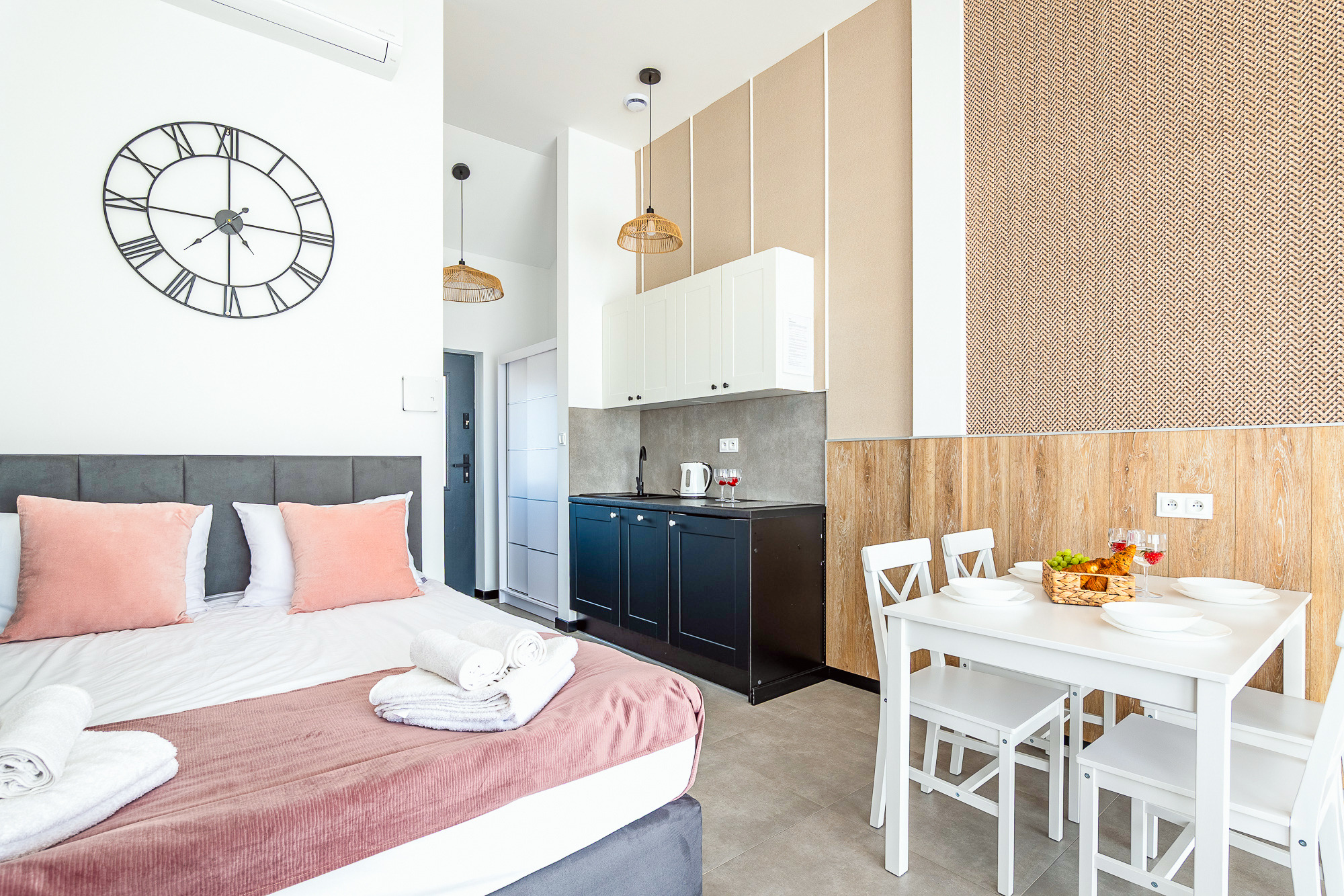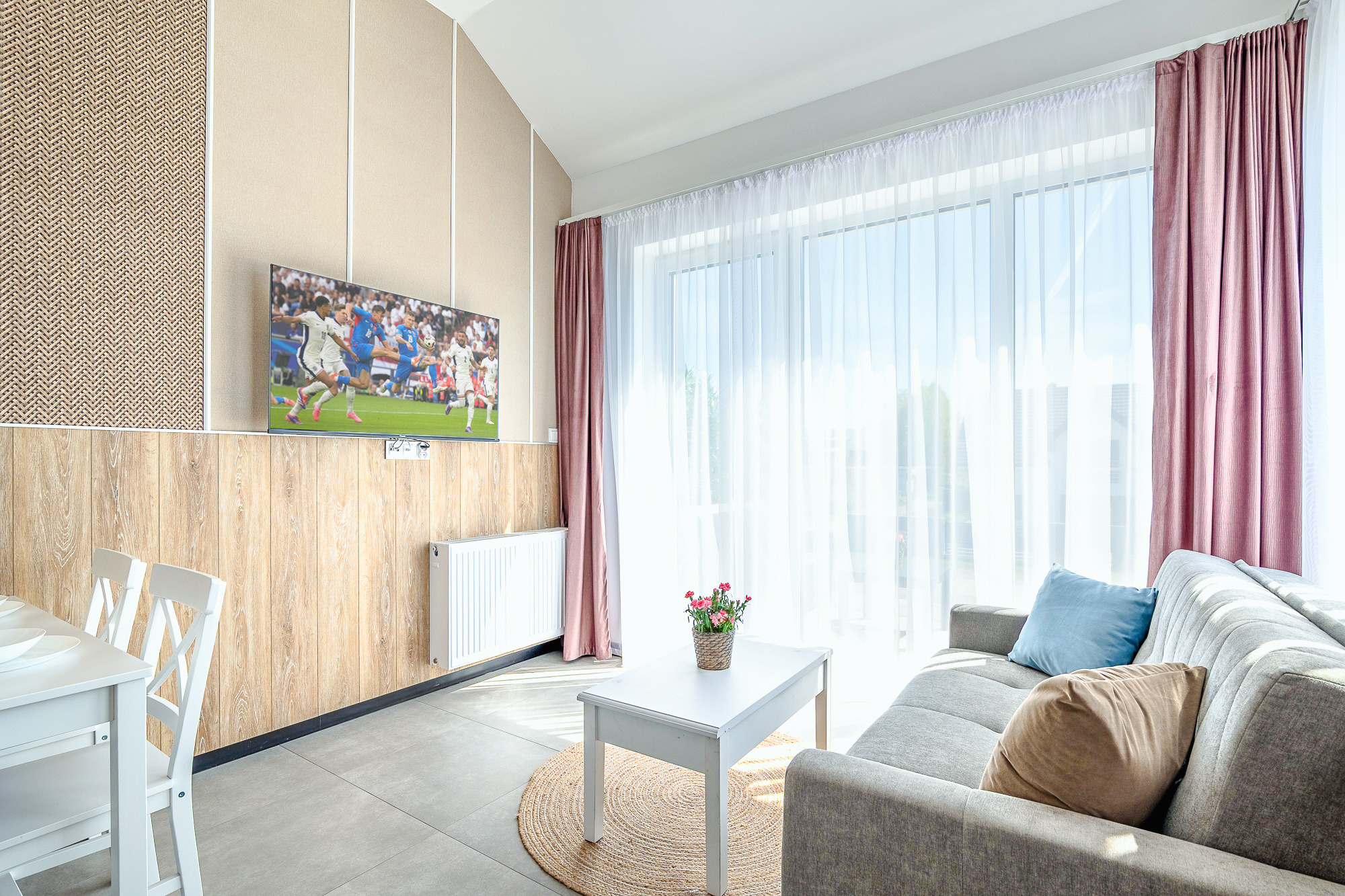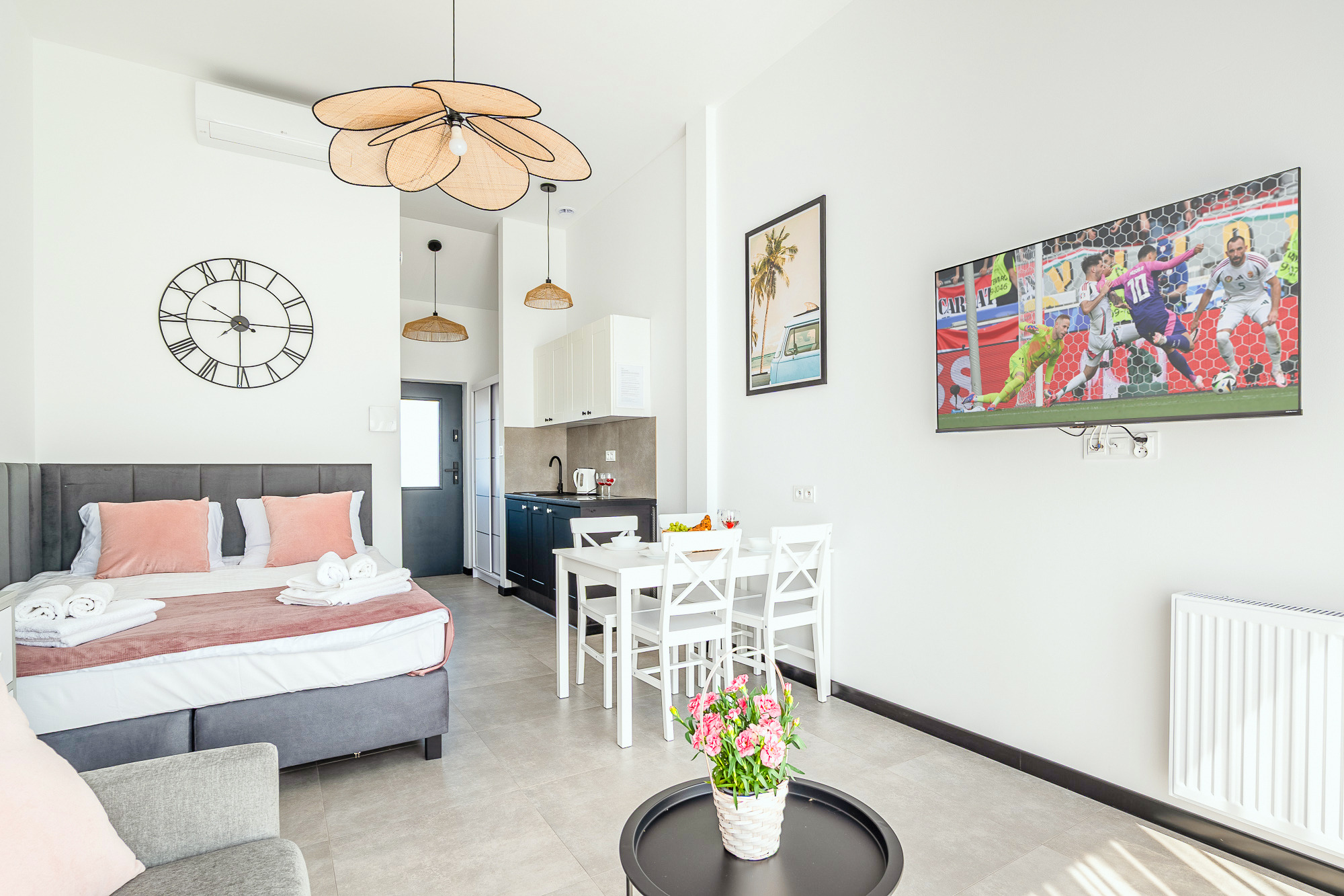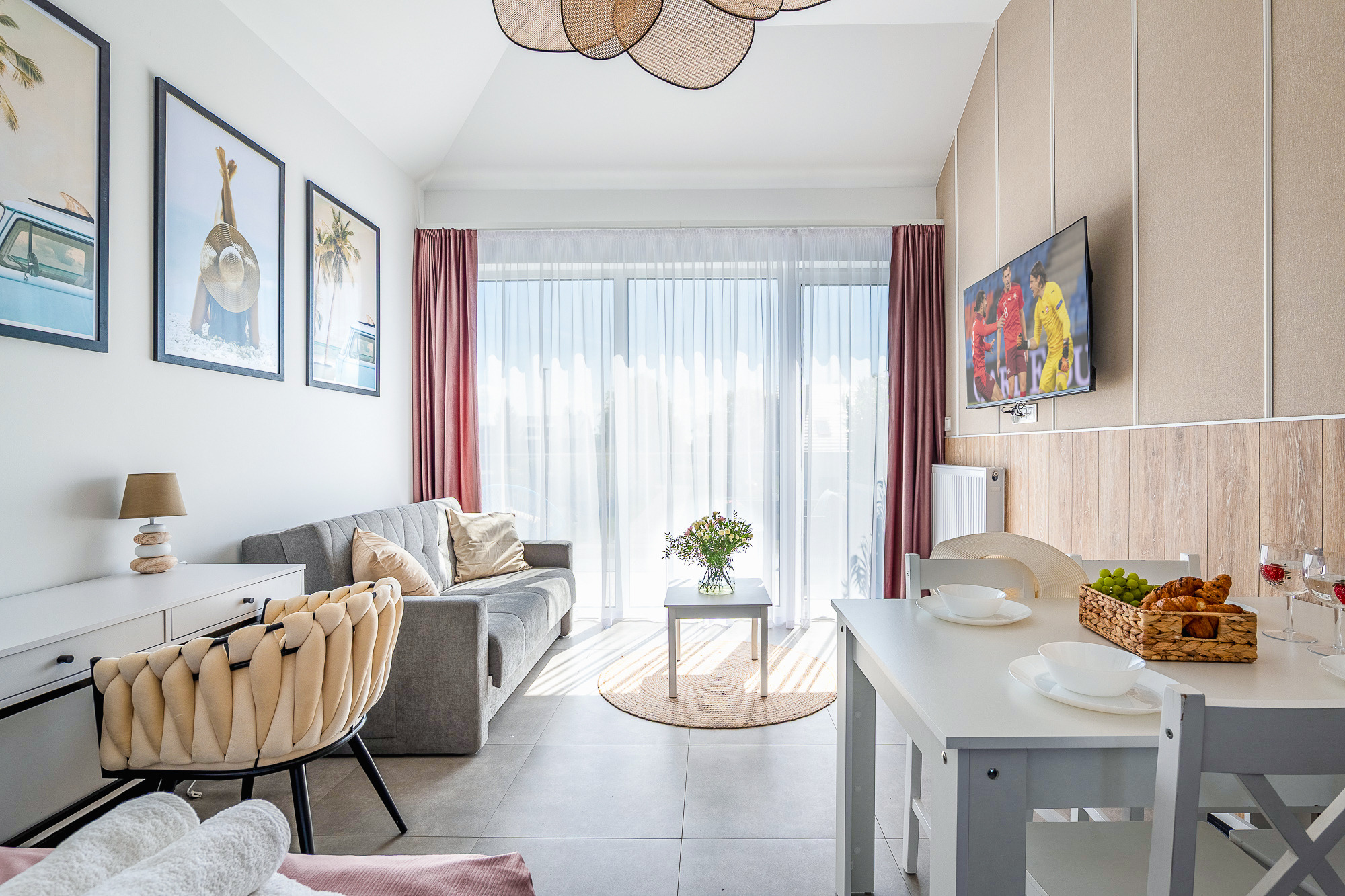 PL 41.24 Wohnung 1-4 Pers.: Niveauvoll eingerichtete 1-Zimmerwohnung mit 28 qm Wohnfläche, 1 Etage. Mit viel Liebe zum Detail möblierter, heller Wohn-/Essraum mit bodentiefer Fensterfront, Doppelbett und Klappcouch (Schlafsofa 2 Pers.), SMART-TV, Esstisch, Küchenzeile (2 Pl.-Induktionsfeld, Spülmaschine). Bad/WC. Balkon mit Sitzmöbeln.