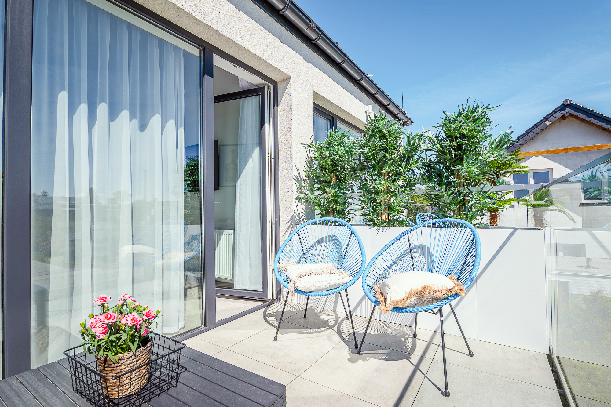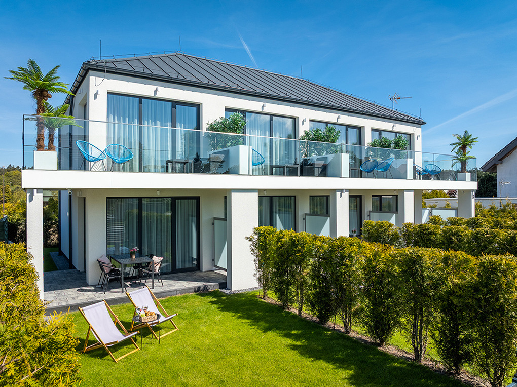 Haus: Modernes Haus mit 8 stilvollen Ferienwohnungen auf gepflegtem Grundstück 2024 neu erbaut. Nichtraucher-Wohnungen. Hochwertige, moderne, geschmackvolle Einrichtung. Kostenloses Internet über W-Lan. Zentralheizung. Klimaanlage. Separater Garten (PL 041.023), bzw Balkon (PL 041.024) mit Sitzmöbeln.1 Pkw-Stellplatz/Fewo am Haus (Gebühr).