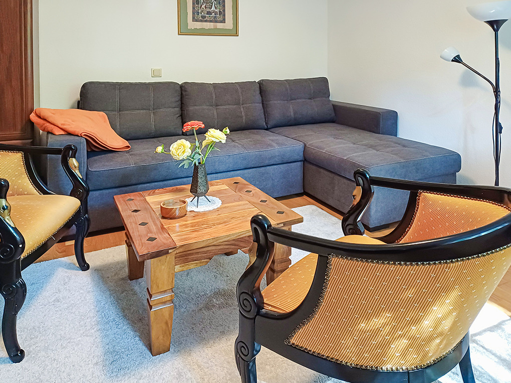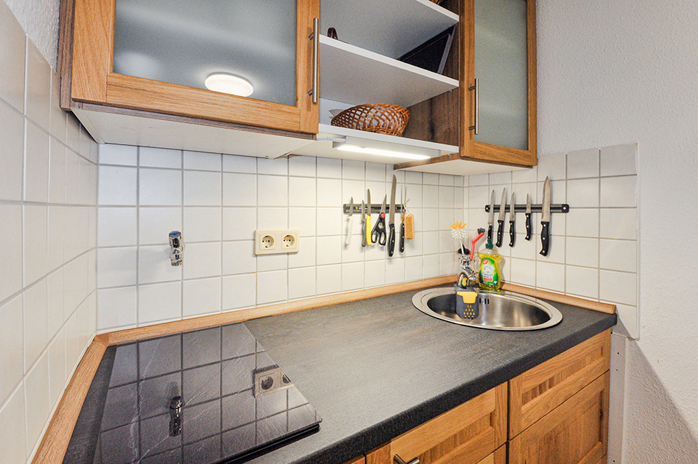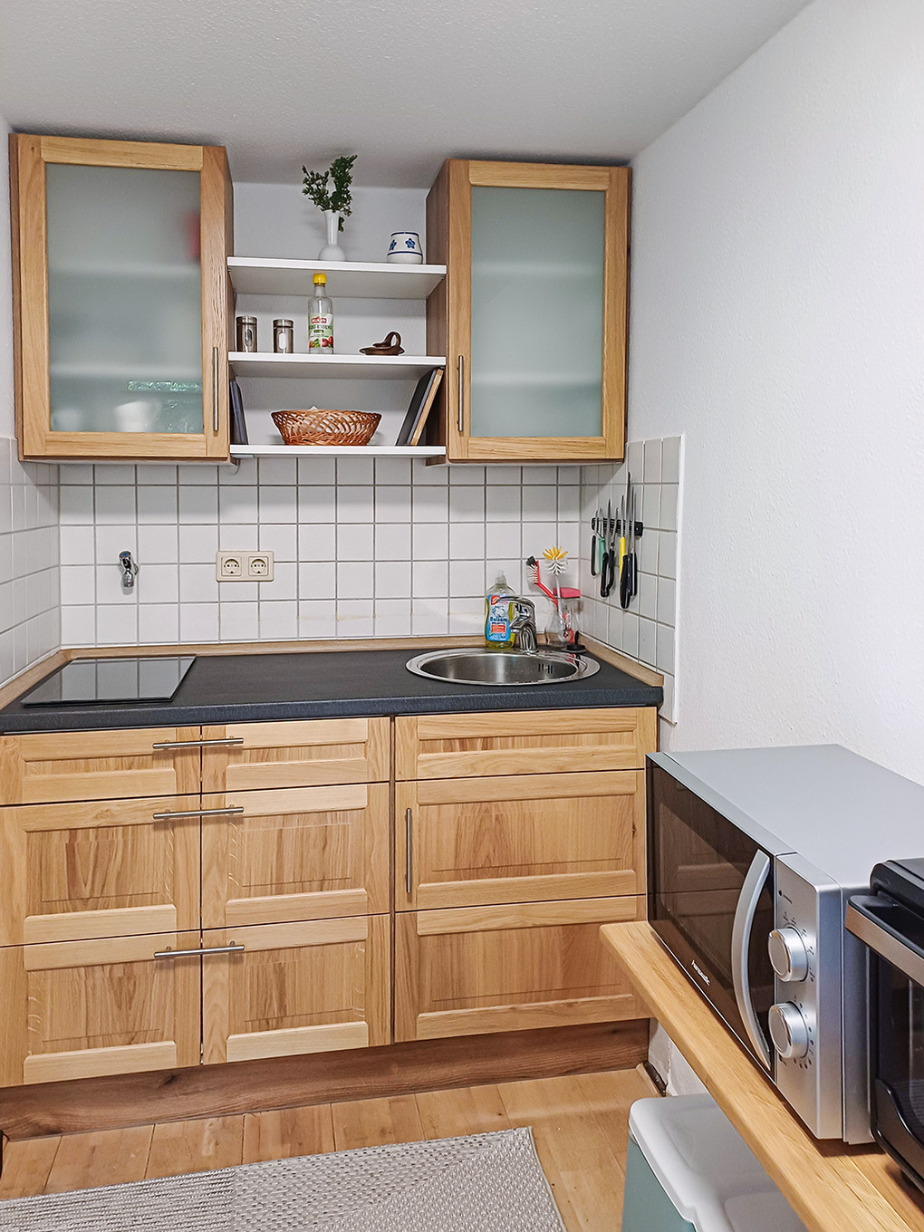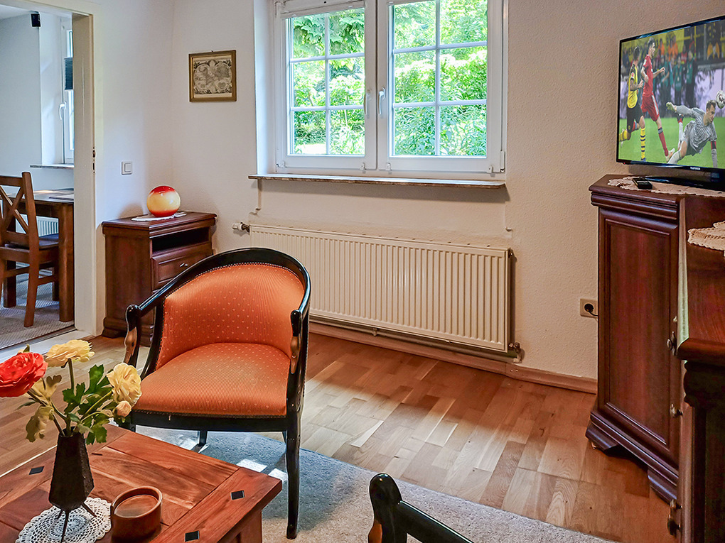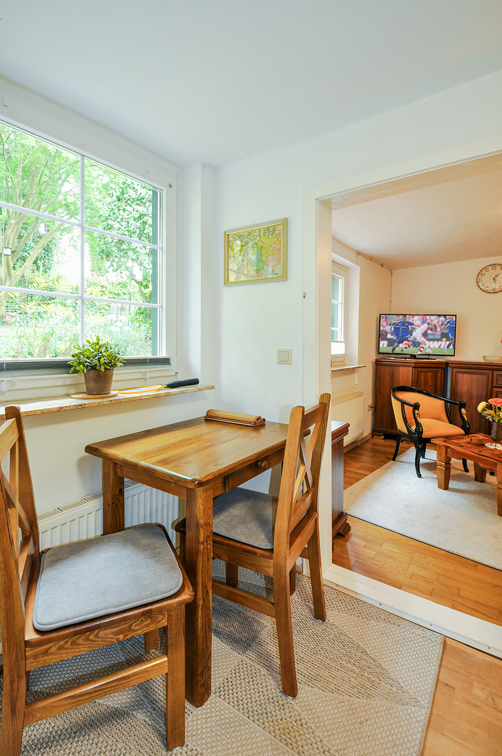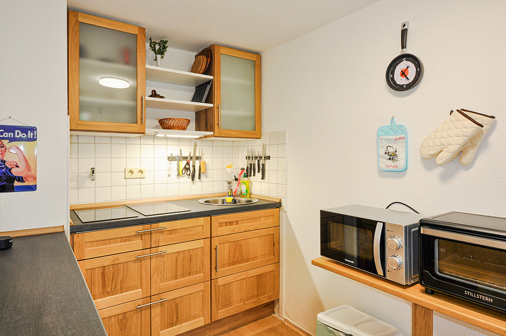 D 45.32 Wohnung 1-2 Pers.: 1 1/2-Zimmerwohnung mit 30 qm Wohnfläche, Parterre. Gemütlicher Wohn-/Schlafraum mit Couchgarnitur (Ausziehcouch 2 Pers.), Flachbild-Smart-TV. Kleine Küche mit Esstisch, Pantry-Küchenzeile (Ceranfeld, kleiner Backofen, Mikrowelle). Bad: Dusche, Wb, WC. Kleine Terrasse mit Sitzmöbeln.