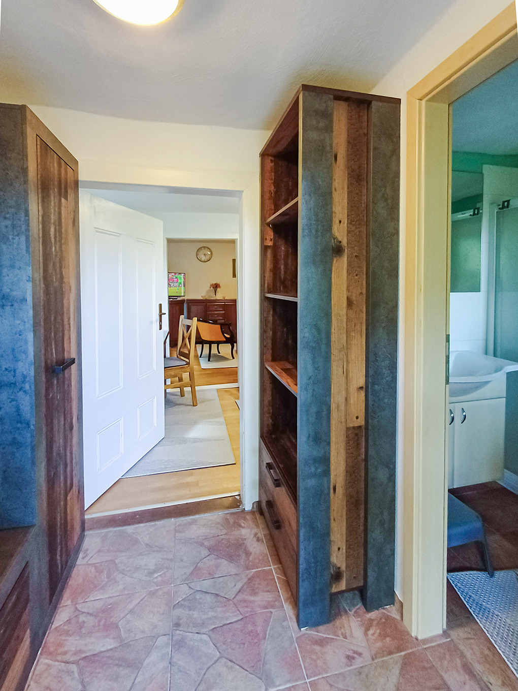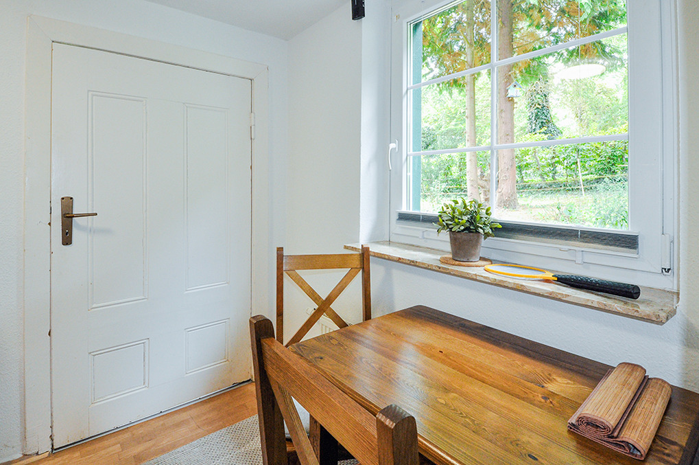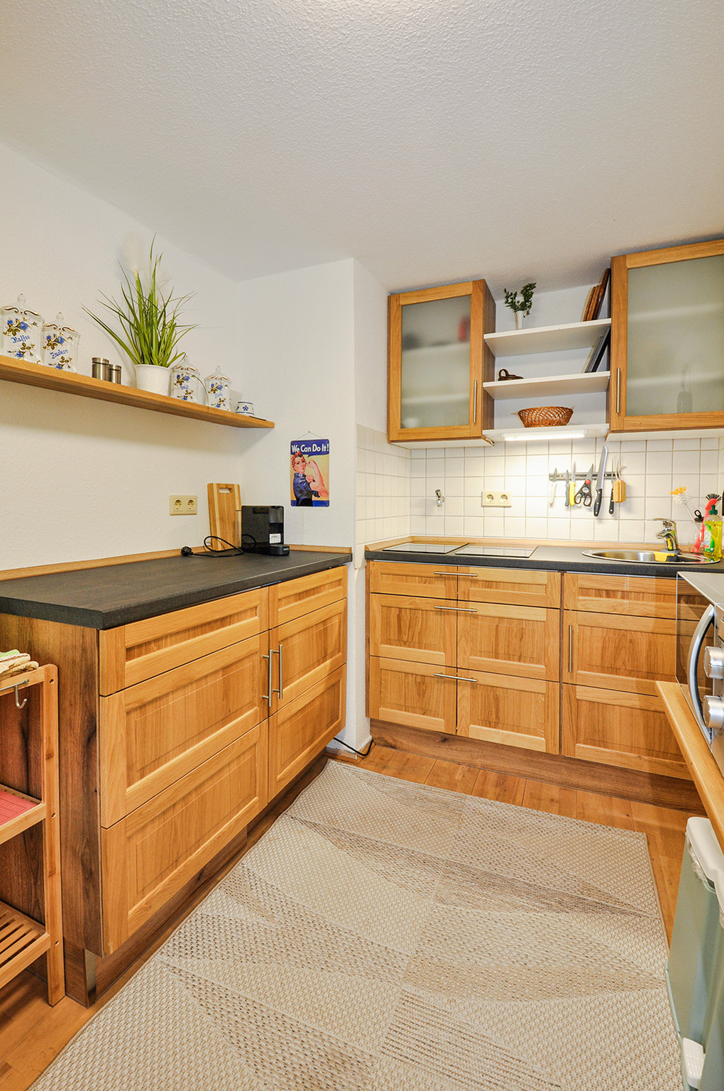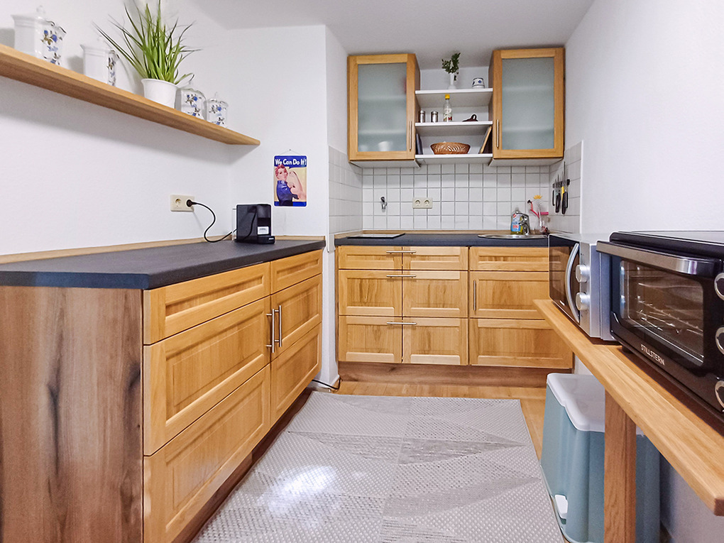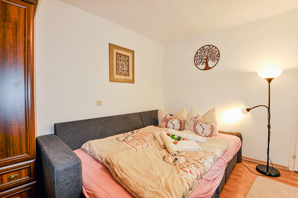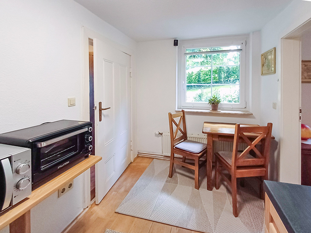 D 45.32 Wohnung 1-2 Pers.: 1 1/2-Zimmerwohnung mit 30 qm Wohnfläche, Parterre. Gemütlicher Wohn-/Schlafraum mit Couchgarnitur (Ausziehcouch 2 Pers.), Flachbild-Smart-TV. Kleine Küche mit Esstisch, Pantry-Küchenzeile (Ceranfeld, kleiner Backofen, Mikrowelle). Bad: Dusche, Wb, WC. Kleine Terrasse mit Sitzmöbeln.